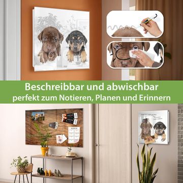Bringe Ordnung und Eleganz in deinen Eingangsbereich mit dem banjado Schlüsselkasten Motiv Motiv Puppies. Die moderne Schlüsselbox kombiniert funktionales Design mit hochwertiger Verarbeitung und wird so zu einem echten Hingucker in Flur, Büro oder Ferienwohnung. ✅ Stilvolle Schlüsselaufbewahrung mit Glasfront im Motiv Motiv Puppies Der Design-Schlüsselkasten Motiv Motiv Puppies bietet Platz für bis zu 50 Schlüssel, die auf 5 stabilen Reihen mit je 10 Haken übersichtlich verstaut werden. Mit seinen kompakten Maßen von 30 x 30 x 5 cm passt die Schlüsselbox perfekt auch in kleinere Räume. Der weiß lackierte Stahlkorpus mit rechts angeschlagenem Türscharnier harmoniert mit der Glasfront und fügt sich nahtlos in jedes Wohnambiente ein. Ob als Schlüsselorganizer für Zuhause oder als praktische Lösung für Büros, Praxen und Gewerbe, der banjado Schlüsselkasten sorgt für Ordnung und Übersicht. Dank der magnetischen, mit Kreidestiften beschreibbaren Glasfront kannst du Notizen anheften oder Termine direkt auf der Oberfläche festhalten. Die Schlüsselbox Motiv Motiv Puppies zur Wandmontage wird inklusive Befestigungsmaterial geliefert und ist schnell angebracht. So hast du deine Schlüssel jederzeit griffbereit und zugleich stilvoll verstaut. Mit diesem banjado Schlüsselkasten Motiv Motiv Puppies kombinierst du praktische Aufbewahrung mit stilvollem Wohndesign. Ob privat oder geschäftlich, die Schlüsselbox sorgt für mehr Ordnung, Übersicht und ein wohnliches Ambiente.Vorteile im Überblick