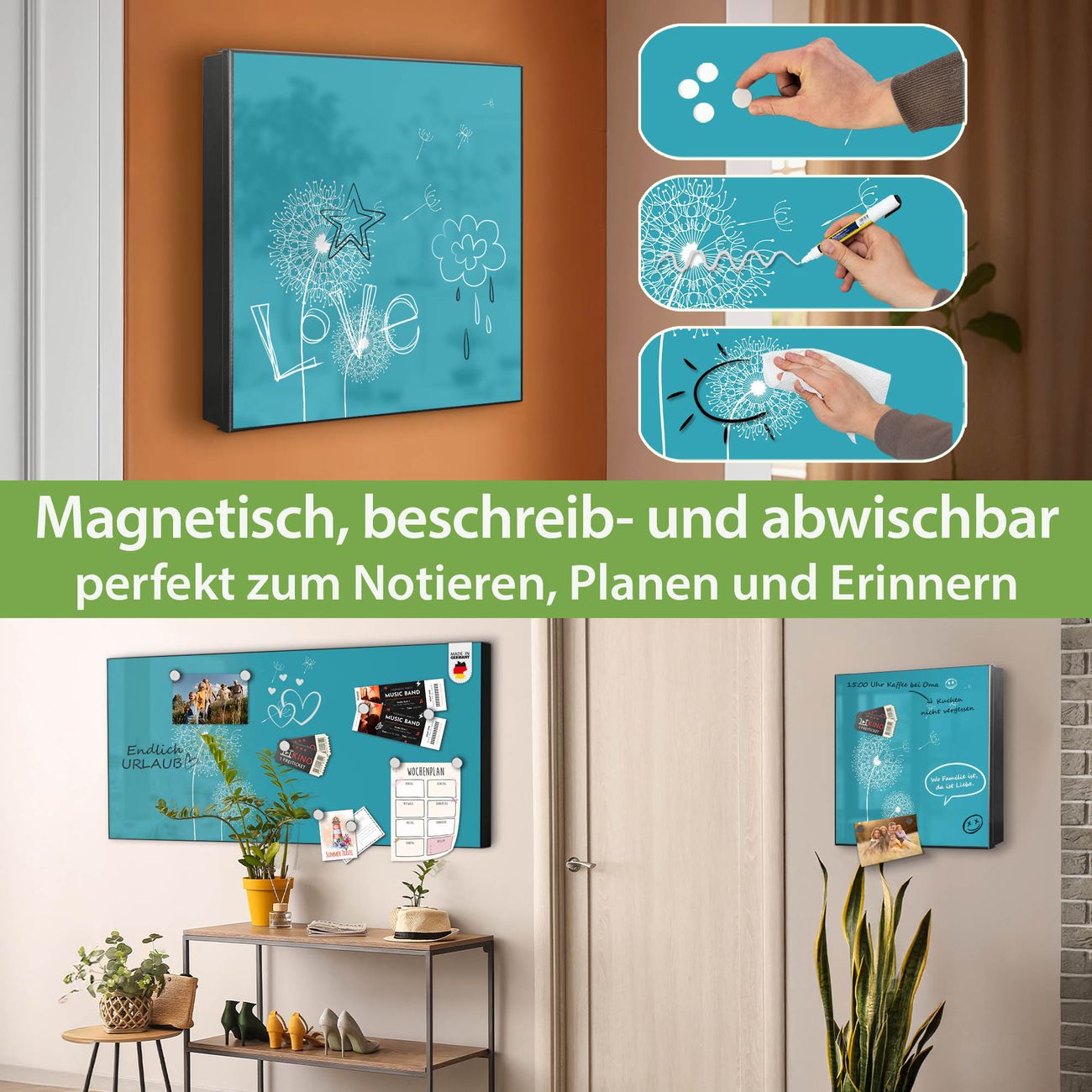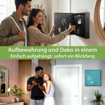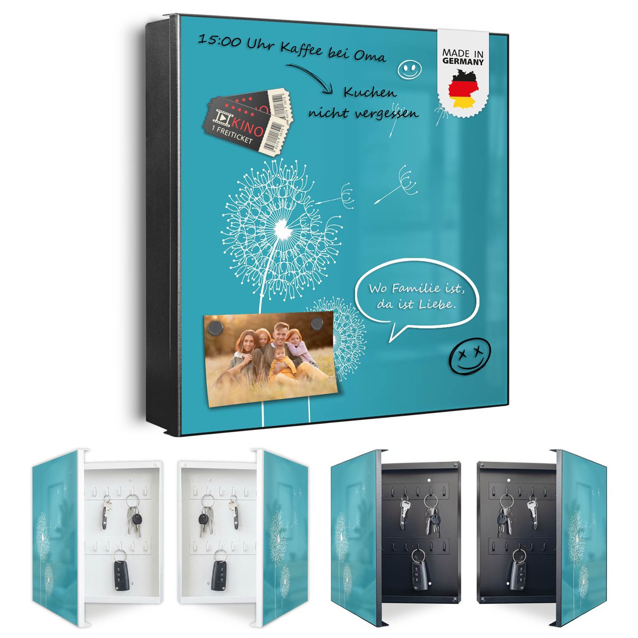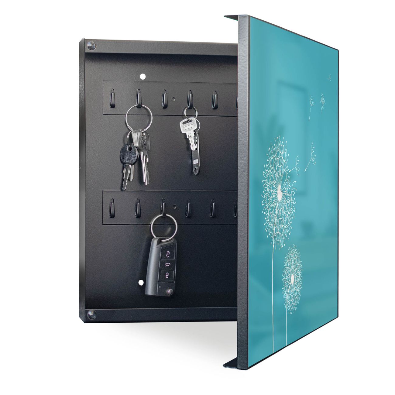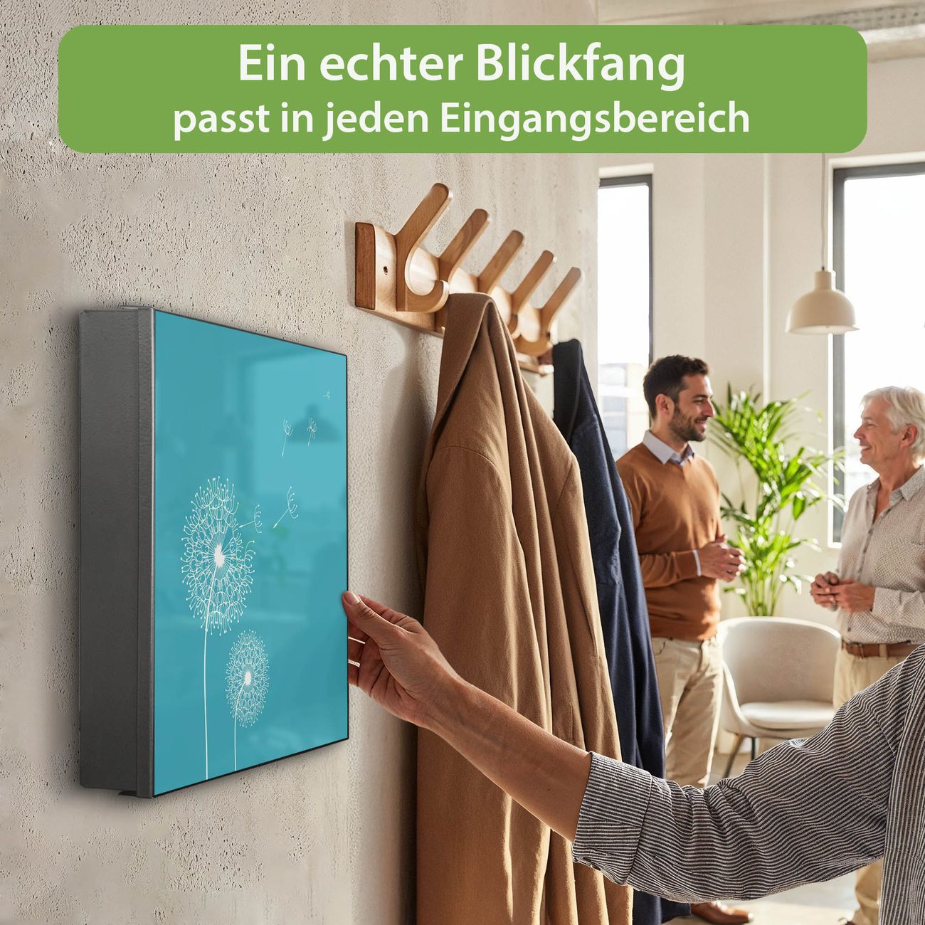 Bringe Ordnung und Eleganz in deinen Eingangsbereich mit dem banjado Schlüsselkasten Motiv Motiv Pusteblume 4. Die moderne Schlüsselbox kombiniert funktionales Design mit hochwertiger Verarbeitung und wird so zu einem echten Hingucker in Flur, Büro oder Ferienwohnung. ✅ Stilvolle Schlüsselaufbewahrung mit Motiv Motiv Pusteblume 4 Der Design-Schlüsselkasten Motiv Motiv Pusteblume 4 bietet Platz für bis zu 32 Schlüssel, die auf 4 stabilen Reihen mit je 8 Haken übersichtlich verstaut werden. Mit seinen kompakten Maßen von 30 x 30 x 5 cm passt die Schlüsselbox perfekt auch in kleinere Räume. Der schwarz lackierte Stahlkorpus mit rechts angeschlagenem Türscharnier harmoniert mit gedruckten Folie auf der Front und fügt sich nahtlos in jedes Wohnambiente ein. Ob als Schlüsselorganizer für Zuhause oder als praktische Lösung für Büros, Praxen und Gewerbe, der banjado Schlüsselkasten sorgt für Ordnung und Übersicht. Dank der magnetischen, mit Kreidestiften beschreibbaren Folie auf der Front kannst du Notizen anheften oder Termine direkt auf der Oberfläche festhalten. Die Schlüsselbox Motiv Motiv Pusteblume 4 zur Wandmontage wird inklusive Befestigungsmaterial geliefert und ist schnell angebracht. So hast du deine Schlüssel jederzeit griffbereit und zugleich stilvoll verstaut. Mit diesem banjado Schlüsselkasten Motiv Motiv Pusteblume 4 kombinierst du praktische Aufbewahrung mit stilvollem Wohndesign. Ob privat oder geschäftlich, die Schlüsselbox sorgt für mehr Ordnung, Übersicht und ein wohnliches Ambiente.Vorteile im Überblick