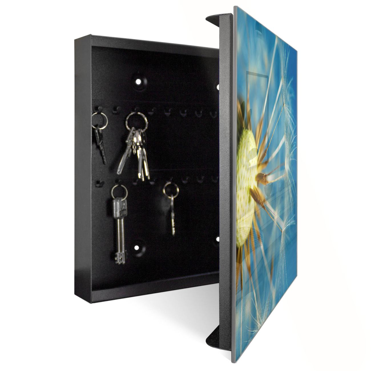 Bringe Ordnung und Eleganz in deinen Eingangsbereich mit dem banjado Schlüsselkasten Motiv Motiv Pusteblume Detail. Die moderne Schlüsselbox kombiniert funktionales Design mit hochwertiger Verarbeitung und wird so zu einem echten Hingucker in Flur, Büro oder Ferienwohnung. ✅ Stilvolle Schlüsselaufbewahrung mit Glasfront im Motiv Motiv Pusteblume Detail Der Design-Schlüsselkasten Motiv Motiv Pusteblume Detail bietet Platz für bis zu 50 Schlüssel, die auf 5 stabilen Reihen mit je 10 Haken übersichtlich verstaut werden. Mit seinen kompakten Maßen von 30 x 30 x 5 cm passt die Schlüsselbox perfekt auch in kleinere Räume. Der schwarz lackierte Stahlkorpus mit rechts angeschlagenem Türscharnier harmoniert mit der Glasfront und fügt sich nahtlos in jedes Wohnambiente ein. Ob als Schlüsselorganizer für Zuhause oder als praktische Lösung für Büros, Praxen und Gewerbe, der banjado Schlüsselkasten sorgt für Ordnung und Übersicht. Dank der magnetischen, mit Kreidestiften beschreibbaren Glasfront kannst du Notizen anheften oder Termine direkt auf der Oberfläche festhalten. Die Schlüsselbox Motiv Motiv Pusteblume Detail zur Wandmontage wird inklusive Befestigungsmaterial geliefert und ist schnell angebracht. So hast du deine Schlüssel jederzeit griffbereit und zugleich stilvoll verstaut. Mit diesem banjado Schlüsselkasten Motiv Motiv Pusteblume Detail kombinierst du praktische Aufbewahrung mit stilvollem Wohndesign. Ob privat oder geschäftlich, die Schlüsselbox sorgt für mehr Ordnung, Übersicht und ein wohnliches Ambiente.Vorteile im Überblick