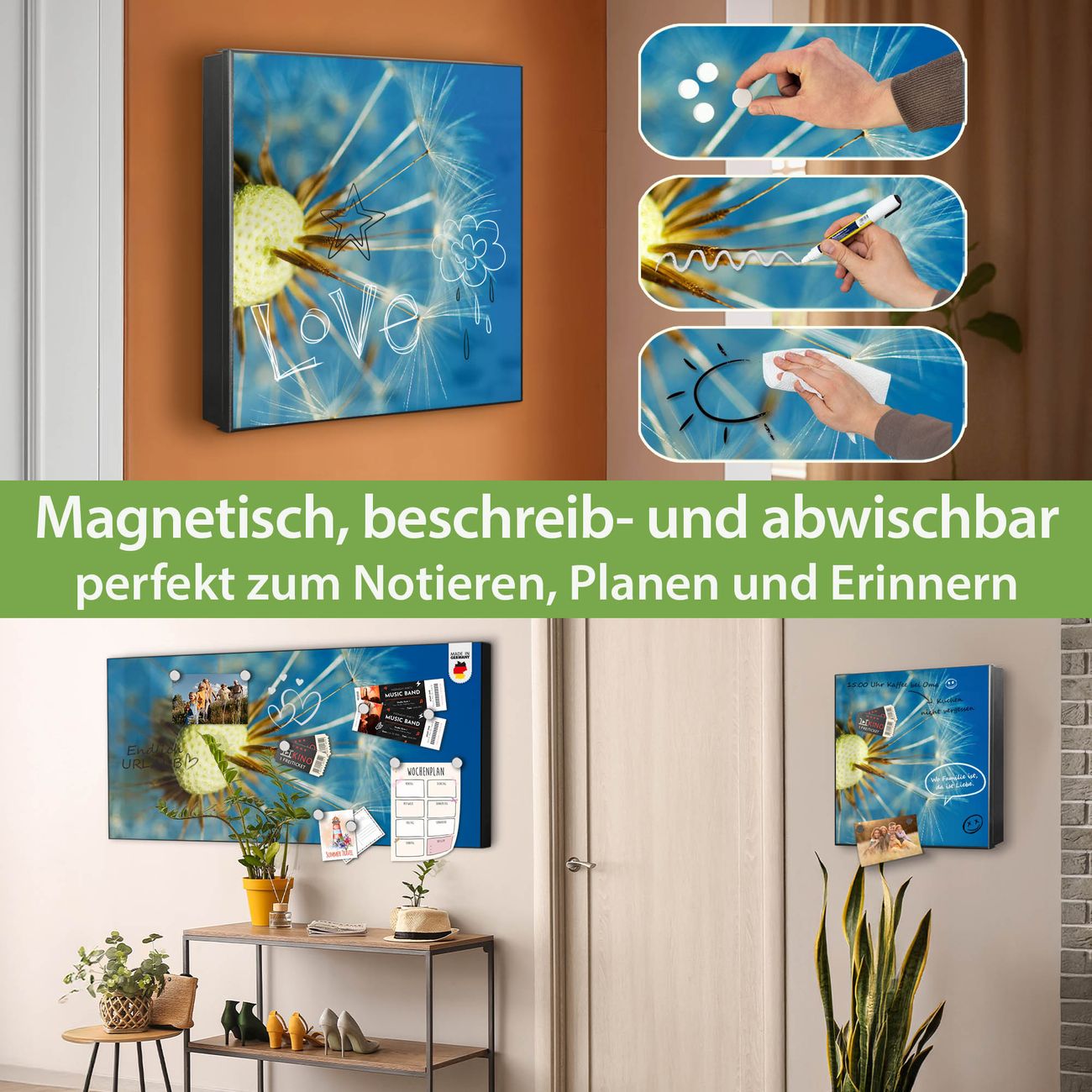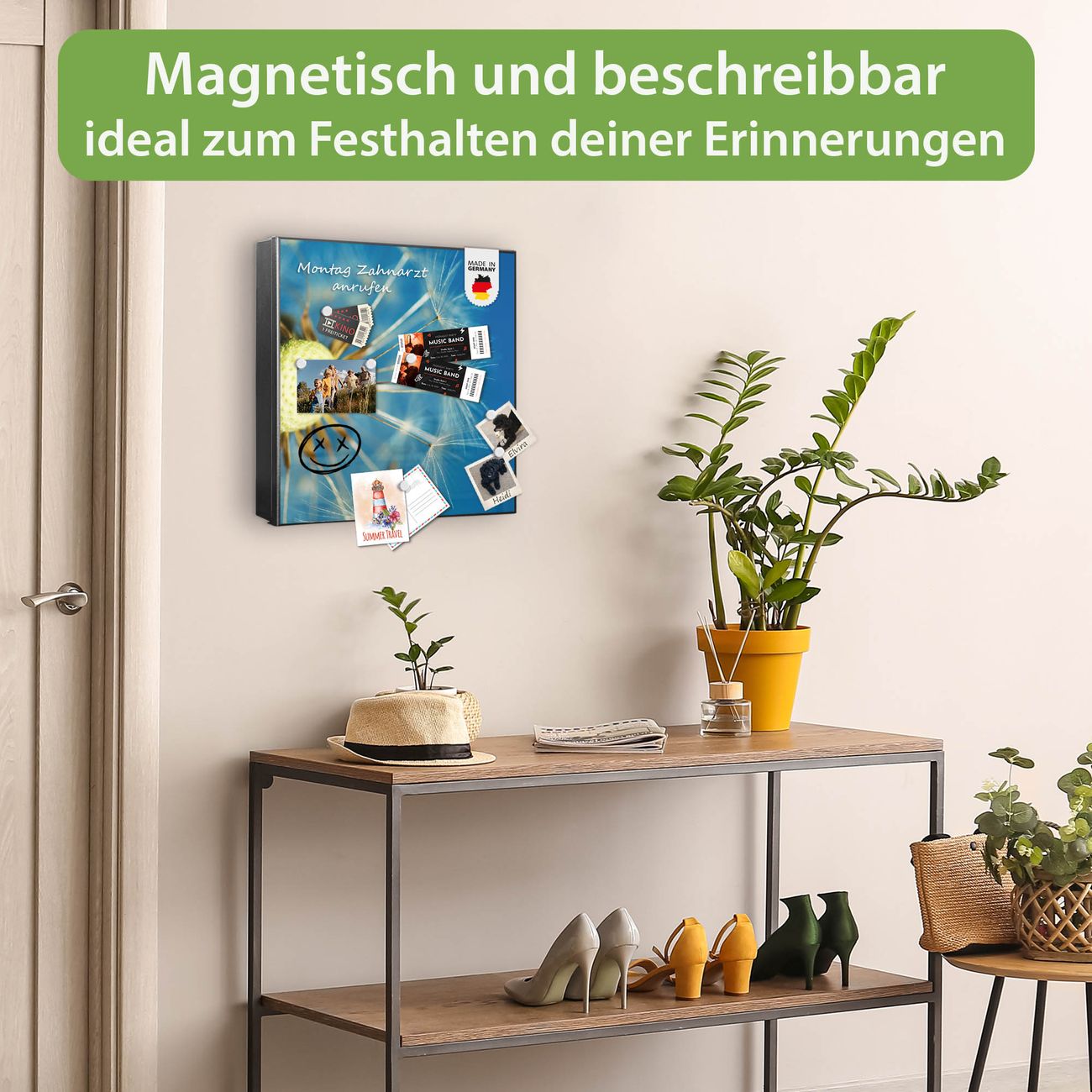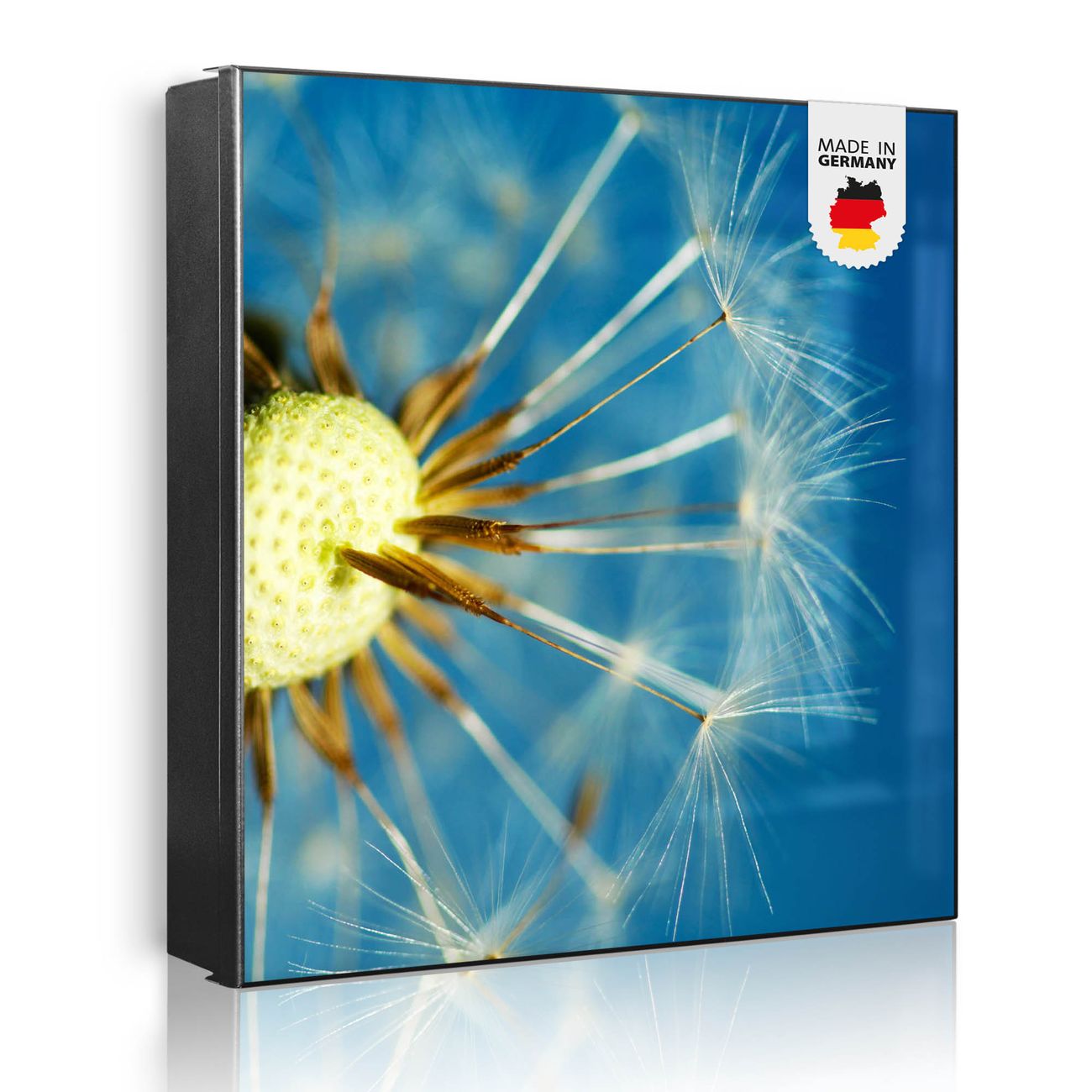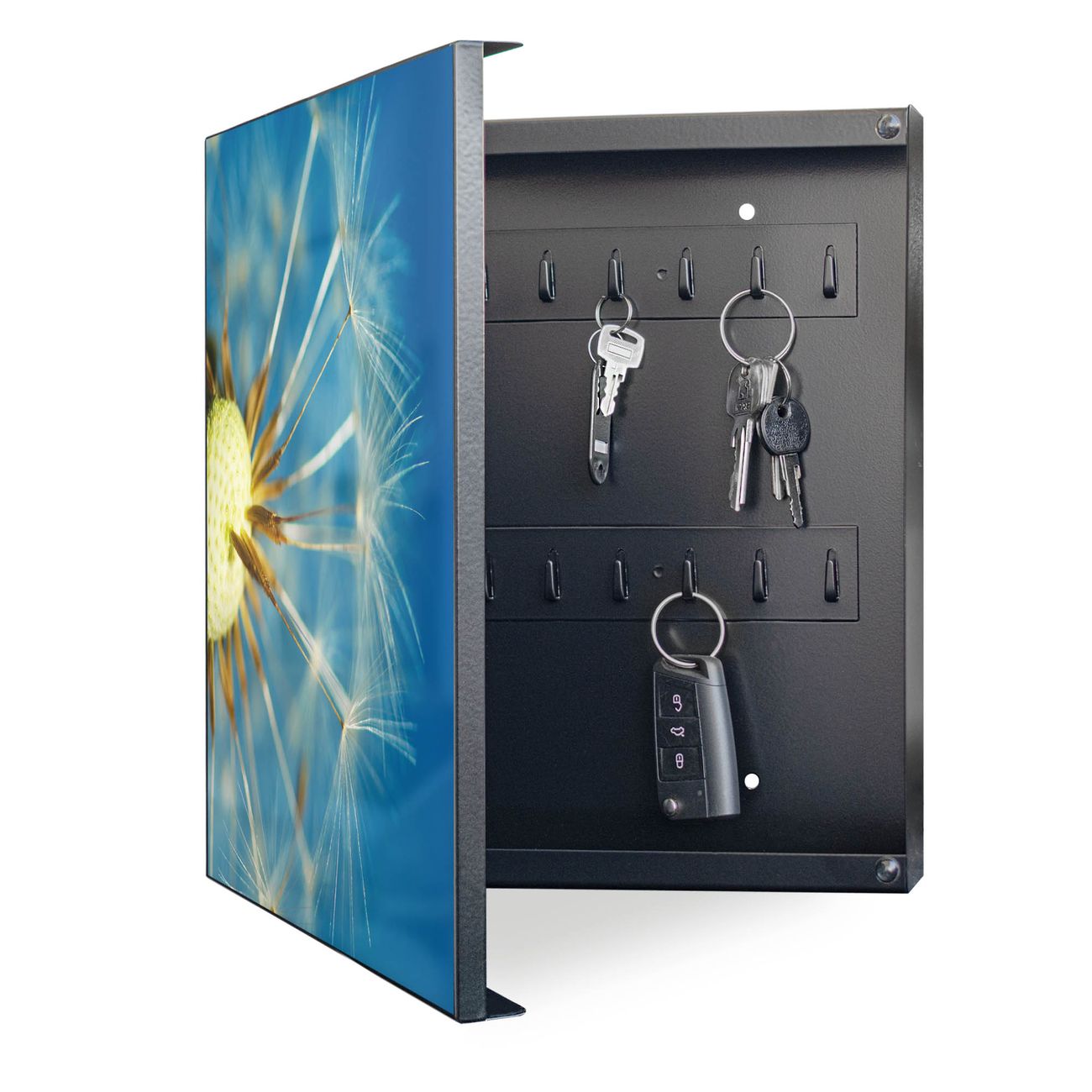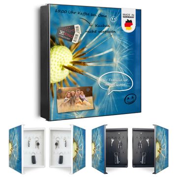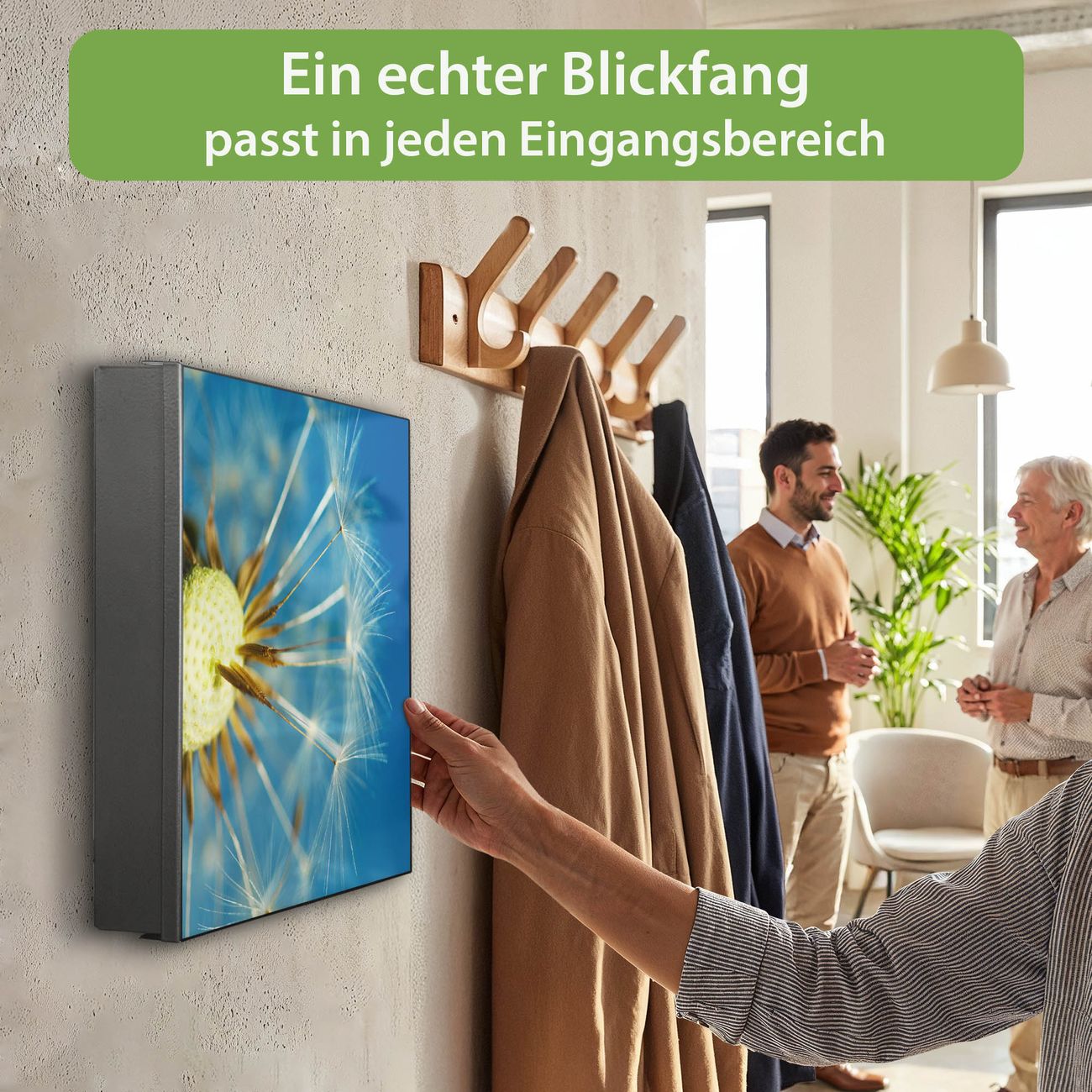 Bringe Ordnung und Eleganz in deinen Eingangsbereich mit dem banjado Schlüsselkasten Motiv Motiv Pusteblume Detail. Die moderne Schlüsselbox kombiniert funktionales Design mit hochwertiger Verarbeitung und wird so zu einem echten Hingucker in Flur, Büro oder Ferienwohnung. ✅ Stilvolle Schlüsselaufbewahrung mit Motiv Motiv Pusteblume Detail Der Design-Schlüsselkasten Motiv Motiv Pusteblume Detail bietet Platz für bis zu 32 Schlüssel, die auf 4 stabilen Reihen mit je 8 Haken übersichtlich verstaut werden. Mit seinen kompakten Maßen von 30 x 30 x 5 cm passt die Schlüsselbox perfekt auch in kleinere Räume. Der schwarz lackierte Stahlkorpus mit links angeschlagenem Türscharnier harmoniert mit gedruckten Folie auf der Front und fügt sich nahtlos in jedes Wohnambiente ein. Ob als Schlüsselorganizer für Zuhause oder als praktische Lösung für Büros, Praxen und Gewerbe, der banjado Schlüsselkasten sorgt für Ordnung und Übersicht. Dank der magnetischen, mit Kreidestiften beschreibbaren Folie auf der Front kannst du Notizen anheften oder Termine direkt auf der Oberfläche festhalten. Die Schlüsselbox Motiv Motiv Pusteblume Detail zur Wandmontage wird inklusive Befestigungsmaterial geliefert und ist schnell angebracht. So hast du deine Schlüssel jederzeit griffbereit und zugleich stilvoll verstaut. Mit diesem banjado Schlüsselkasten Motiv Motiv Pusteblume Detail kombinierst du praktische Aufbewahrung mit stilvollem Wohndesign. Ob privat oder geschäftlich, die Schlüsselbox sorgt für mehr Ordnung, Übersicht und ein wohnliches Ambiente.Vorteile im Überblick