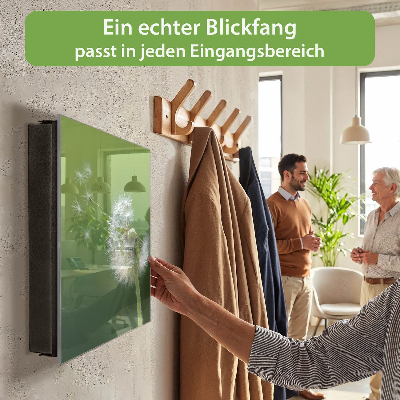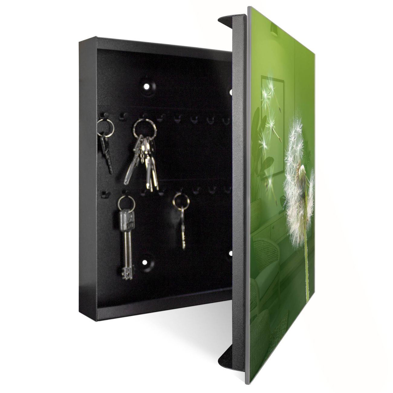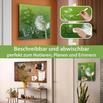 Bringe Ordnung und Eleganz in deinen Eingangsbereich mit dem banjado Schlüsselkasten Motiv Motiv Pusteblume. Die moderne Schlüsselbox kombiniert funktionales Design mit hochwertiger Verarbeitung und wird so zu einem echten Hingucker in Flur, Büro oder Ferienwohnung. ✅ Stilvolle Schlüsselaufbewahrung mit Glasfront im Motiv Motiv Pusteblume Der Design-Schlüsselkasten Motiv Motiv Pusteblume bietet Platz für bis zu 50 Schlüssel, die auf 5 stabilen Reihen mit je 10 Haken übersichtlich verstaut werden. Mit seinen kompakten Maßen von 30 x 30 x 5 cm passt die Schlüsselbox perfekt auch in kleinere Räume. Der schwarz lackierte Stahlkorpus mit rechts angeschlagenem Türscharnier harmoniert mit der Glasfront und fügt sich nahtlos in jedes Wohnambiente ein. Ob als Schlüsselorganizer für Zuhause oder als praktische Lösung für Büros, Praxen und Gewerbe, der banjado Schlüsselkasten sorgt für Ordnung und Übersicht. Dank der magnetischen, mit Kreidestiften beschreibbaren Glasfront kannst du Notizen anheften oder Termine direkt auf der Oberfläche festhalten. Die Schlüsselbox Motiv Motiv Pusteblume zur Wandmontage wird inklusive Befestigungsmaterial geliefert und ist schnell angebracht. So hast du deine Schlüssel jederzeit griffbereit und zugleich stilvoll verstaut. Mit diesem banjado Schlüsselkasten Motiv Motiv Pusteblume kombinierst du praktische Aufbewahrung mit stilvollem Wohndesign. Ob privat oder geschäftlich, die Schlüsselbox sorgt für mehr Ordnung, Übersicht und ein wohnliches Ambiente.Vorteile im Überblick