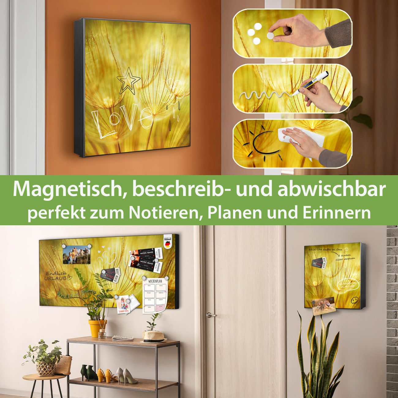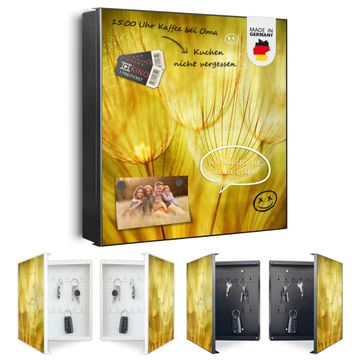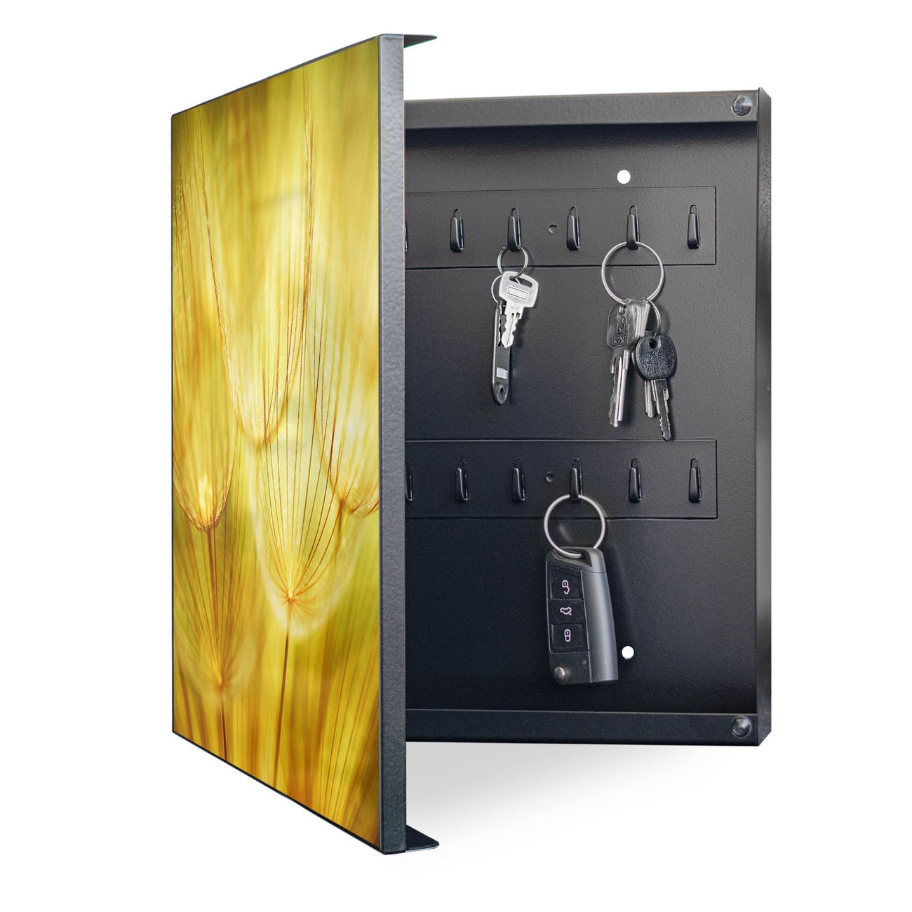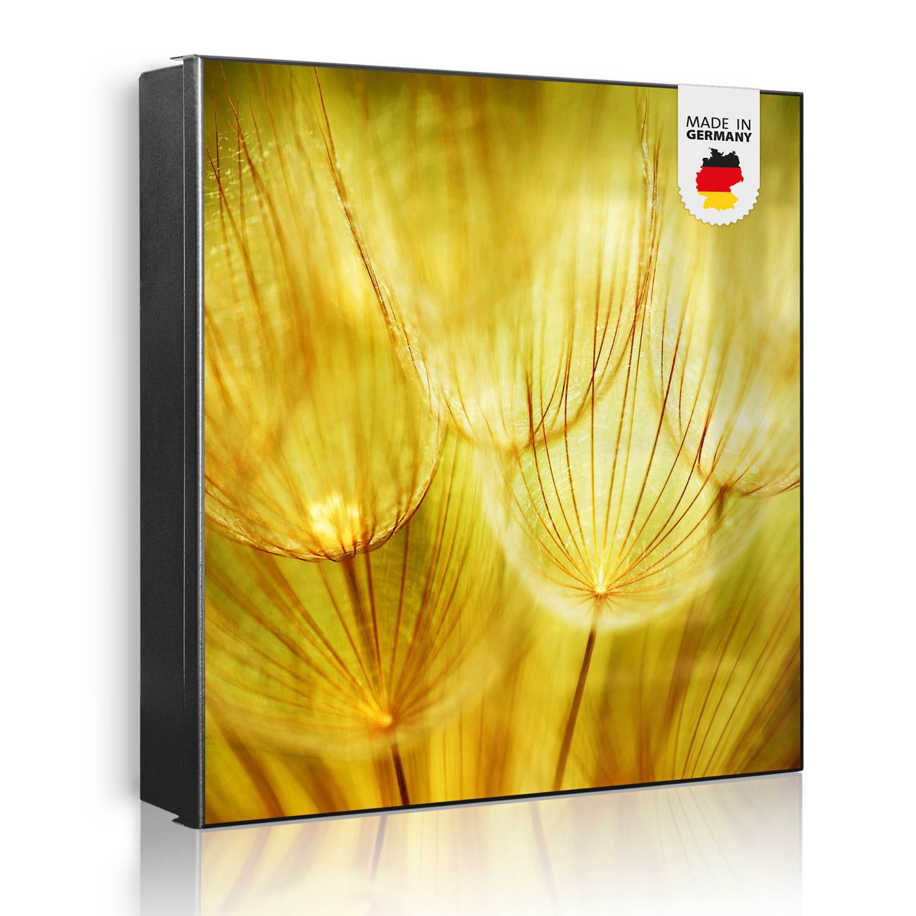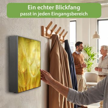 Bringe Ordnung und Eleganz in deinen Eingangsbereich mit dem banjado Schlüsselkasten Motiv Motiv Pusteblumen Gold. Die moderne Schlüsselbox kombiniert funktionales Design mit hochwertiger Verarbeitung und wird so zu einem echten Hingucker in Flur, Büro oder Ferienwohnung. ✅ Stilvolle Schlüsselaufbewahrung mit Motiv Motiv Pusteblumen Gold Der Design-Schlüsselkasten Motiv Motiv Pusteblumen Gold bietet Platz für bis zu 32 Schlüssel, die auf 4 stabilen Reihen mit je 8 Haken übersichtlich verstaut werden. Mit seinen kompakten Maßen von 30 x 30 x 5 cm passt die Schlüsselbox perfekt auch in kleinere Räume. Der schwarz lackierte Stahlkorpus mit links angeschlagenem Türscharnier harmoniert mit gedruckten Folie auf der Front und fügt sich nahtlos in jedes Wohnambiente ein. Ob als Schlüsselorganizer für Zuhause oder als praktische Lösung für Büros, Praxen und Gewerbe, der banjado Schlüsselkasten sorgt für Ordnung und Übersicht. Dank der magnetischen, mit Kreidestiften beschreibbaren Folie auf der Front kannst du Notizen anheften oder Termine direkt auf der Oberfläche festhalten. Die Schlüsselbox Motiv Motiv Pusteblumen Gold zur Wandmontage wird inklusive Befestigungsmaterial geliefert und ist schnell angebracht. So hast du deine Schlüssel jederzeit griffbereit und zugleich stilvoll verstaut. Mit diesem banjado Schlüsselkasten Motiv Motiv Pusteblumen Gold kombinierst du praktische Aufbewahrung mit stilvollem Wohndesign. Ob privat oder geschäftlich, die Schlüsselbox sorgt für mehr Ordnung, Übersicht und ein wohnliches Ambiente.Vorteile im Überblick