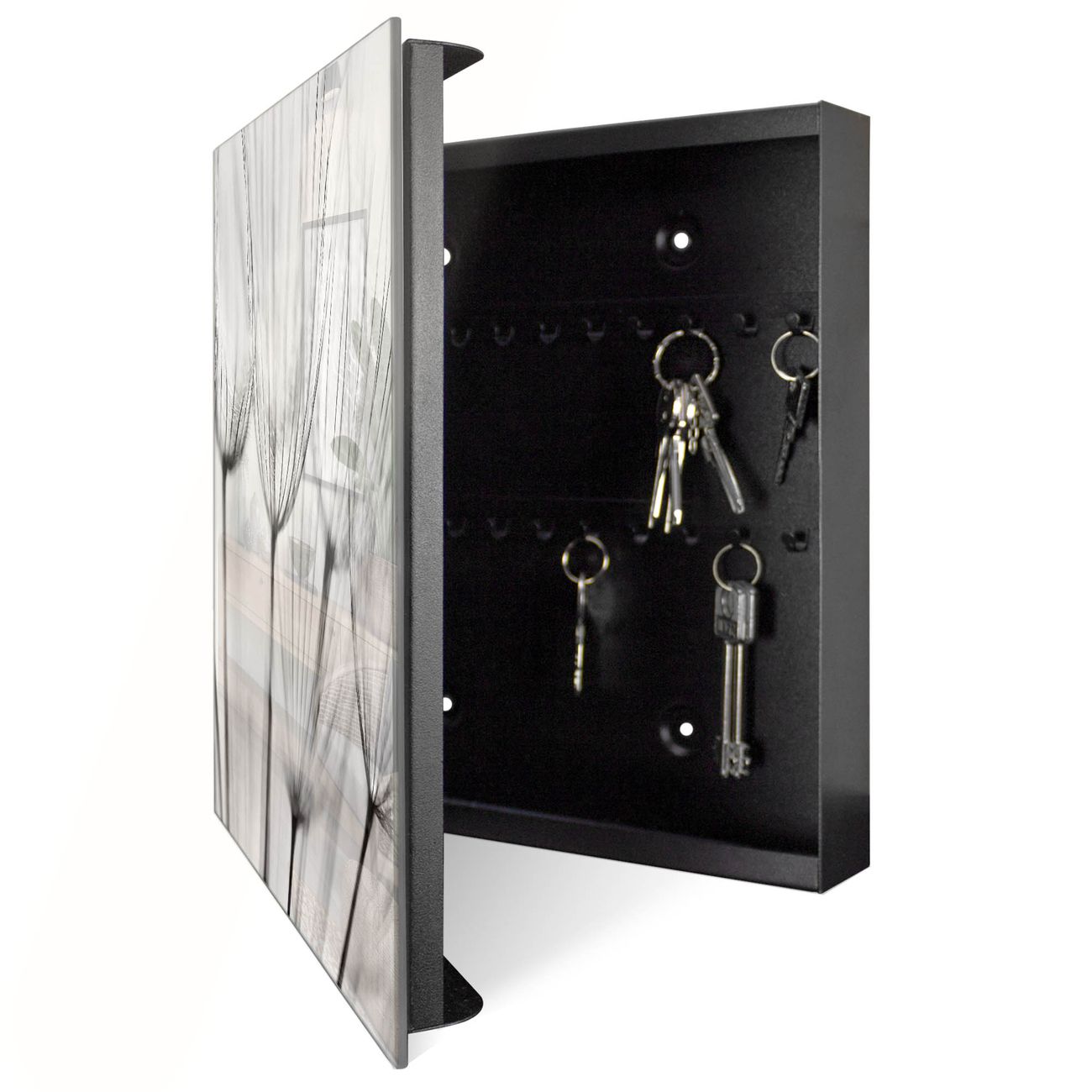 Bringe Ordnung und Eleganz in deinen Eingangsbereich mit dem banjado Schlüsselkasten Motiv Motiv Pusteblumen SW. Die moderne Schlüsselbox kombiniert funktionales Design mit hochwertiger Verarbeitung und wird so zu einem echten Hingucker in Flur, Büro oder Ferienwohnung. ✅ Stilvolle Schlüsselaufbewahrung mit Glasfront im Motiv Motiv Pusteblumen SW Der Design-Schlüsselkasten Motiv Motiv Pusteblumen SW bietet Platz für bis zu 50 Schlüssel, die auf 5 stabilen Reihen mit je 10 Haken übersichtlich verstaut werden. Mit seinen kompakten Maßen von 30 x 30 x 5 cm passt die Schlüsselbox perfekt auch in kleinere Räume. Der schwarz lackierte Stahlkorpus mit rechts angeschlagenem Türscharnier harmoniert mit der Glasfront und fügt sich nahtlos in jedes Wohnambiente ein. Ob als Schlüsselorganizer für Zuhause oder als praktische Lösung für Büros, Praxen und Gewerbe, der banjado Schlüsselkasten sorgt für Ordnung und Übersicht. Dank der magnetischen, mit Kreidestiften beschreibbaren Glasfront kannst du Notizen anheften oder Termine direkt auf der Oberfläche festhalten. Die Schlüsselbox Motiv Motiv Pusteblumen SW zur Wandmontage wird inklusive Befestigungsmaterial geliefert und ist schnell angebracht. So hast du deine Schlüssel jederzeit griffbereit und zugleich stilvoll verstaut. Mit diesem banjado Schlüsselkasten Motiv Motiv Pusteblumen SW kombinierst du praktische Aufbewahrung mit stilvollem Wohndesign. Ob privat oder geschäftlich, die Schlüsselbox sorgt für mehr Ordnung, Übersicht und ein wohnliches Ambiente.Vorteile im Überblick
