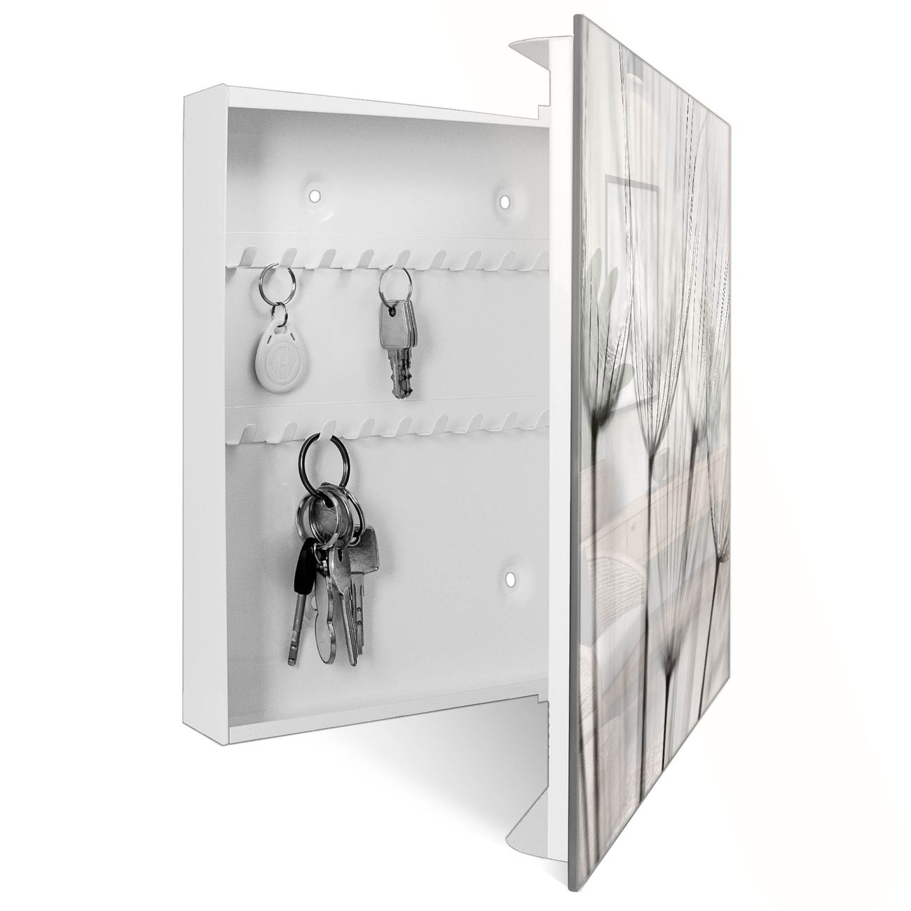 Bringe Ordnung und Eleganz in deinen Eingangsbereich mit dem banjado Schlüsselkasten Motiv Motiv Pusteblumen SW. Die moderne Schlüsselbox kombiniert funktionales Design mit hochwertiger Verarbeitung und wird so zu einem echten Hingucker in Flur, Büro oder Ferienwohnung. ✅ Stilvolle Schlüsselaufbewahrung mit Glasfront im Motiv Motiv Pusteblumen SW Der Design-Schlüsselkasten Motiv Motiv Pusteblumen SW bietet Platz für bis zu 50 Schlüssel, die auf 5 stabilen Reihen mit je 10 Haken übersichtlich verstaut werden. Mit seinen kompakten Maßen von 30 x 30 x 5 cm passt die Schlüsselbox perfekt auch in kleinere Räume. Der weiß lackierte Stahlkorpus mit rechts angeschlagenem Türscharnier harmoniert mit der Glasfront und fügt sich nahtlos in jedes Wohnambiente ein. Ob als Schlüsselorganizer für Zuhause oder als praktische Lösung für Büros, Praxen und Gewerbe, der banjado Schlüsselkasten sorgt für Ordnung und Übersicht. Dank der magnetischen, mit Kreidestiften beschreibbaren Glasfront kannst du Notizen anheften oder Termine direkt auf der Oberfläche festhalten. Die Schlüsselbox Motiv Motiv Pusteblumen SW zur Wandmontage wird inklusive Befestigungsmaterial geliefert und ist schnell angebracht. So hast du deine Schlüssel jederzeit griffbereit und zugleich stilvoll verstaut. Mit diesem banjado Schlüsselkasten Motiv Motiv Pusteblumen SW kombinierst du praktische Aufbewahrung mit stilvollem Wohndesign. Ob privat oder geschäftlich, die Schlüsselbox sorgt für mehr Ordnung, Übersicht und ein wohnliches Ambiente.Vorteile im Überblick