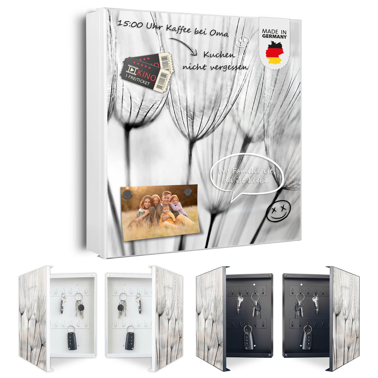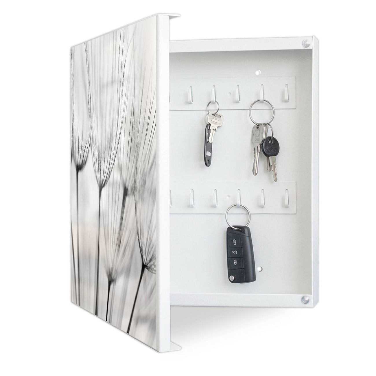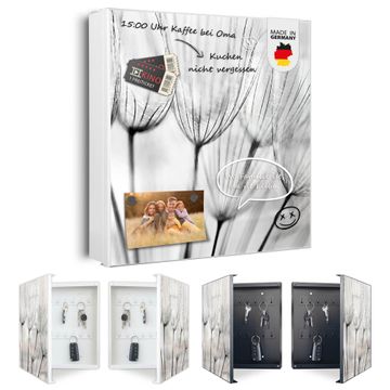 Bringe Ordnung und Eleganz in deinen Eingangsbereich mit dem banjado Schlüsselkasten Motiv Motiv Pusteblumen SW. Die moderne Schlüsselbox kombiniert funktionales Design mit hochwertiger Verarbeitung und wird so zu einem echten Hingucker in Flur, Büro oder Ferienwohnung. ✅ Stilvolle Schlüsselaufbewahrung mit Motiv Motiv Pusteblumen SW Der Design-Schlüsselkasten Motiv Motiv Pusteblumen SW bietet Platz für bis zu 32 Schlüssel, die auf 4 stabilen Reihen mit je 8 Haken übersichtlich verstaut werden. Mit seinen kompakten Maßen von 30 x 30 x 5 cm passt die Schlüsselbox perfekt auch in kleinere Räume. Der weiß lackierte Stahlkorpus mit links angeschlagenem Türscharnier harmoniert mit gedruckten Folie auf der Front und fügt sich nahtlos in jedes Wohnambiente ein. Ob als Schlüsselorganizer für Zuhause oder als praktische Lösung für Büros, Praxen und Gewerbe, der banjado Schlüsselkasten sorgt für Ordnung und Übersicht. Dank der magnetischen, mit Kreidestiften beschreibbaren Folie auf der Front kannst du Notizen anheften oder Termine direkt auf der Oberfläche festhalten. Die Schlüsselbox Motiv Motiv Pusteblumen SW zur Wandmontage wird inklusive Befestigungsmaterial geliefert und ist schnell angebracht. So hast du deine Schlüssel jederzeit griffbereit und zugleich stilvoll verstaut. Mit diesem banjado Schlüsselkasten Motiv Motiv Pusteblumen SW kombinierst du praktische Aufbewahrung mit stilvollem Wohndesign. Ob privat oder geschäftlich, die Schlüsselbox sorgt für mehr Ordnung, Übersicht und ein wohnliches Ambiente.Vorteile im Überblick