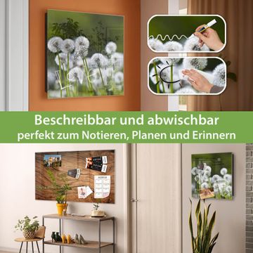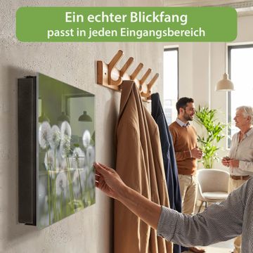 Bringe Ordnung und Eleganz in deinen Eingangsbereich mit dem banjado Schlüsselkasten Motiv Motiv Pusteblumenwiese. Die moderne Schlüsselbox kombiniert funktionales Design mit hochwertiger Verarbeitung und wird so zu einem echten Hingucker in Flur, Büro oder Ferienwohnung. ✅ Stilvolle Schlüsselaufbewahrung mit Glasfront im Motiv Motiv Pusteblumenwiese Der Design-Schlüsselkasten Motiv Motiv Pusteblumenwiese bietet Platz für bis zu 50 Schlüssel, die auf 5 stabilen Reihen mit je 10 Haken übersichtlich verstaut werden. Mit seinen kompakten Maßen von 30 x 30 x 5 cm passt die Schlüsselbox perfekt auch in kleinere Räume. Der schwarz lackierte Stahlkorpus mit rechts angeschlagenem Türscharnier harmoniert mit der Glasfront und fügt sich nahtlos in jedes Wohnambiente ein. Ob als Schlüsselorganizer für Zuhause oder als praktische Lösung für Büros, Praxen und Gewerbe, der banjado Schlüsselkasten sorgt für Ordnung und Übersicht. Dank der magnetischen, mit Kreidestiften beschreibbaren Glasfront kannst du Notizen anheften oder Termine direkt auf der Oberfläche festhalten. Die Schlüsselbox Motiv Motiv Pusteblumenwiese zur Wandmontage wird inklusive Befestigungsmaterial geliefert und ist schnell angebracht. So hast du deine Schlüssel jederzeit griffbereit und zugleich stilvoll verstaut. Mit diesem banjado Schlüsselkasten Motiv Motiv Pusteblumenwiese kombinierst du praktische Aufbewahrung mit stilvollem Wohndesign. Ob privat oder geschäftlich, die Schlüsselbox sorgt für mehr Ordnung, Übersicht und ein wohnliches Ambiente.Vorteile im Überblick