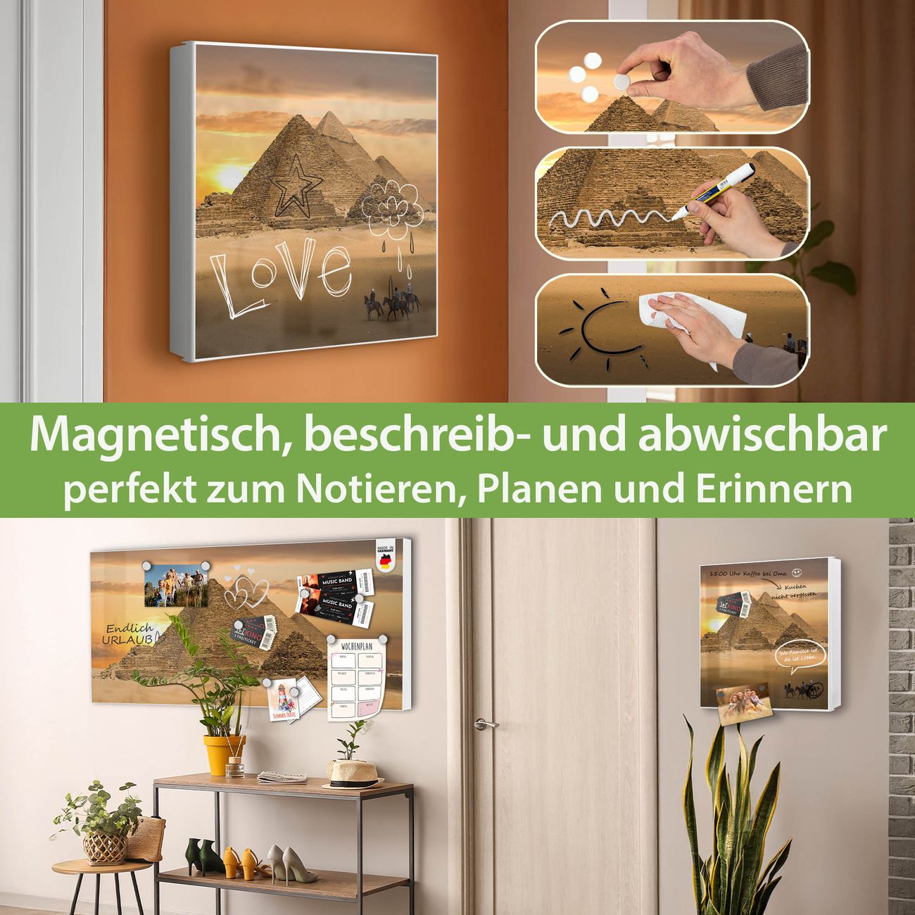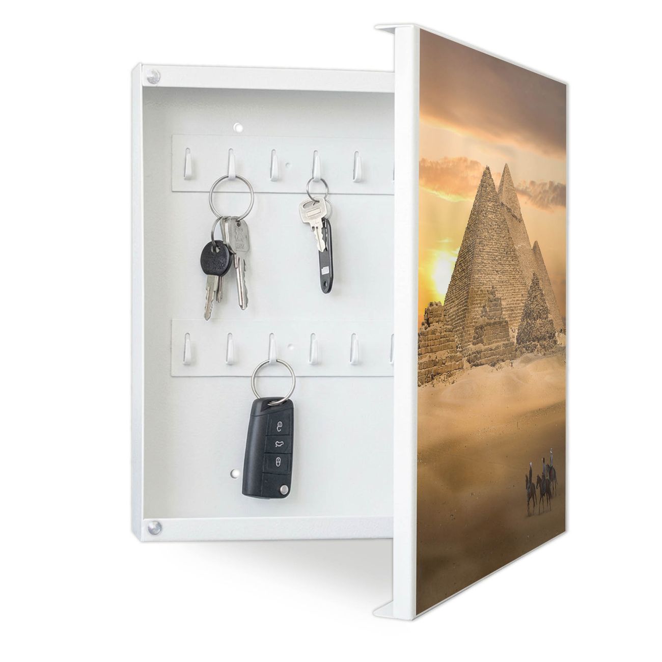 Bringe Ordnung und Eleganz in deinen Eingangsbereich mit dem banjado Schlüsselkasten Motiv Motiv Pyramiden. Die moderne Schlüsselbox kombiniert funktionales Design mit hochwertiger Verarbeitung und wird so zu einem echten Hingucker in Flur, Büro oder Ferienwohnung. ✅ Stilvolle Schlüsselaufbewahrung mit Motiv Motiv Pyramiden Der Design-Schlüsselkasten Motiv Motiv Pyramiden bietet Platz für bis zu 32 Schlüssel, die auf 4 stabilen Reihen mit je 8 Haken übersichtlich verstaut werden. Mit seinen kompakten Maßen von 30 x 30 x 5 cm passt die Schlüsselbox perfekt auch in kleinere Räume. Der weiß lackierte Stahlkorpus mit rechts angeschlagenem Türscharnier harmoniert mit gedruckten Folie auf der Front und fügt sich nahtlos in jedes Wohnambiente ein. Ob als Schlüsselorganizer für Zuhause oder als praktische Lösung für Büros, Praxen und Gewerbe, der banjado Schlüsselkasten sorgt für Ordnung und Übersicht. Dank der magnetischen, mit Kreidestiften beschreibbaren Folie auf der Front kannst du Notizen anheften oder Termine direkt auf der Oberfläche festhalten. Die Schlüsselbox Motiv Motiv Pyramiden zur Wandmontage wird inklusive Befestigungsmaterial geliefert und ist schnell angebracht. So hast du deine Schlüssel jederzeit griffbereit und zugleich stilvoll verstaut. Mit diesem banjado Schlüsselkasten Motiv Motiv Pyramiden kombinierst du praktische Aufbewahrung mit stilvollem Wohndesign. Ob privat oder geschäftlich, die Schlüsselbox sorgt für mehr Ordnung, Übersicht und ein wohnliches Ambiente.Vorteile im Überblick