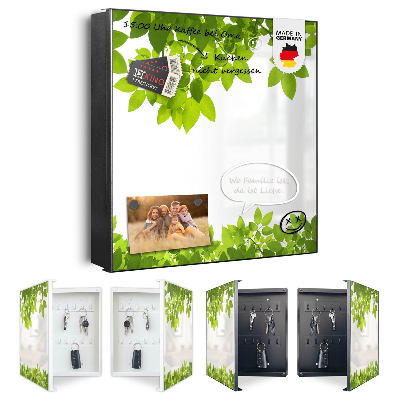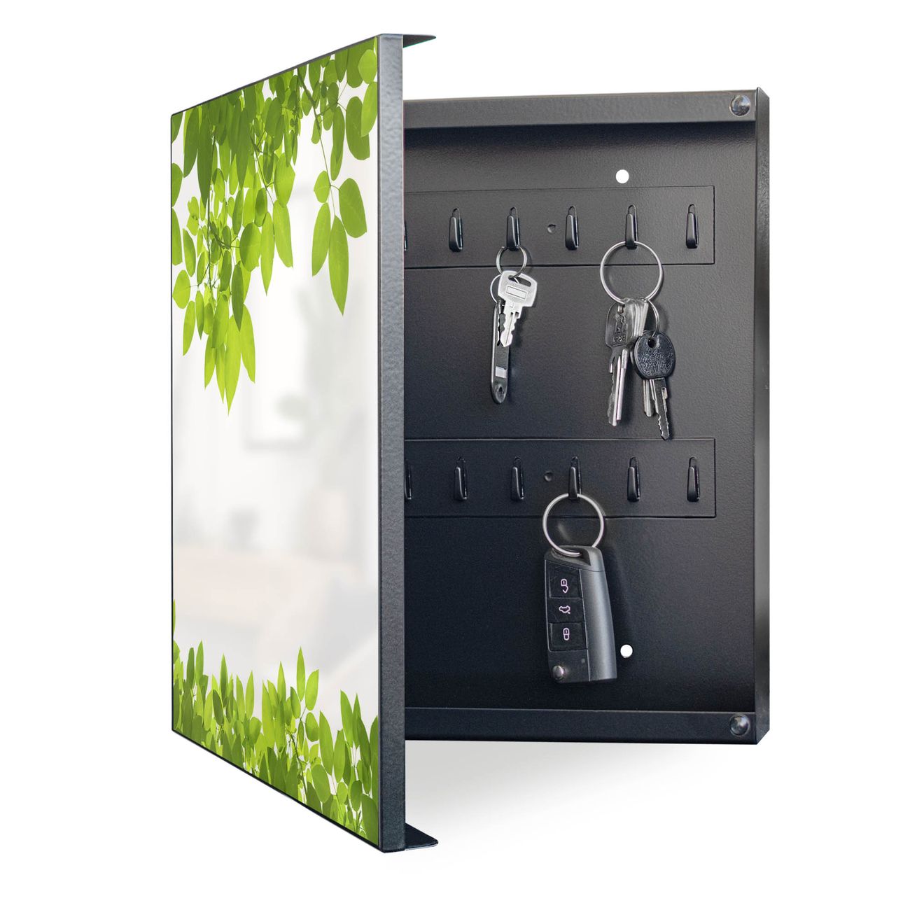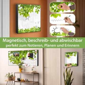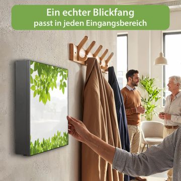 Bringe Ordnung und Eleganz in deinen Eingangsbereich mit dem banjado Schlüsselkasten Motiv Motiv Rahmen Blätter. Die moderne Schlüsselbox kombiniert funktionales Design mit hochwertiger Verarbeitung und wird so zu einem echten Hingucker in Flur, Büro oder Ferienwohnung. ✅ Stilvolle Schlüsselaufbewahrung mit Motiv Motiv Rahmen Blätter Der Design-Schlüsselkasten Motiv Motiv Rahmen Blätter bietet Platz für bis zu 32 Schlüssel, die auf 4 stabilen Reihen mit je 8 Haken übersichtlich verstaut werden. Mit seinen kompakten Maßen von 30 x 30 x 5 cm passt die Schlüsselbox perfekt auch in kleinere Räume. Der schwarz lackierte Stahlkorpus mit links angeschlagenem Türscharnier harmoniert mit gedruckten Folie auf der Front und fügt sich nahtlos in jedes Wohnambiente ein. Ob als Schlüsselorganizer für Zuhause oder als praktische Lösung für Büros, Praxen und Gewerbe, der banjado Schlüsselkasten sorgt für Ordnung und Übersicht. Dank der magnetischen, mit Kreidestiften beschreibbaren Folie auf der Front kannst du Notizen anheften oder Termine direkt auf der Oberfläche festhalten. Die Schlüsselbox Motiv Motiv Rahmen Blätter zur Wandmontage wird inklusive Befestigungsmaterial geliefert und ist schnell angebracht. So hast du deine Schlüssel jederzeit griffbereit und zugleich stilvoll verstaut. Mit diesem banjado Schlüsselkasten Motiv Motiv Rahmen Blätter kombinierst du praktische Aufbewahrung mit stilvollem Wohndesign. Ob privat oder geschäftlich, die Schlüsselbox sorgt für mehr Ordnung, Übersicht und ein wohnliches Ambiente.Vorteile im Überblick