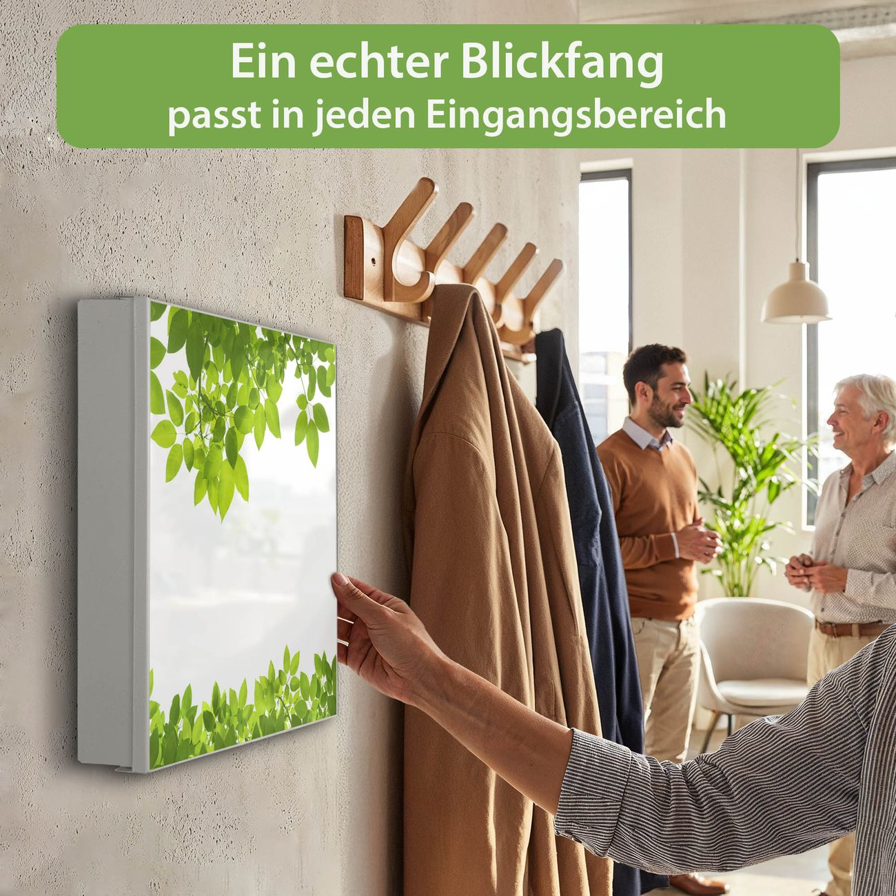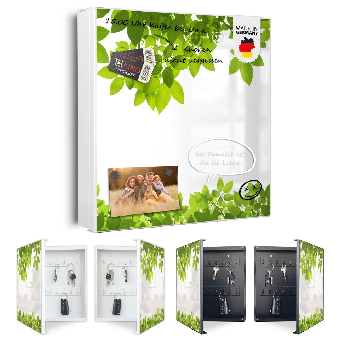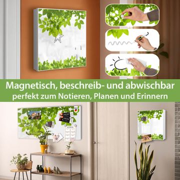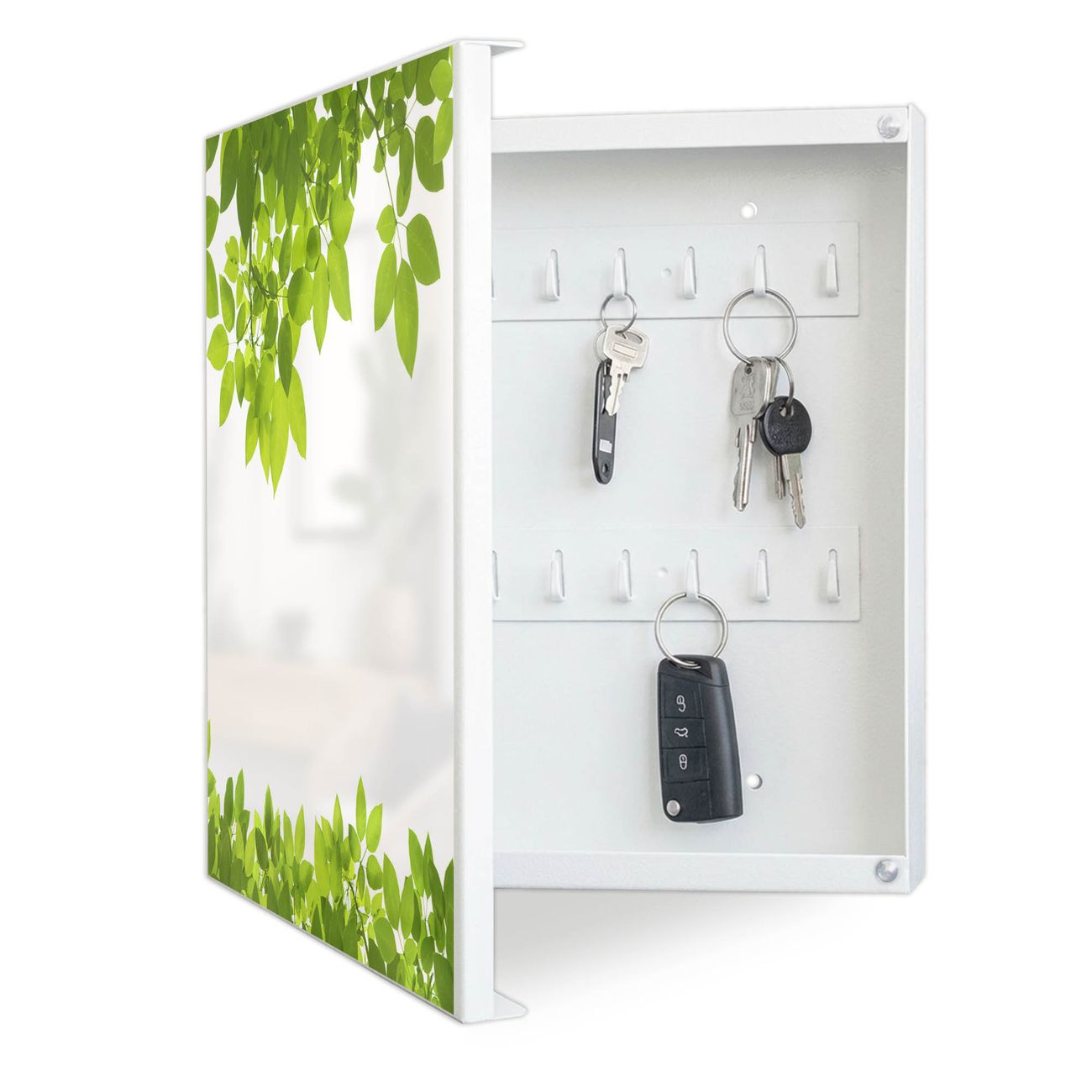 Bringe Ordnung und Eleganz in deinen Eingangsbereich mit dem banjado Schlüsselkasten Motiv Motiv Rahmen Blätter. Die moderne Schlüsselbox kombiniert funktionales Design mit hochwertiger Verarbeitung und wird so zu einem echten Hingucker in Flur, Büro oder Ferienwohnung. ✅ Stilvolle Schlüsselaufbewahrung mit Motiv Motiv Rahmen Blätter Der Design-Schlüsselkasten Motiv Motiv Rahmen Blätter bietet Platz für bis zu 32 Schlüssel, die auf 4 stabilen Reihen mit je 8 Haken übersichtlich verstaut werden. Mit seinen kompakten Maßen von 30 x 30 x 5 cm passt die Schlüsselbox perfekt auch in kleinere Räume. Der weiß lackierte Stahlkorpus mit links angeschlagenem Türscharnier harmoniert mit gedruckten Folie auf der Front und fügt sich nahtlos in jedes Wohnambiente ein. Ob als Schlüsselorganizer für Zuhause oder als praktische Lösung für Büros, Praxen und Gewerbe, der banjado Schlüsselkasten sorgt für Ordnung und Übersicht. Dank der magnetischen, mit Kreidestiften beschreibbaren Folie auf der Front kannst du Notizen anheften oder Termine direkt auf der Oberfläche festhalten. Die Schlüsselbox Motiv Motiv Rahmen Blätter zur Wandmontage wird inklusive Befestigungsmaterial geliefert und ist schnell angebracht. So hast du deine Schlüssel jederzeit griffbereit und zugleich stilvoll verstaut. Mit diesem banjado Schlüsselkasten Motiv Motiv Rahmen Blätter kombinierst du praktische Aufbewahrung mit stilvollem Wohndesign. Ob privat oder geschäftlich, die Schlüsselbox sorgt für mehr Ordnung, Übersicht und ein wohnliches Ambiente.Vorteile im Überblick