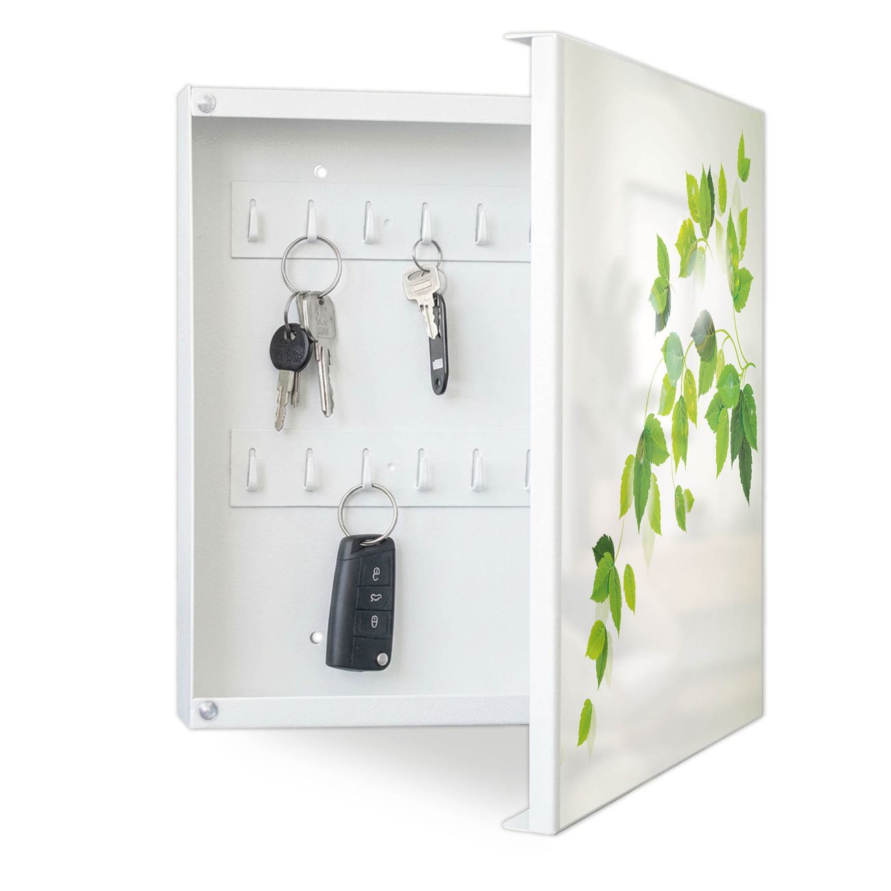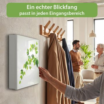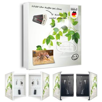 Bringe Ordnung und Eleganz in deinen Eingangsbereich mit dem banjado Schlüsselkasten Motiv Motiv Ranke Gelb Weiß. Die moderne Schlüsselbox kombiniert funktionales Design mit hochwertiger Verarbeitung und wird so zu einem echten Hingucker in Flur, Büro oder Ferienwohnung. ✅ Stilvolle Schlüsselaufbewahrung mit Motiv Motiv Ranke Gelb Weiß Der Design-Schlüsselkasten Motiv Motiv Ranke Gelb Weiß bietet Platz für bis zu 32 Schlüssel, die auf 4 stabilen Reihen mit je 8 Haken übersichtlich verstaut werden. Mit seinen kompakten Maßen von 30 x 30 x 5 cm passt die Schlüsselbox perfekt auch in kleinere Räume. Der weiß lackierte Stahlkorpus mit rechts angeschlagenem Türscharnier harmoniert mit gedruckten Folie auf der Front und fügt sich nahtlos in jedes Wohnambiente ein. Ob als Schlüsselorganizer für Zuhause oder als praktische Lösung für Büros, Praxen und Gewerbe, der banjado Schlüsselkasten sorgt für Ordnung und Übersicht. Dank der magnetischen, mit Kreidestiften beschreibbaren Folie auf der Front kannst du Notizen anheften oder Termine direkt auf der Oberfläche festhalten. Die Schlüsselbox Motiv Motiv Ranke Gelb Weiß zur Wandmontage wird inklusive Befestigungsmaterial geliefert und ist schnell angebracht. So hast du deine Schlüssel jederzeit griffbereit und zugleich stilvoll verstaut. Mit diesem banjado Schlüsselkasten Motiv Motiv Ranke Gelb Weiß kombinierst du praktische Aufbewahrung mit stilvollem Wohndesign. Ob privat oder geschäftlich, die Schlüsselbox sorgt für mehr Ordnung, Übersicht und ein wohnliches Ambiente.Vorteile im Überblick