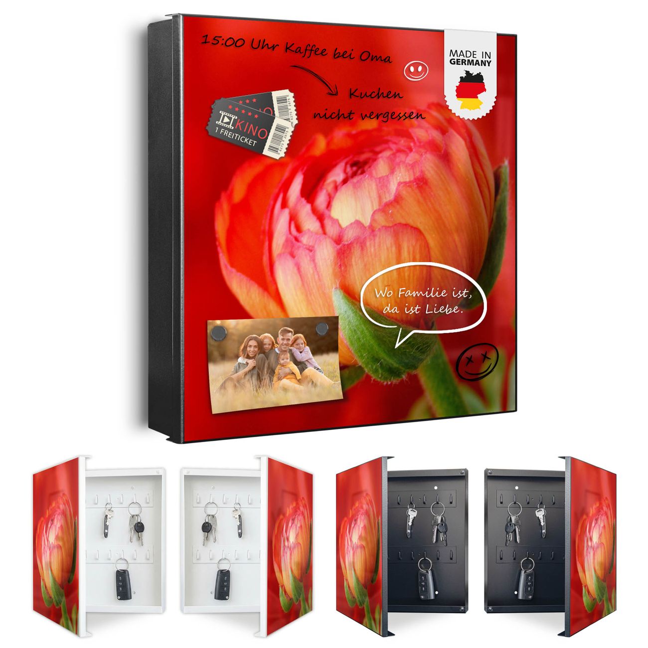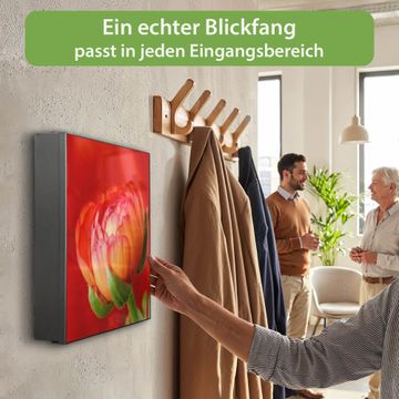 Bringe Ordnung und Eleganz in deinen Eingangsbereich mit dem banjado Schlüsselkasten Motiv Motiv Ranunkel. Die moderne Schlüsselbox kombiniert funktionales Design mit hochwertiger Verarbeitung und wird so zu einem echten Hingucker in Flur, Büro oder Ferienwohnung. ✅ Stilvolle Schlüsselaufbewahrung mit Motiv Motiv Ranunkel Der Design-Schlüsselkasten Motiv Motiv Ranunkel bietet Platz für bis zu 32 Schlüssel, die auf 4 stabilen Reihen mit je 8 Haken übersichtlich verstaut werden. Mit seinen kompakten Maßen von 30 x 30 x 5 cm passt die Schlüsselbox perfekt auch in kleinere Räume. Der schwarz lackierte Stahlkorpus mit links angeschlagenem Türscharnier harmoniert mit gedruckten Folie auf der Front und fügt sich nahtlos in jedes Wohnambiente ein. Ob als Schlüsselorganizer für Zuhause oder als praktische Lösung für Büros, Praxen und Gewerbe, der banjado Schlüsselkasten sorgt für Ordnung und Übersicht. Dank der magnetischen, mit Kreidestiften beschreibbaren Folie auf der Front kannst du Notizen anheften oder Termine direkt auf der Oberfläche festhalten. Die Schlüsselbox Motiv Motiv Ranunkel zur Wandmontage wird inklusive Befestigungsmaterial geliefert und ist schnell angebracht. So hast du deine Schlüssel jederzeit griffbereit und zugleich stilvoll verstaut. Mit diesem banjado Schlüsselkasten Motiv Motiv Ranunkel kombinierst du praktische Aufbewahrung mit stilvollem Wohndesign. Ob privat oder geschäftlich, die Schlüsselbox sorgt für mehr Ordnung, Übersicht und ein wohnliches Ambiente.Vorteile im Überblick
