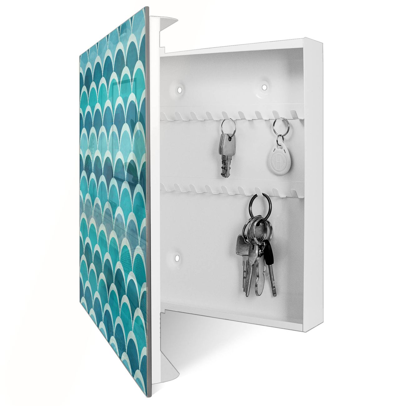 Bringe Ordnung und Eleganz in deinen Eingangsbereich mit dem banjado Schlüsselkasten Motiv Motiv Raue See. Die moderne Schlüsselbox kombiniert funktionales Design mit hochwertiger Verarbeitung und wird so zu einem echten Hingucker in Flur, Büro oder Ferienwohnung. ✅ Stilvolle Schlüsselaufbewahrung mit Glasfront im Motiv Motiv Raue See Der Design-Schlüsselkasten Motiv Motiv Raue See bietet Platz für bis zu 50 Schlüssel, die auf 5 stabilen Reihen mit je 10 Haken übersichtlich verstaut werden. Mit seinen kompakten Maßen von 30 x 30 x 5 cm passt die Schlüsselbox perfekt auch in kleinere Räume. Der weiß lackierte Stahlkorpus mit rechts angeschlagenem Türscharnier harmoniert mit der Glasfront und fügt sich nahtlos in jedes Wohnambiente ein. Ob als Schlüsselorganizer für Zuhause oder als praktische Lösung für Büros, Praxen und Gewerbe, der banjado Schlüsselkasten sorgt für Ordnung und Übersicht. Dank der magnetischen, mit Kreidestiften beschreibbaren Glasfront kannst du Notizen anheften oder Termine direkt auf der Oberfläche festhalten. Die Schlüsselbox Motiv Motiv Raue See zur Wandmontage wird inklusive Befestigungsmaterial geliefert und ist schnell angebracht. So hast du deine Schlüssel jederzeit griffbereit und zugleich stilvoll verstaut. Mit diesem banjado Schlüsselkasten Motiv Motiv Raue See kombinierst du praktische Aufbewahrung mit stilvollem Wohndesign. Ob privat oder geschäftlich, die Schlüsselbox sorgt für mehr Ordnung, Übersicht und ein wohnliches Ambiente.Vorteile im Überblick