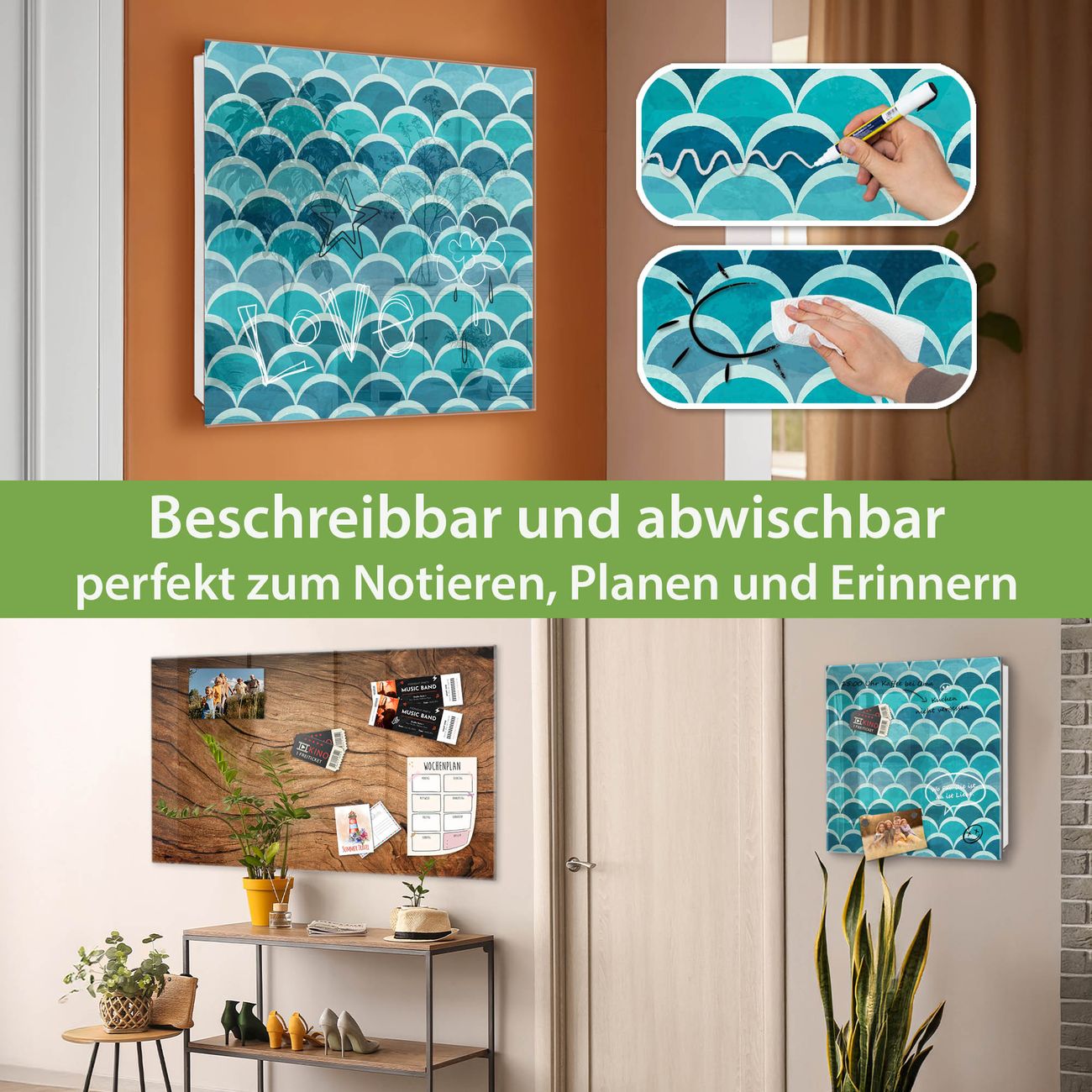 ✅ Magnetisch und mit Kreidestift beschreibbar, gehärtetes Glas, links angeschlagene TürOrdnung und Design in einem