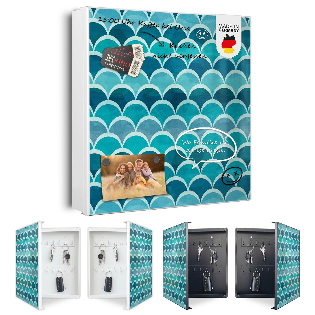 Bringe Ordnung und Eleganz in deinen Eingangsbereich mit dem banjado Schlüsselkasten Motiv Motiv Raue See. Die moderne Schlüsselbox kombiniert funktionales Design mit hochwertiger Verarbeitung und wird so zu einem echten Hingucker in Flur, Büro oder Ferienwohnung. ✅ Stilvolle Schlüsselaufbewahrung mit Motiv Motiv Raue See Der Design-Schlüsselkasten Motiv Motiv Raue See bietet Platz für bis zu 32 Schlüssel, die auf 4 stabilen Reihen mit je 8 Haken übersichtlich verstaut werden. Mit seinen kompakten Maßen von 30 x 30 x 5 cm passt die Schlüsselbox perfekt auch in kleinere Räume. Der weiß lackierte Stahlkorpus mit links angeschlagenem Türscharnier harmoniert mit gedruckten Folie auf der Front und fügt sich nahtlos in jedes Wohnambiente ein. Ob als Schlüsselorganizer für Zuhause oder als praktische Lösung für Büros, Praxen und Gewerbe, der banjado Schlüsselkasten sorgt für Ordnung und Übersicht. Dank der magnetischen, mit Kreidestiften beschreibbaren Folie auf der Front kannst du Notizen anheften oder Termine direkt auf der Oberfläche festhalten. Die Schlüsselbox Motiv Motiv Raue See zur Wandmontage wird inklusive Befestigungsmaterial geliefert und ist schnell angebracht. So hast du deine Schlüssel jederzeit griffbereit und zugleich stilvoll verstaut. Mit diesem banjado Schlüsselkasten Motiv Motiv Raue See kombinierst du praktische Aufbewahrung mit stilvollem Wohndesign. Ob privat oder geschäftlich, die Schlüsselbox sorgt für mehr Ordnung, Übersicht und ein wohnliches Ambiente.Vorteile im Überblick
