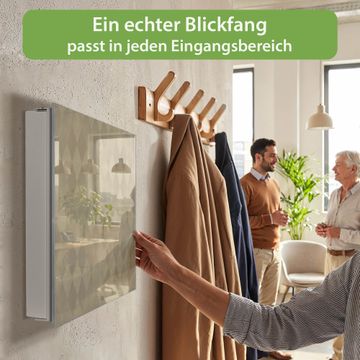 Bringe Ordnung und Eleganz in deinen Eingangsbereich mit dem banjado Schlüsselkasten Motiv Motiv Rauten Metall. Die moderne Schlüsselbox kombiniert funktionales Design mit hochwertiger Verarbeitung und wird so zu einem echten Hingucker in Flur, Büro oder Ferienwohnung. ✅ Stilvolle Schlüsselaufbewahrung mit Glasfront im Motiv Motiv Rauten Metall Der Design-Schlüsselkasten Motiv Motiv Rauten Metall bietet Platz für bis zu 50 Schlüssel, die auf 5 stabilen Reihen mit je 10 Haken übersichtlich verstaut werden. Mit seinen kompakten Maßen von 30 x 30 x 5 cm passt die Schlüsselbox perfekt auch in kleinere Räume. Der weiß lackierte Stahlkorpus mit rechts angeschlagenem Türscharnier harmoniert mit der Glasfront und fügt sich nahtlos in jedes Wohnambiente ein. Ob als Schlüsselorganizer für Zuhause oder als praktische Lösung für Büros, Praxen und Gewerbe, der banjado Schlüsselkasten sorgt für Ordnung und Übersicht. Dank der magnetischen, mit Kreidestiften beschreibbaren Glasfront kannst du Notizen anheften oder Termine direkt auf der Oberfläche festhalten. Die Schlüsselbox Motiv Motiv Rauten Metall zur Wandmontage wird inklusive Befestigungsmaterial geliefert und ist schnell angebracht. So hast du deine Schlüssel jederzeit griffbereit und zugleich stilvoll verstaut. Mit diesem banjado Schlüsselkasten Motiv Motiv Rauten Metall kombinierst du praktische Aufbewahrung mit stilvollem Wohndesign. Ob privat oder geschäftlich, die Schlüsselbox sorgt für mehr Ordnung, Übersicht und ein wohnliches Ambiente.Vorteile im Überblick