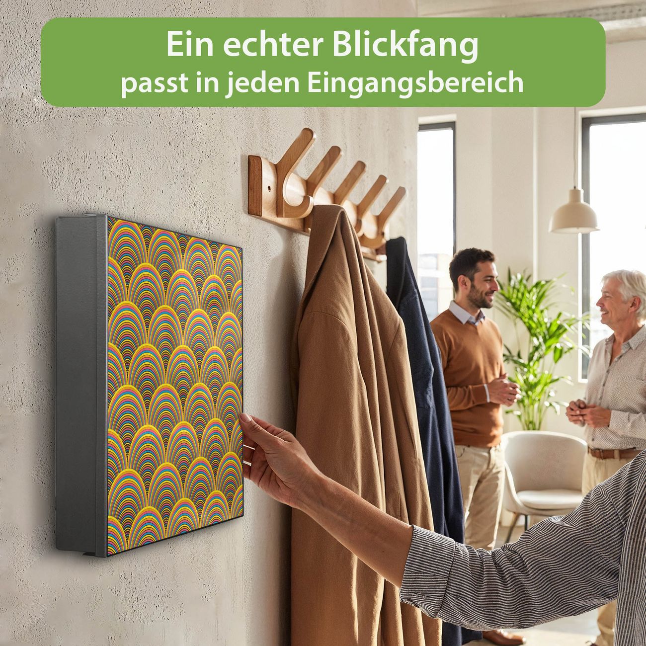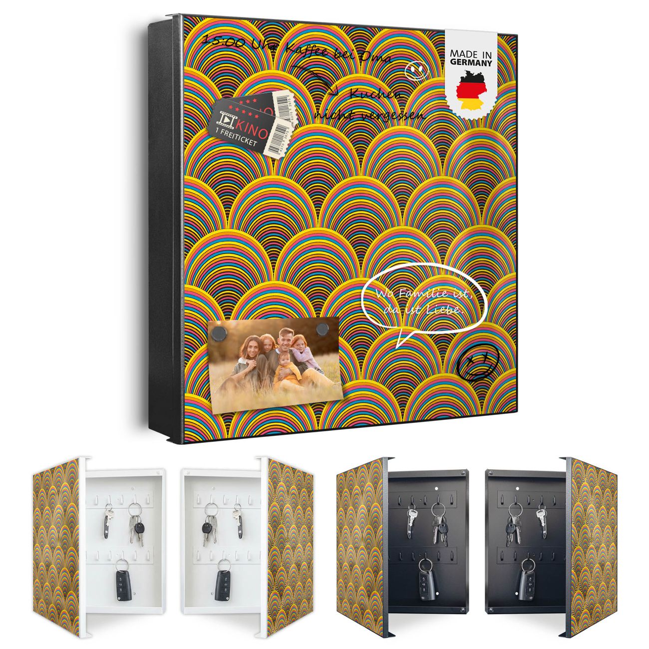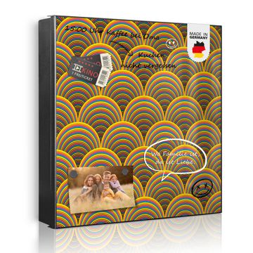 Bringe Ordnung und Eleganz in deinen Eingangsbereich mit dem banjado Schlüsselkasten Motiv Motiv Regenbögen. Die moderne Schlüsselbox kombiniert funktionales Design mit hochwertiger Verarbeitung und wird so zu einem echten Hingucker in Flur, Büro oder Ferienwohnung. ✅ Stilvolle Schlüsselaufbewahrung mit Motiv Motiv Regenbögen Der Design-Schlüsselkasten Motiv Motiv Regenbögen bietet Platz für bis zu 32 Schlüssel, die auf 4 stabilen Reihen mit je 8 Haken übersichtlich verstaut werden. Mit seinen kompakten Maßen von 30 x 30 x 5 cm passt die Schlüsselbox perfekt auch in kleinere Räume. Der schwarz lackierte Stahlkorpus mit links angeschlagenem Türscharnier harmoniert mit gedruckten Folie auf der Front und fügt sich nahtlos in jedes Wohnambiente ein. Ob als Schlüsselorganizer für Zuhause oder als praktische Lösung für Büros, Praxen und Gewerbe, der banjado Schlüsselkasten sorgt für Ordnung und Übersicht. Dank der magnetischen, mit Kreidestiften beschreibbaren Folie auf der Front kannst du Notizen anheften oder Termine direkt auf der Oberfläche festhalten. Die Schlüsselbox Motiv Motiv Regenbögen zur Wandmontage wird inklusive Befestigungsmaterial geliefert und ist schnell angebracht. So hast du deine Schlüssel jederzeit griffbereit und zugleich stilvoll verstaut. Mit diesem banjado Schlüsselkasten Motiv Motiv Regenbögen kombinierst du praktische Aufbewahrung mit stilvollem Wohndesign. Ob privat oder geschäftlich, die Schlüsselbox sorgt für mehr Ordnung, Übersicht und ein wohnliches Ambiente.Vorteile im Überblick