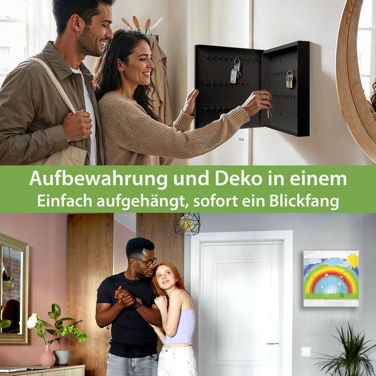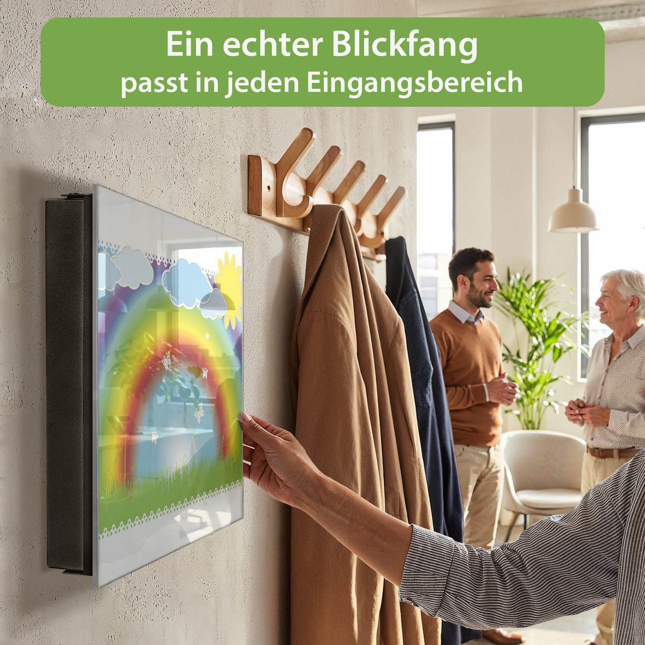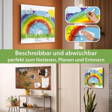 Bringe Ordnung und Eleganz in deinen Eingangsbereich mit dem banjado Schlüsselkasten Motiv Motiv Regenbogen. Die moderne Schlüsselbox kombiniert funktionales Design mit hochwertiger Verarbeitung und wird so zu einem echten Hingucker in Flur, Büro oder Ferienwohnung. ✅ Stilvolle Schlüsselaufbewahrung mit Glasfront im Motiv Motiv Regenbogen Der Design-Schlüsselkasten Motiv Motiv Regenbogen bietet Platz für bis zu 50 Schlüssel, die auf 5 stabilen Reihen mit je 10 Haken übersichtlich verstaut werden. Mit seinen kompakten Maßen von 30 x 30 x 5 cm passt die Schlüsselbox perfekt auch in kleinere Räume. Der schwarz lackierte Stahlkorpus mit rechts angeschlagenem Türscharnier harmoniert mit der Glasfront und fügt sich nahtlos in jedes Wohnambiente ein. Ob als Schlüsselorganizer für Zuhause oder als praktische Lösung für Büros, Praxen und Gewerbe, der banjado Schlüsselkasten sorgt für Ordnung und Übersicht. Dank der magnetischen, mit Kreidestiften beschreibbaren Glasfront kannst du Notizen anheften oder Termine direkt auf der Oberfläche festhalten. Die Schlüsselbox Motiv Motiv Regenbogen zur Wandmontage wird inklusive Befestigungsmaterial geliefert und ist schnell angebracht. So hast du deine Schlüssel jederzeit griffbereit und zugleich stilvoll verstaut. Mit diesem banjado Schlüsselkasten Motiv Motiv Regenbogen kombinierst du praktische Aufbewahrung mit stilvollem Wohndesign. Ob privat oder geschäftlich, die Schlüsselbox sorgt für mehr Ordnung, Übersicht und ein wohnliches Ambiente.Vorteile im Überblick