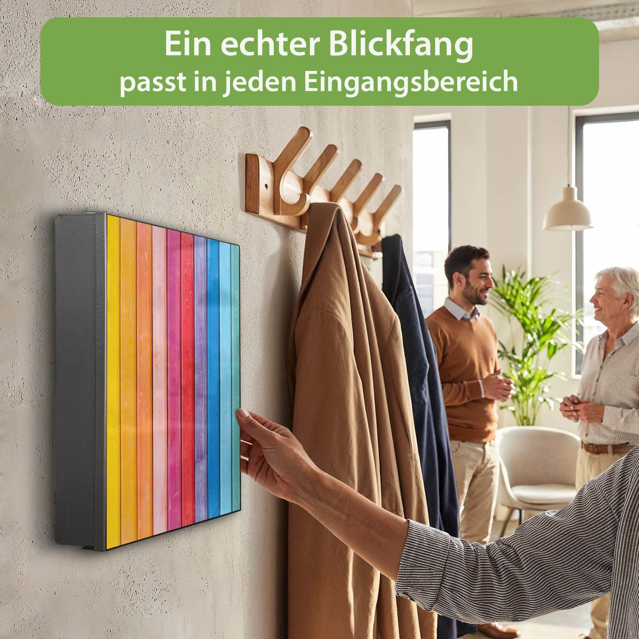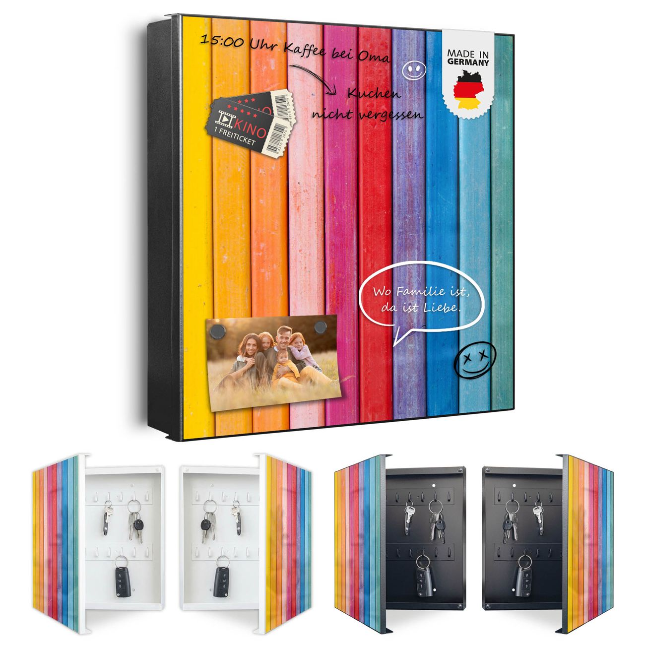 Bringe Ordnung und Eleganz in deinen Eingangsbereich mit dem banjado Schlüsselkasten Motiv Motiv Regenbogenfarben. Die moderne Schlüsselbox kombiniert funktionales Design mit hochwertiger Verarbeitung und wird so zu einem echten Hingucker in Flur, Büro oder Ferienwohnung. ✅ Stilvolle Schlüsselaufbewahrung mit Motiv Motiv Regenbogenfarben Der Design-Schlüsselkasten Motiv Motiv Regenbogenfarben bietet Platz für bis zu 32 Schlüssel, die auf 4 stabilen Reihen mit je 8 Haken übersichtlich verstaut werden. Mit seinen kompakten Maßen von 30 x 30 x 5 cm passt die Schlüsselbox perfekt auch in kleinere Räume. Der schwarz lackierte Stahlkorpus mit rechts angeschlagenem Türscharnier harmoniert mit gedruckten Folie auf der Front und fügt sich nahtlos in jedes Wohnambiente ein. Ob als Schlüsselorganizer für Zuhause oder als praktische Lösung für Büros, Praxen und Gewerbe, der banjado Schlüsselkasten sorgt für Ordnung und Übersicht. Dank der magnetischen, mit Kreidestiften beschreibbaren Folie auf der Front kannst du Notizen anheften oder Termine direkt auf der Oberfläche festhalten. Die Schlüsselbox Motiv Motiv Regenbogenfarben zur Wandmontage wird inklusive Befestigungsmaterial geliefert und ist schnell angebracht. So hast du deine Schlüssel jederzeit griffbereit und zugleich stilvoll verstaut. Mit diesem banjado Schlüsselkasten Motiv Motiv Regenbogenfarben kombinierst du praktische Aufbewahrung mit stilvollem Wohndesign. Ob privat oder geschäftlich, die Schlüsselbox sorgt für mehr Ordnung, Übersicht und ein wohnliches Ambiente.Vorteile im Überblick