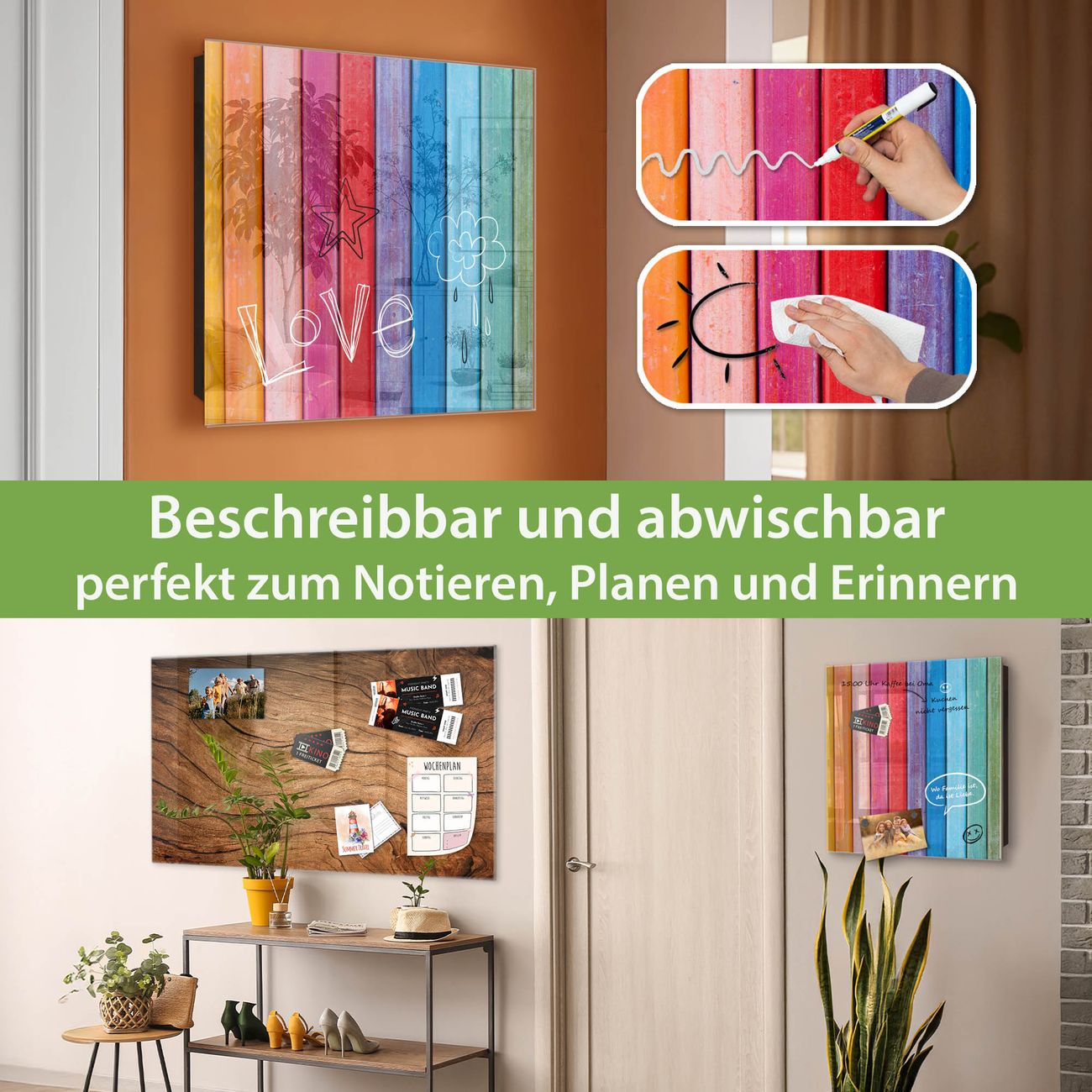Bringe Ordnung und Eleganz in deinen Eingangsbereich mit dem banjado Schlüsselkasten Motiv Motiv Regenbogenfarben. Die moderne Schlüsselbox kombiniert funktionales Design mit hochwertiger Verarbeitung und wird so zu einem echten Hingucker in Flur, Büro oder Ferienwohnung. ✅ Stilvolle Schlüsselaufbewahrung mit Glasfront im Motiv Motiv Regenbogenfarben Der Design-Schlüsselkasten Motiv Motiv Regenbogenfarben bietet Platz für bis zu 50 Schlüssel, die auf 5 stabilen Reihen mit je 10 Haken übersichtlich verstaut werden. Mit seinen kompakten Maßen von 30 x 30 x 5 cm passt die Schlüsselbox perfekt auch in kleinere Räume. Der schwarz lackierte Stahlkorpus mit rechts angeschlagenem Türscharnier harmoniert mit der Glasfront und fügt sich nahtlos in jedes Wohnambiente ein. Ob als Schlüsselorganizer für Zuhause oder als praktische Lösung für Büros, Praxen und Gewerbe, der banjado Schlüsselkasten sorgt für Ordnung und Übersicht. Dank der magnetischen, mit Kreidestiften beschreibbaren Glasfront kannst du Notizen anheften oder Termine direkt auf der Oberfläche festhalten. Die Schlüsselbox Motiv Motiv Regenbogenfarben zur Wandmontage wird inklusive Befestigungsmaterial geliefert und ist schnell angebracht. So hast du deine Schlüssel jederzeit griffbereit und zugleich stilvoll verstaut. Mit diesem banjado Schlüsselkasten Motiv Motiv Regenbogenfarben kombinierst du praktische Aufbewahrung mit stilvollem Wohndesign. Ob privat oder geschäftlich, die Schlüsselbox sorgt für mehr Ordnung, Übersicht und ein wohnliches Ambiente.Vorteile im Überblick