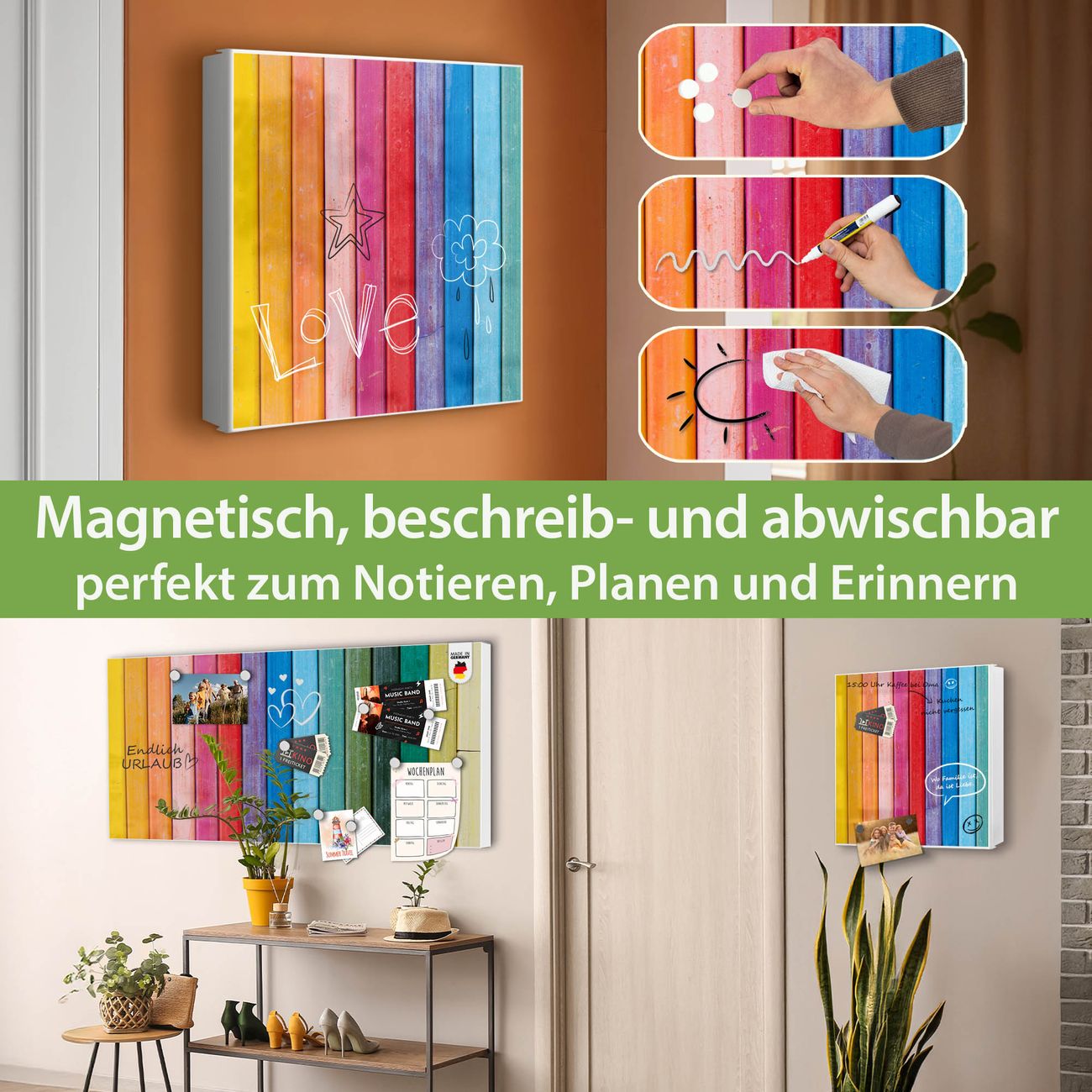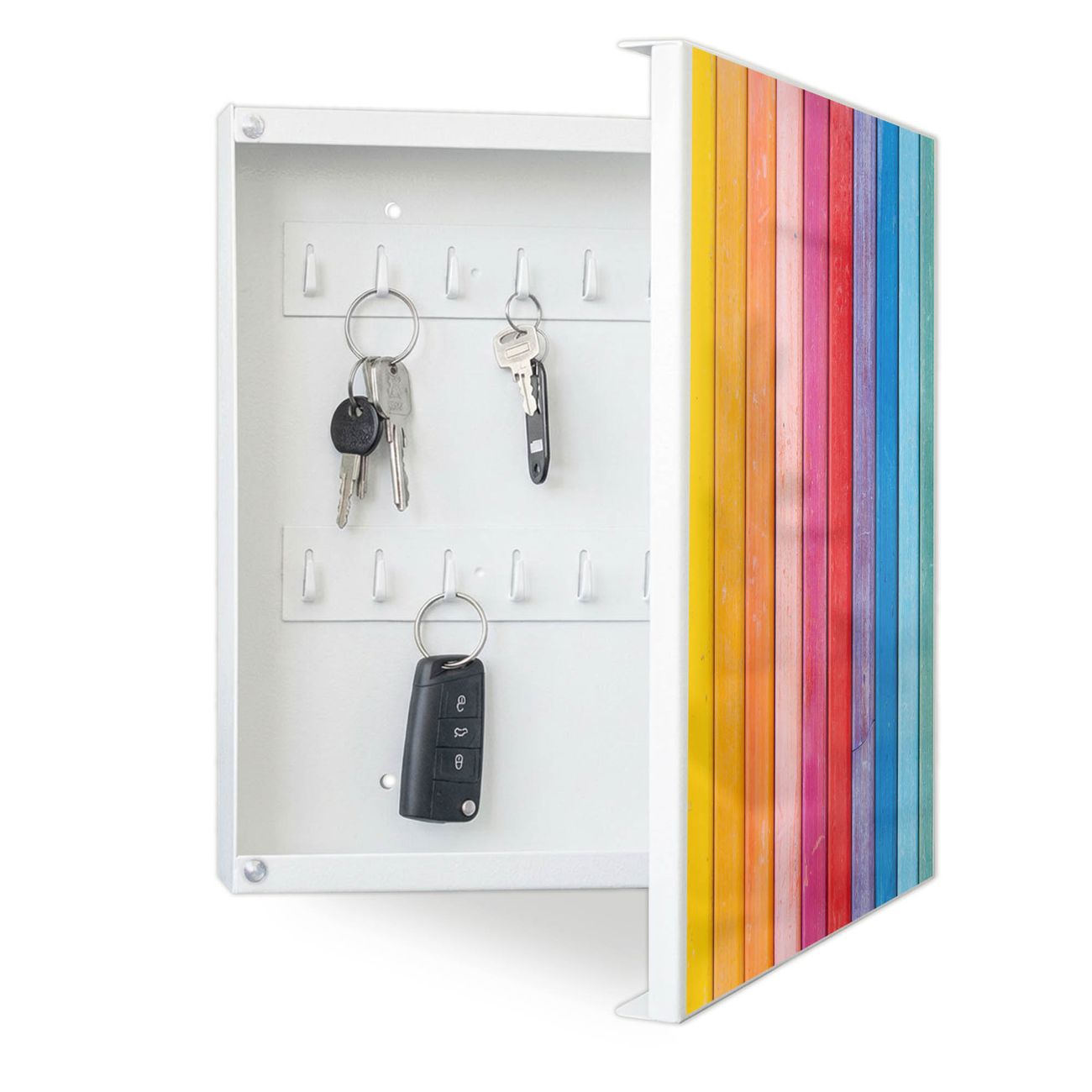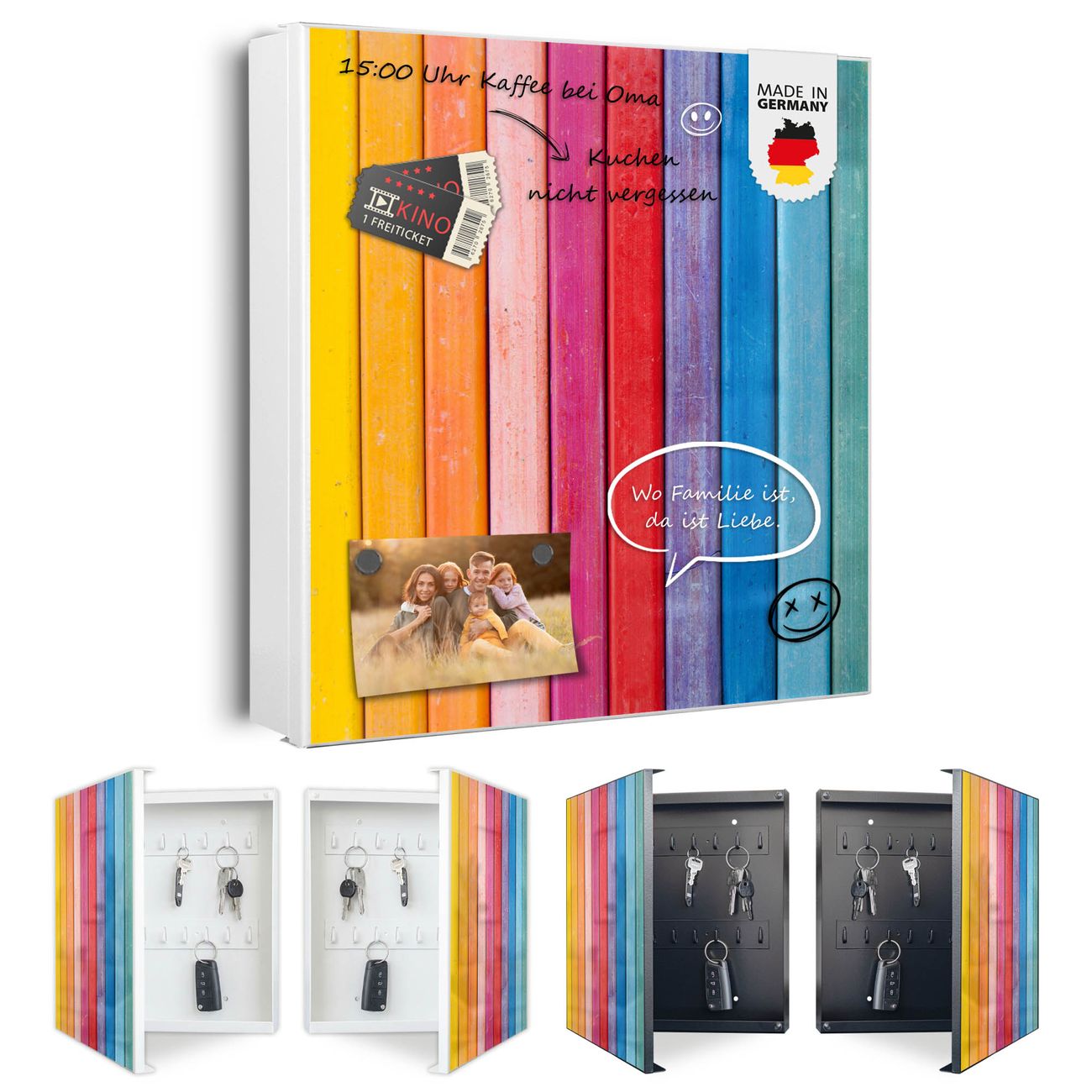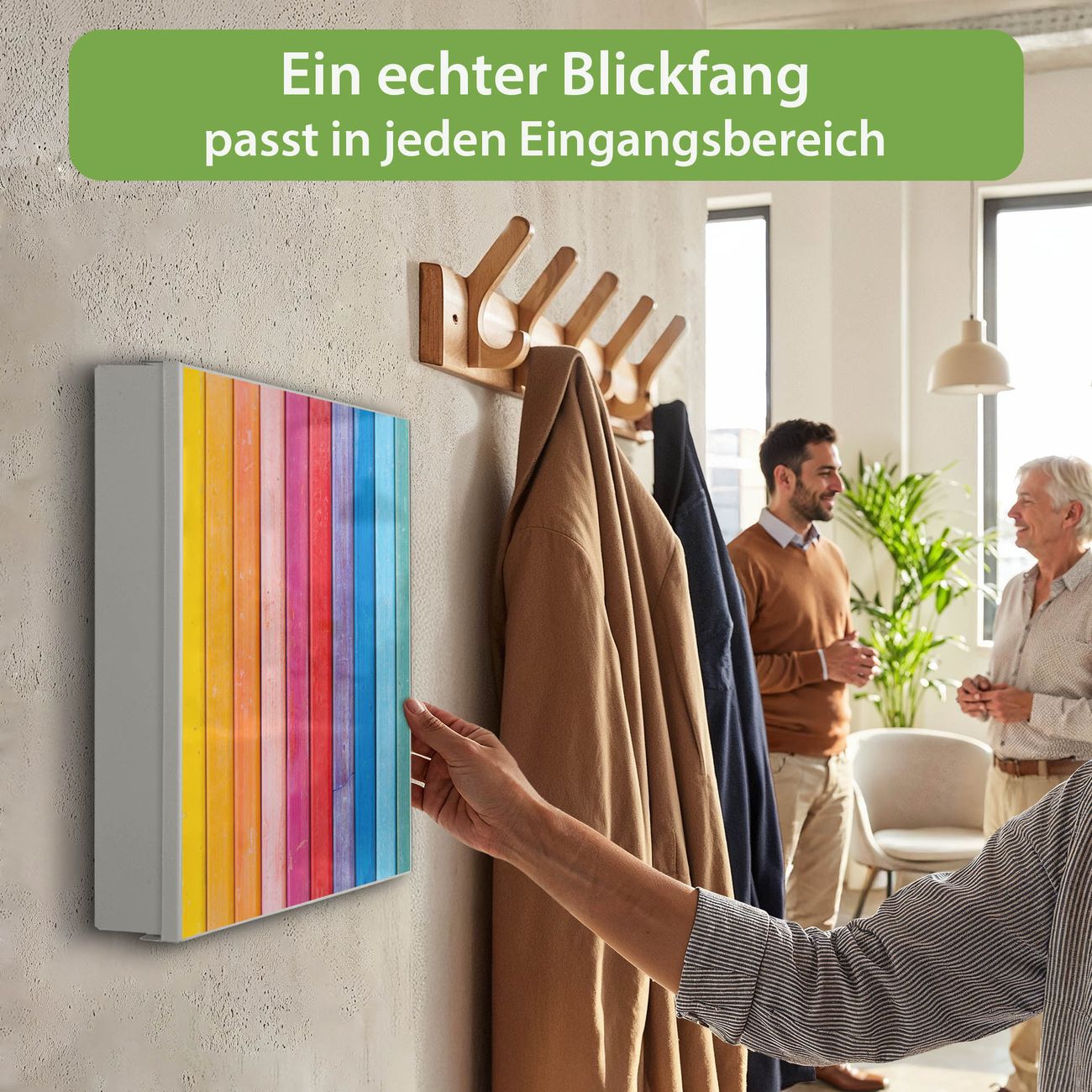 Bringe Ordnung und Eleganz in deinen Eingangsbereich mit dem banjado Schlüsselkasten Motiv Motiv Regenbogenfarben. Die moderne Schlüsselbox kombiniert funktionales Design mit hochwertiger Verarbeitung und wird so zu einem echten Hingucker in Flur, Büro oder Ferienwohnung. ✅ Stilvolle Schlüsselaufbewahrung mit Motiv Motiv Regenbogenfarben Der Design-Schlüsselkasten Motiv Motiv Regenbogenfarben bietet Platz für bis zu 32 Schlüssel, die auf 4 stabilen Reihen mit je 8 Haken übersichtlich verstaut werden. Mit seinen kompakten Maßen von 30 x 30 x 5 cm passt die Schlüsselbox perfekt auch in kleinere Räume. Der weiß lackierte Stahlkorpus mit rechts angeschlagenem Türscharnier harmoniert mit gedruckten Folie auf der Front und fügt sich nahtlos in jedes Wohnambiente ein. Ob als Schlüsselorganizer für Zuhause oder als praktische Lösung für Büros, Praxen und Gewerbe, der banjado Schlüsselkasten sorgt für Ordnung und Übersicht. Dank der magnetischen, mit Kreidestiften beschreibbaren Folie auf der Front kannst du Notizen anheften oder Termine direkt auf der Oberfläche festhalten. Die Schlüsselbox Motiv Motiv Regenbogenfarben zur Wandmontage wird inklusive Befestigungsmaterial geliefert und ist schnell angebracht. So hast du deine Schlüssel jederzeit griffbereit und zugleich stilvoll verstaut. Mit diesem banjado Schlüsselkasten Motiv Motiv Regenbogenfarben kombinierst du praktische Aufbewahrung mit stilvollem Wohndesign. Ob privat oder geschäftlich, die Schlüsselbox sorgt für mehr Ordnung, Übersicht und ein wohnliches Ambiente.Vorteile im Überblick