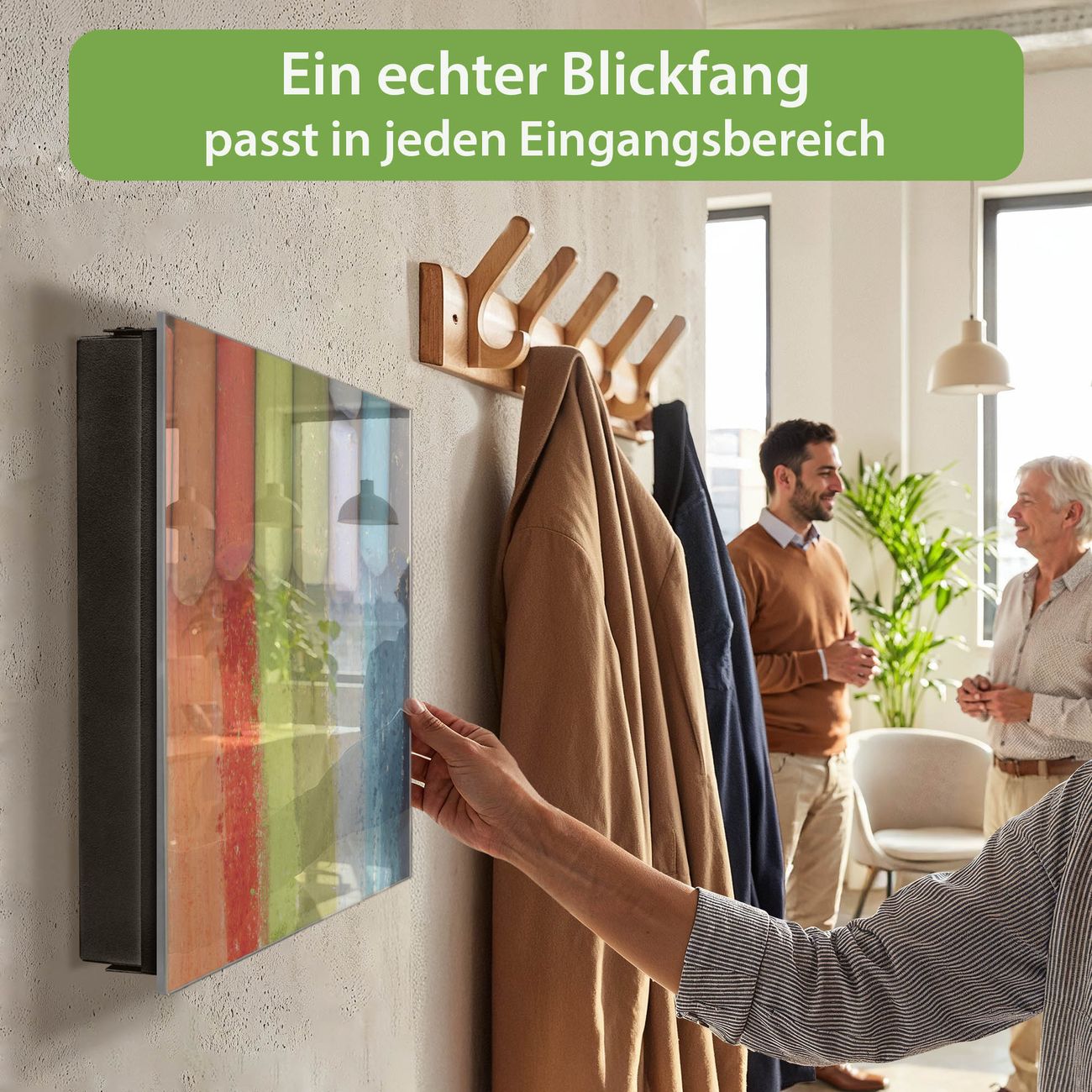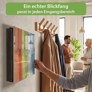 Bringe Ordnung und Eleganz in deinen Eingangsbereich mit dem banjado Schlüsselkasten Motiv Motiv Regenbogenkreide. Die moderne Schlüsselbox kombiniert funktionales Design mit hochwertiger Verarbeitung und wird so zu einem echten Hingucker in Flur, Büro oder Ferienwohnung. ✅ Stilvolle Schlüsselaufbewahrung mit Glasfront im Motiv Motiv Regenbogenkreide Der Design-Schlüsselkasten Motiv Motiv Regenbogenkreide bietet Platz für bis zu 50 Schlüssel, die auf 5 stabilen Reihen mit je 10 Haken übersichtlich verstaut werden. Mit seinen kompakten Maßen von 30 x 30 x 5 cm passt die Schlüsselbox perfekt auch in kleinere Räume. Der schwarz lackierte Stahlkorpus mit rechts angeschlagenem Türscharnier harmoniert mit der Glasfront und fügt sich nahtlos in jedes Wohnambiente ein. Ob als Schlüsselorganizer für Zuhause oder als praktische Lösung für Büros, Praxen und Gewerbe, der banjado Schlüsselkasten sorgt für Ordnung und Übersicht. Dank der magnetischen, mit Kreidestiften beschreibbaren Glasfront kannst du Notizen anheften oder Termine direkt auf der Oberfläche festhalten. Die Schlüsselbox Motiv Motiv Regenbogenkreide zur Wandmontage wird inklusive Befestigungsmaterial geliefert und ist schnell angebracht. So hast du deine Schlüssel jederzeit griffbereit und zugleich stilvoll verstaut. Mit diesem banjado Schlüsselkasten Motiv Motiv Regenbogenkreide kombinierst du praktische Aufbewahrung mit stilvollem Wohndesign. Ob privat oder geschäftlich, die Schlüsselbox sorgt für mehr Ordnung, Übersicht und ein wohnliches Ambiente.Vorteile im Überblick