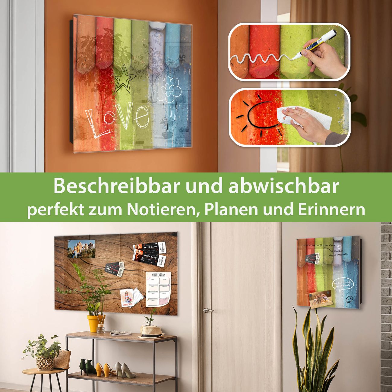 ✅ Magnetisch und mit Kreidestift beschreibbar, gehärtetes Glas, links angeschlagene TürOrdnung und Design in einem