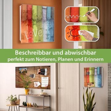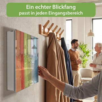 Bringe Ordnung und Eleganz in deinen Eingangsbereich mit dem banjado Schlüsselkasten Motiv Motiv Regenbogenkreide. Die moderne Schlüsselbox kombiniert funktionales Design mit hochwertiger Verarbeitung und wird so zu einem echten Hingucker in Flur, Büro oder Ferienwohnung. ✅ Stilvolle Schlüsselaufbewahrung mit Glasfront im Motiv Motiv Regenbogenkreide Der Design-Schlüsselkasten Motiv Motiv Regenbogenkreide bietet Platz für bis zu 50 Schlüssel, die auf 5 stabilen Reihen mit je 10 Haken übersichtlich verstaut werden. Mit seinen kompakten Maßen von 30 x 30 x 5 cm passt die Schlüsselbox perfekt auch in kleinere Räume. Der weiß lackierte Stahlkorpus mit rechts angeschlagenem Türscharnier harmoniert mit der Glasfront und fügt sich nahtlos in jedes Wohnambiente ein. Ob als Schlüsselorganizer für Zuhause oder als praktische Lösung für Büros, Praxen und Gewerbe, der banjado Schlüsselkasten sorgt für Ordnung und Übersicht. Dank der magnetischen, mit Kreidestiften beschreibbaren Glasfront kannst du Notizen anheften oder Termine direkt auf der Oberfläche festhalten. Die Schlüsselbox Motiv Motiv Regenbogenkreide zur Wandmontage wird inklusive Befestigungsmaterial geliefert und ist schnell angebracht. So hast du deine Schlüssel jederzeit griffbereit und zugleich stilvoll verstaut. Mit diesem banjado Schlüsselkasten Motiv Motiv Regenbogenkreide kombinierst du praktische Aufbewahrung mit stilvollem Wohndesign. Ob privat oder geschäftlich, die Schlüsselbox sorgt für mehr Ordnung, Übersicht und ein wohnliches Ambiente.Vorteile im Überblick