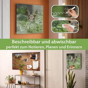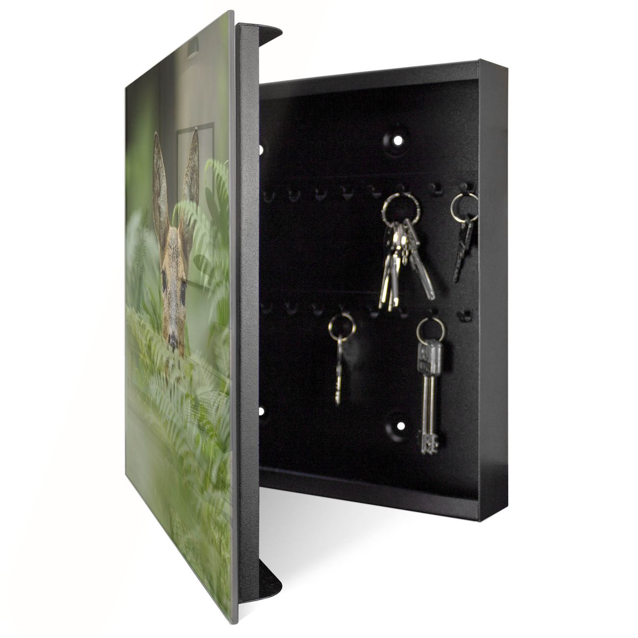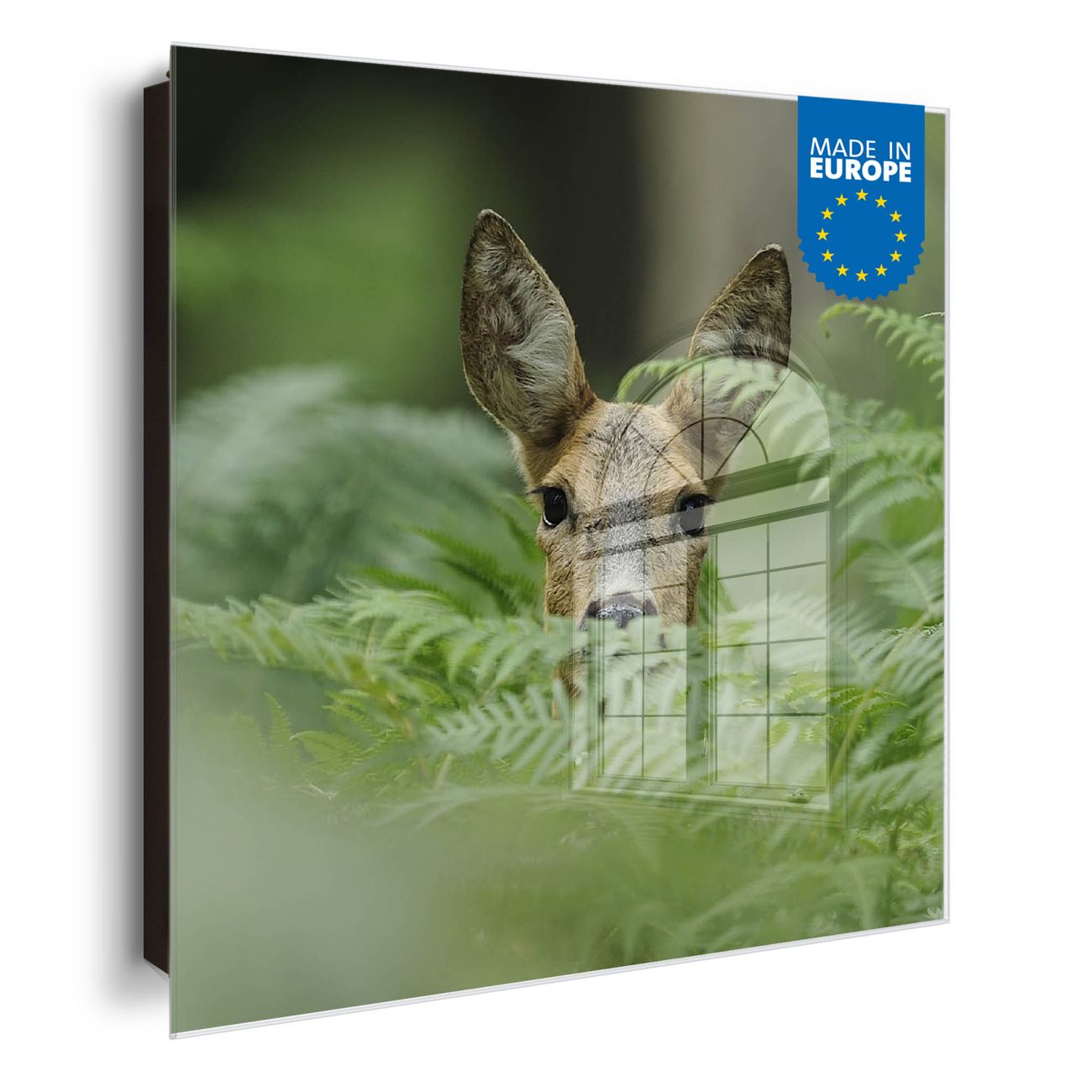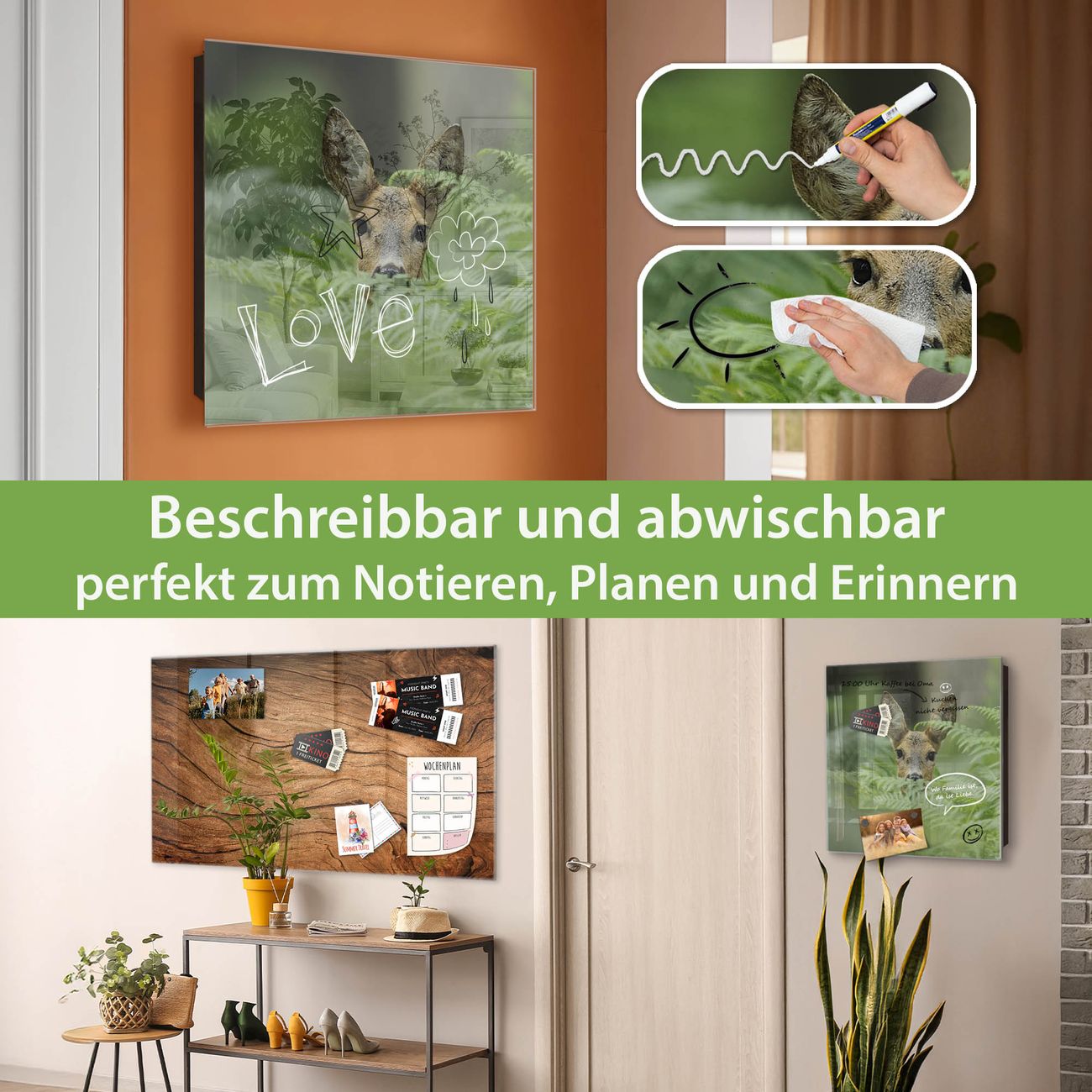 Bringe Ordnung und Eleganz in deinen Eingangsbereich mit dem banjado Schlüsselkasten Motiv Motiv Reh. Die moderne Schlüsselbox kombiniert funktionales Design mit hochwertiger Verarbeitung und wird so zu einem echten Hingucker in Flur, Büro oder Ferienwohnung. ✅ Stilvolle Schlüsselaufbewahrung mit Glasfront im Motiv Motiv Reh Der Design-Schlüsselkasten Motiv Motiv Reh bietet Platz für bis zu 50 Schlüssel, die auf 5 stabilen Reihen mit je 10 Haken übersichtlich verstaut werden. Mit seinen kompakten Maßen von 30 x 30 x 5 cm passt die Schlüsselbox perfekt auch in kleinere Räume. Der schwarz lackierte Stahlkorpus mit rechts angeschlagenem Türscharnier harmoniert mit der Glasfront und fügt sich nahtlos in jedes Wohnambiente ein. Ob als Schlüsselorganizer für Zuhause oder als praktische Lösung für Büros, Praxen und Gewerbe, der banjado Schlüsselkasten sorgt für Ordnung und Übersicht. Dank der magnetischen, mit Kreidestiften beschreibbaren Glasfront kannst du Notizen anheften oder Termine direkt auf der Oberfläche festhalten. Die Schlüsselbox Motiv Motiv Reh zur Wandmontage wird inklusive Befestigungsmaterial geliefert und ist schnell angebracht. So hast du deine Schlüssel jederzeit griffbereit und zugleich stilvoll verstaut. Mit diesem banjado Schlüsselkasten Motiv Motiv Reh kombinierst du praktische Aufbewahrung mit stilvollem Wohndesign. Ob privat oder geschäftlich, die Schlüsselbox sorgt für mehr Ordnung, Übersicht und ein wohnliches Ambiente.Vorteile im Überblick