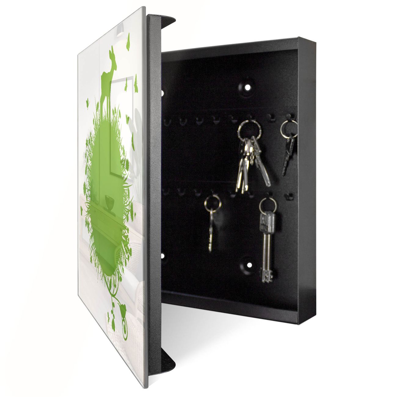 Bringe Ordnung und Eleganz in deinen Eingangsbereich mit dem banjado Schlüsselkasten Motiv Motiv Rehkitz . Die moderne Schlüsselbox kombiniert funktionales Design mit hochwertiger Verarbeitung und wird so zu einem echten Hingucker in Flur, Büro oder Ferienwohnung. ✅ Stilvolle Schlüsselaufbewahrung mit Glasfront im Motiv Motiv Rehkitz Der Design-Schlüsselkasten Motiv Motiv Rehkitz bietet Platz für bis zu 50 Schlüssel, die auf 5 stabilen Reihen mit je 10 Haken übersichtlich verstaut werden. Mit seinen kompakten Maßen von 30 x 30 x 5 cm passt die Schlüsselbox perfekt auch in kleinere Räume. Der schwarz lackierte Stahlkorpus mit rechts angeschlagenem Türscharnier harmoniert mit der Glasfront und fügt sich nahtlos in jedes Wohnambiente ein. Ob als Schlüsselorganizer für Zuhause oder als praktische Lösung für Büros, Praxen und Gewerbe, der banjado Schlüsselkasten sorgt für Ordnung und Übersicht. Dank der magnetischen, mit Kreidestiften beschreibbaren Glasfront kannst du Notizen anheften oder Termine direkt auf der Oberfläche festhalten. Die Schlüsselbox Motiv Motiv Rehkitz zur Wandmontage wird inklusive Befestigungsmaterial geliefert und ist schnell angebracht. So hast du deine Schlüssel jederzeit griffbereit und zugleich stilvoll verstaut. Mit diesem banjado Schlüsselkasten Motiv Motiv Rehkitz kombinierst du praktische Aufbewahrung mit stilvollem Wohndesign. Ob privat oder geschäftlich, die Schlüsselbox sorgt für mehr Ordnung, Übersicht und ein wohnliches Ambiente.Vorteile im Überblick