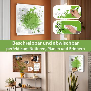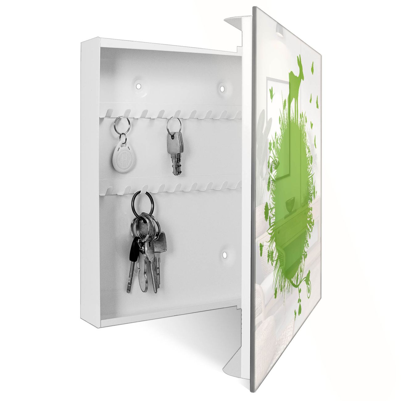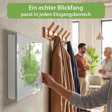 Bringe Ordnung und Eleganz in deinen Eingangsbereich mit dem banjado Schlüsselkasten Motiv Motiv Rehkitz . Die moderne Schlüsselbox kombiniert funktionales Design mit hochwertiger Verarbeitung und wird so zu einem echten Hingucker in Flur, Büro oder Ferienwohnung. ✅ Stilvolle Schlüsselaufbewahrung mit Glasfront im Motiv Motiv Rehkitz Der Design-Schlüsselkasten Motiv Motiv Rehkitz bietet Platz für bis zu 50 Schlüssel, die auf 5 stabilen Reihen mit je 10 Haken übersichtlich verstaut werden. Mit seinen kompakten Maßen von 30 x 30 x 5 cm passt die Schlüsselbox perfekt auch in kleinere Räume. Der weiß lackierte Stahlkorpus mit rechts angeschlagenem Türscharnier harmoniert mit der Glasfront und fügt sich nahtlos in jedes Wohnambiente ein. Ob als Schlüsselorganizer für Zuhause oder als praktische Lösung für Büros, Praxen und Gewerbe, der banjado Schlüsselkasten sorgt für Ordnung und Übersicht. Dank der magnetischen, mit Kreidestiften beschreibbaren Glasfront kannst du Notizen anheften oder Termine direkt auf der Oberfläche festhalten. Die Schlüsselbox Motiv Motiv Rehkitz zur Wandmontage wird inklusive Befestigungsmaterial geliefert und ist schnell angebracht. So hast du deine Schlüssel jederzeit griffbereit und zugleich stilvoll verstaut. Mit diesem banjado Schlüsselkasten Motiv Motiv Rehkitz kombinierst du praktische Aufbewahrung mit stilvollem Wohndesign. Ob privat oder geschäftlich, die Schlüsselbox sorgt für mehr Ordnung, Übersicht und ein wohnliches Ambiente.Vorteile im Überblick