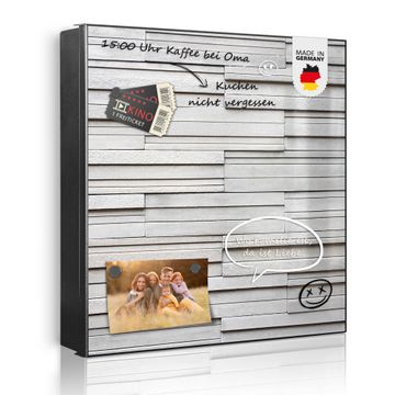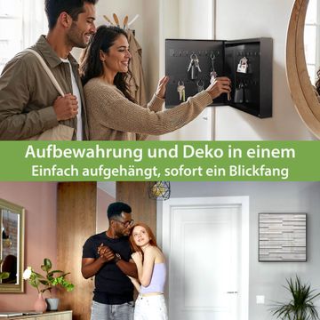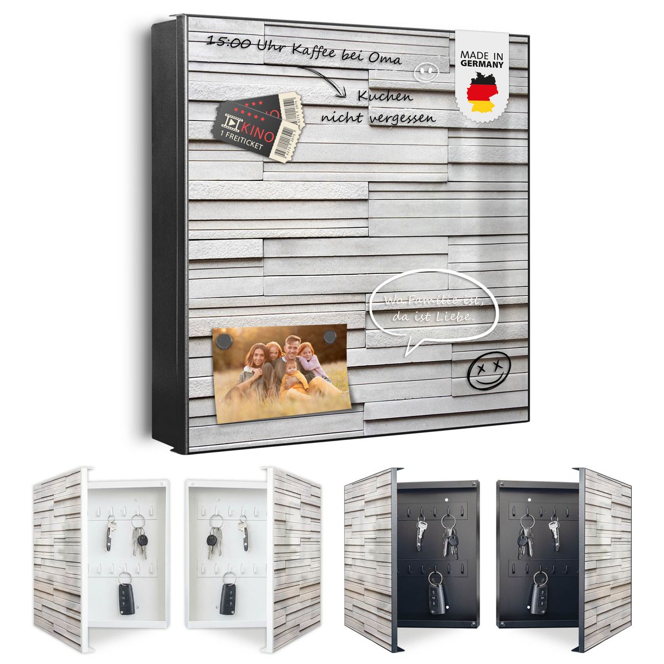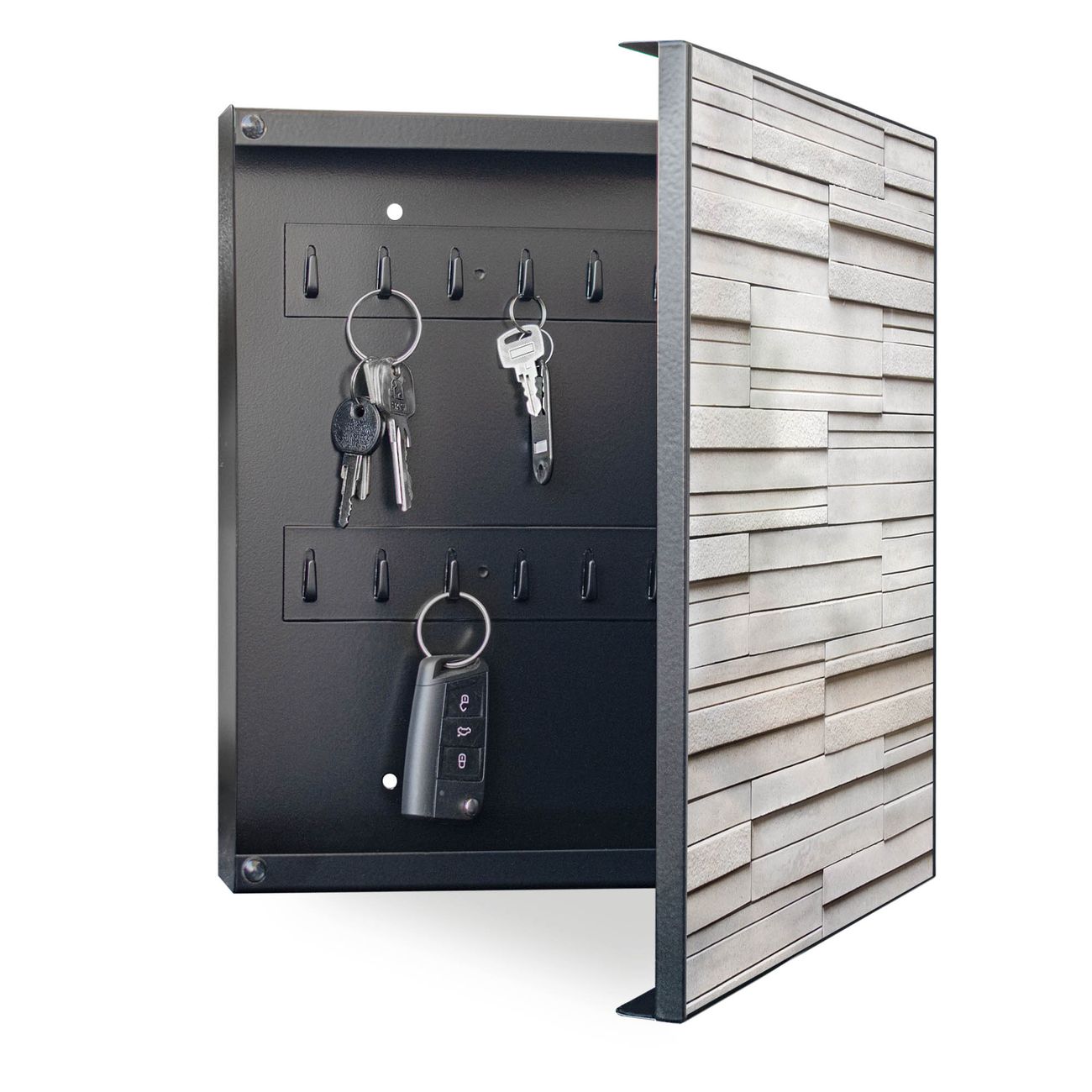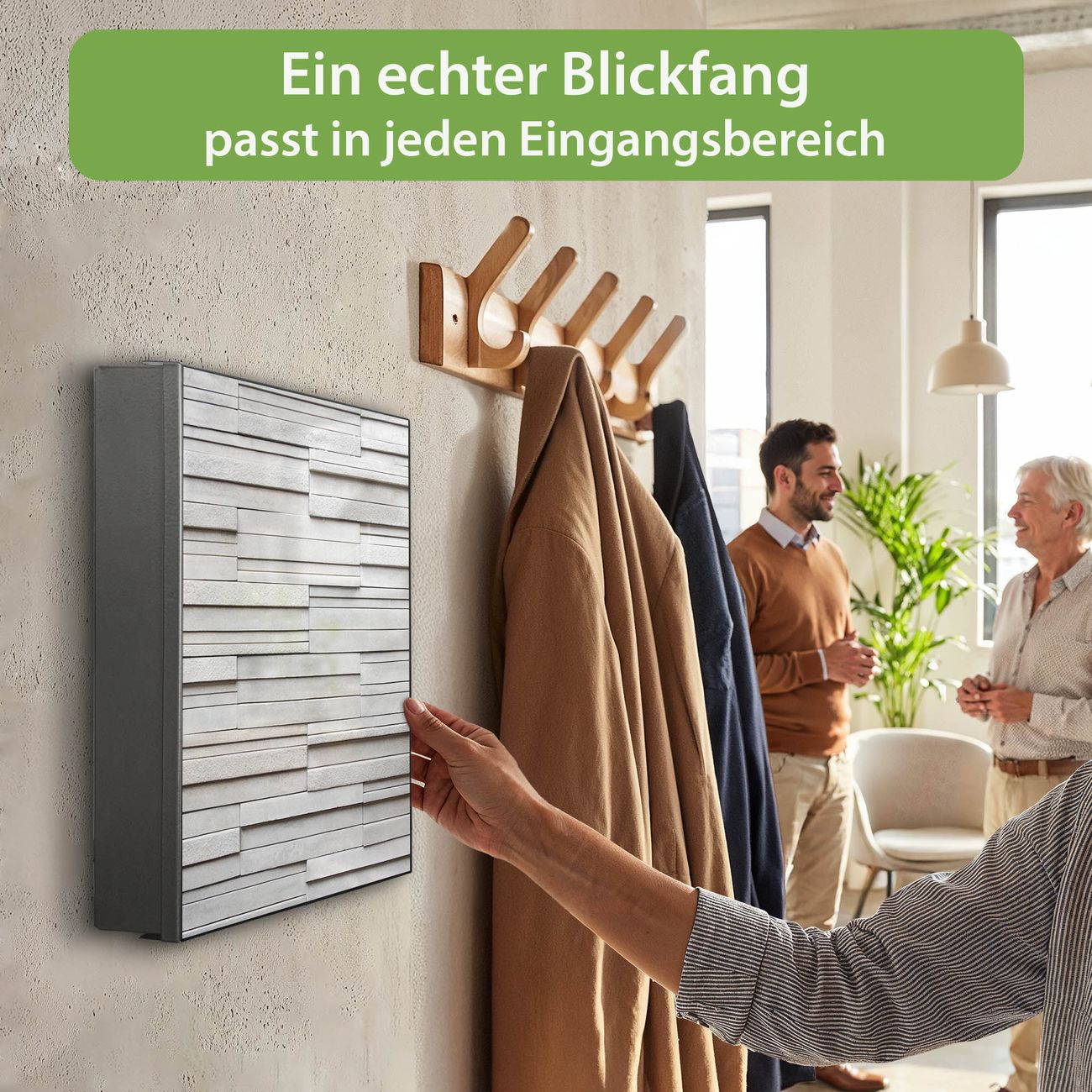Bringe Ordnung und Eleganz in deinen Eingangsbereich mit dem banjado Schlüsselkasten Motiv Motiv Relief. Die moderne Schlüsselbox kombiniert funktionales Design mit hochwertiger Verarbeitung und wird so zu einem echten Hingucker in Flur, Büro oder Ferienwohnung. ✅ Stilvolle Schlüsselaufbewahrung mit Motiv Motiv Relief Der Design-Schlüsselkasten Motiv Motiv Relief bietet Platz für bis zu 32 Schlüssel, die auf 4 stabilen Reihen mit je 8 Haken übersichtlich verstaut werden. Mit seinen kompakten Maßen von 30 x 30 x 5 cm passt die Schlüsselbox perfekt auch in kleinere Räume. Der schwarz lackierte Stahlkorpus mit rechts angeschlagenem Türscharnier harmoniert mit gedruckten Folie auf der Front und fügt sich nahtlos in jedes Wohnambiente ein. Ob als Schlüsselorganizer für Zuhause oder als praktische Lösung für Büros, Praxen und Gewerbe, der banjado Schlüsselkasten sorgt für Ordnung und Übersicht. Dank der magnetischen, mit Kreidestiften beschreibbaren Folie auf der Front kannst du Notizen anheften oder Termine direkt auf der Oberfläche festhalten. Die Schlüsselbox Motiv Motiv Relief zur Wandmontage wird inklusive Befestigungsmaterial geliefert und ist schnell angebracht. So hast du deine Schlüssel jederzeit griffbereit und zugleich stilvoll verstaut. Mit diesem banjado Schlüsselkasten Motiv Motiv Relief kombinierst du praktische Aufbewahrung mit stilvollem Wohndesign. Ob privat oder geschäftlich, die Schlüsselbox sorgt für mehr Ordnung, Übersicht und ein wohnliches Ambiente.Vorteile im Überblick