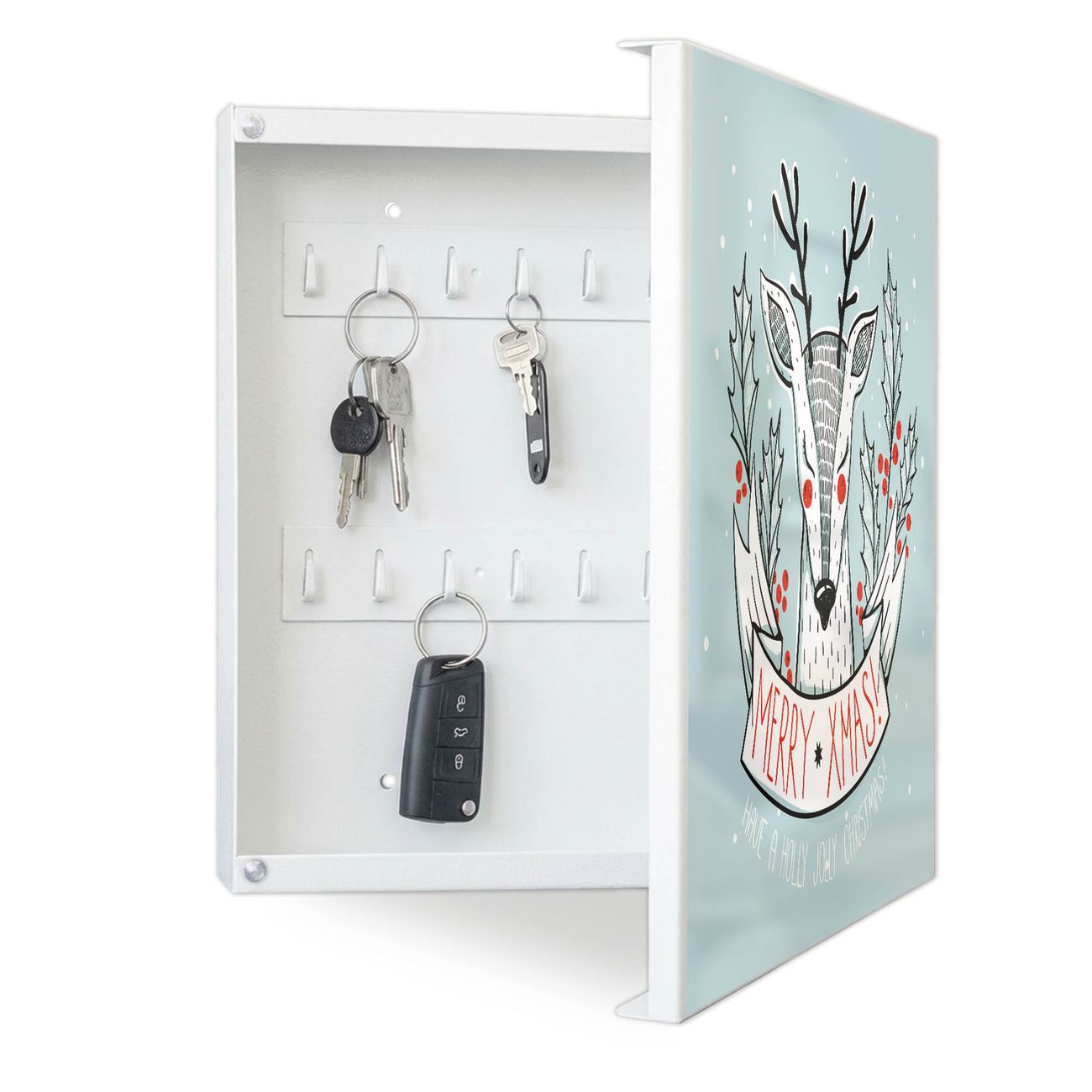 Bringe Ordnung und Eleganz in deinen Eingangsbereich mit dem banjado Schlüsselkasten Motiv Motiv Rentier. Die moderne Schlüsselbox kombiniert funktionales Design mit hochwertiger Verarbeitung und wird so zu einem echten Hingucker in Flur, Büro oder Ferienwohnung. ✅ Stilvolle Schlüsselaufbewahrung mit Motiv Motiv Rentier Der Design-Schlüsselkasten Motiv Motiv Rentier bietet Platz für bis zu 32 Schlüssel, die auf 4 stabilen Reihen mit je 8 Haken übersichtlich verstaut werden. Mit seinen kompakten Maßen von 30 x 30 x 5 cm passt die Schlüsselbox perfekt auch in kleinere Räume. Der weiß lackierte Stahlkorpus mit rechts angeschlagenem Türscharnier harmoniert mit gedruckten Folie auf der Front und fügt sich nahtlos in jedes Wohnambiente ein. Ob als Schlüsselorganizer für Zuhause oder als praktische Lösung für Büros, Praxen und Gewerbe, der banjado Schlüsselkasten sorgt für Ordnung und Übersicht. Dank der magnetischen, mit Kreidestiften beschreibbaren Folie auf der Front kannst du Notizen anheften oder Termine direkt auf der Oberfläche festhalten. Die Schlüsselbox Motiv Motiv Rentier zur Wandmontage wird inklusive Befestigungsmaterial geliefert und ist schnell angebracht. So hast du deine Schlüssel jederzeit griffbereit und zugleich stilvoll verstaut. Mit diesem banjado Schlüsselkasten Motiv Motiv Rentier kombinierst du praktische Aufbewahrung mit stilvollem Wohndesign. Ob privat oder geschäftlich, die Schlüsselbox sorgt für mehr Ordnung, Übersicht und ein wohnliches Ambiente.Vorteile im Überblick