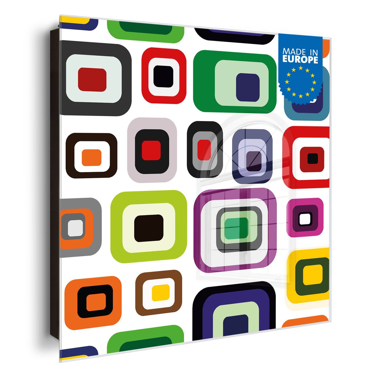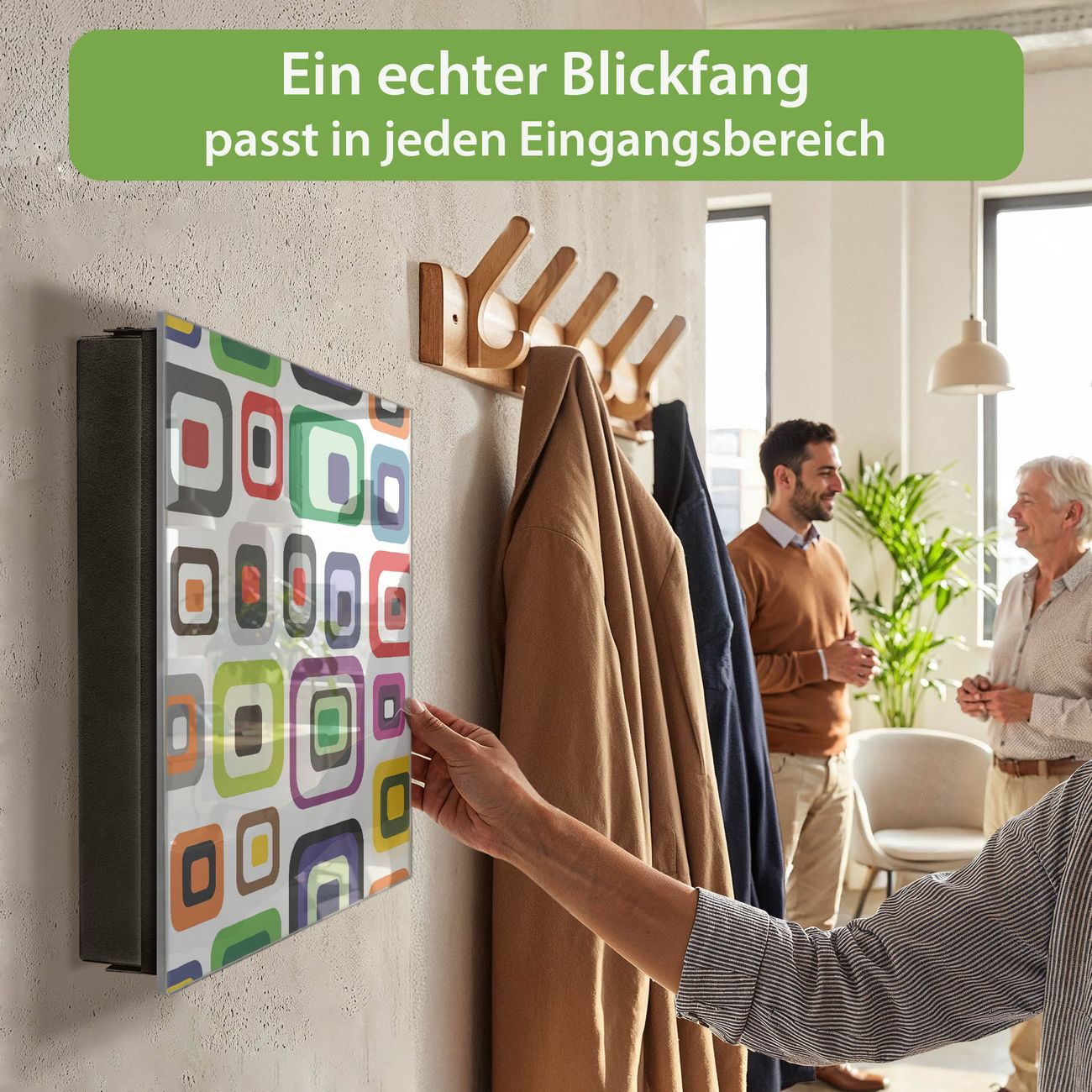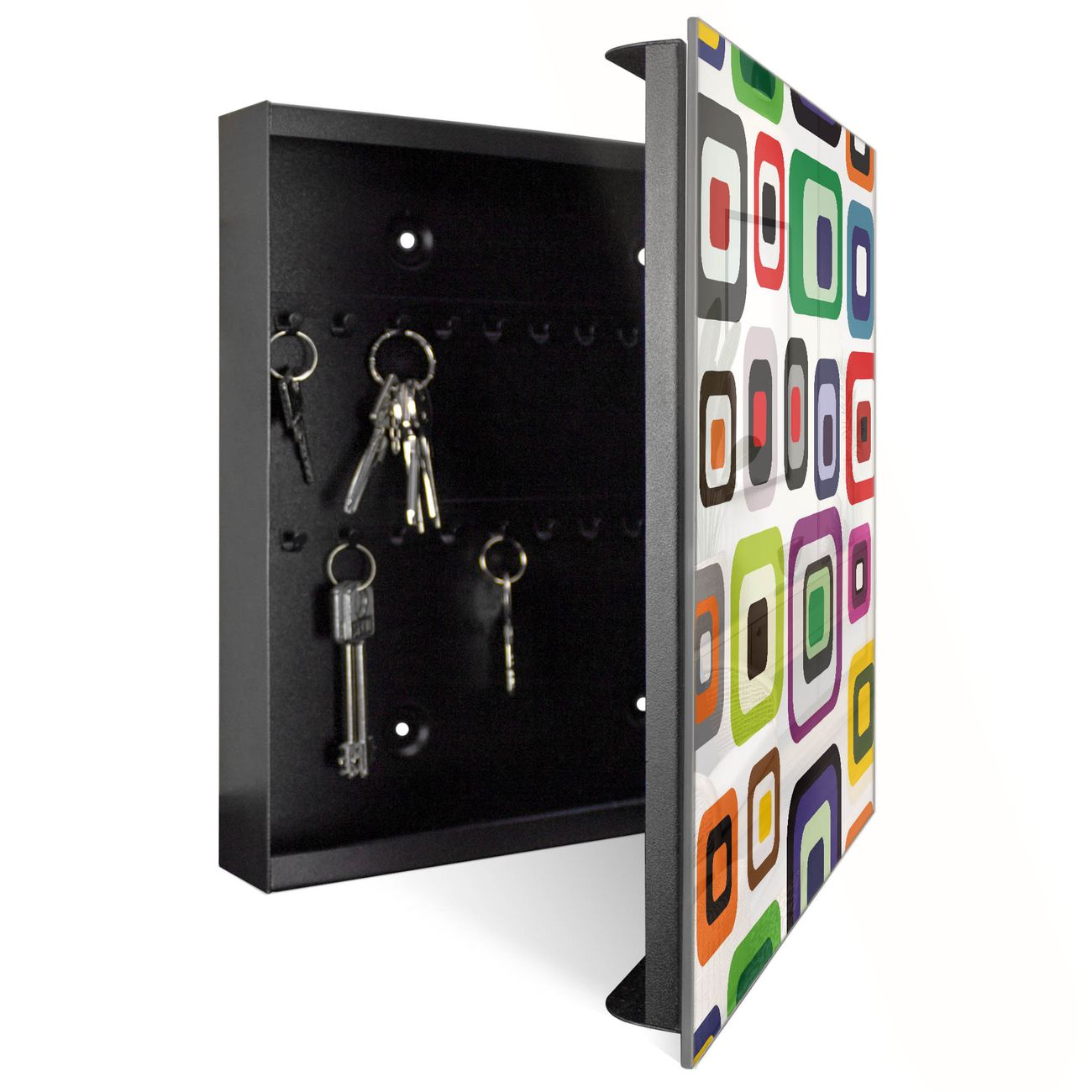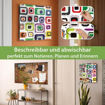 Bringe Ordnung und Eleganz in deinen Eingangsbereich mit dem banjado Schlüsselkasten Motiv Motiv Retro 2. Die moderne Schlüsselbox kombiniert funktionales Design mit hochwertiger Verarbeitung und wird so zu einem echten Hingucker in Flur, Büro oder Ferienwohnung. ✅ Stilvolle Schlüsselaufbewahrung mit Glasfront im Motiv Motiv Retro 2 Der Design-Schlüsselkasten Motiv Motiv Retro 2 bietet Platz für bis zu 50 Schlüssel, die auf 5 stabilen Reihen mit je 10 Haken übersichtlich verstaut werden. Mit seinen kompakten Maßen von 30 x 30 x 5 cm passt die Schlüsselbox perfekt auch in kleinere Räume. Der schwarz lackierte Stahlkorpus mit rechts angeschlagenem Türscharnier harmoniert mit der Glasfront und fügt sich nahtlos in jedes Wohnambiente ein. Ob als Schlüsselorganizer für Zuhause oder als praktische Lösung für Büros, Praxen und Gewerbe, der banjado Schlüsselkasten sorgt für Ordnung und Übersicht. Dank der magnetischen, mit Kreidestiften beschreibbaren Glasfront kannst du Notizen anheften oder Termine direkt auf der Oberfläche festhalten. Die Schlüsselbox Motiv Motiv Retro 2 zur Wandmontage wird inklusive Befestigungsmaterial geliefert und ist schnell angebracht. So hast du deine Schlüssel jederzeit griffbereit und zugleich stilvoll verstaut. Mit diesem banjado Schlüsselkasten Motiv Motiv Retro 2 kombinierst du praktische Aufbewahrung mit stilvollem Wohndesign. Ob privat oder geschäftlich, die Schlüsselbox sorgt für mehr Ordnung, Übersicht und ein wohnliches Ambiente.Vorteile im Überblick