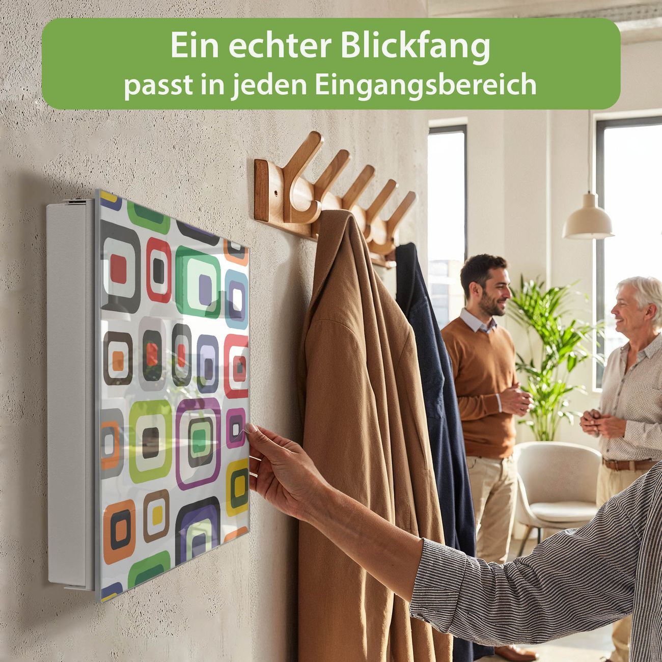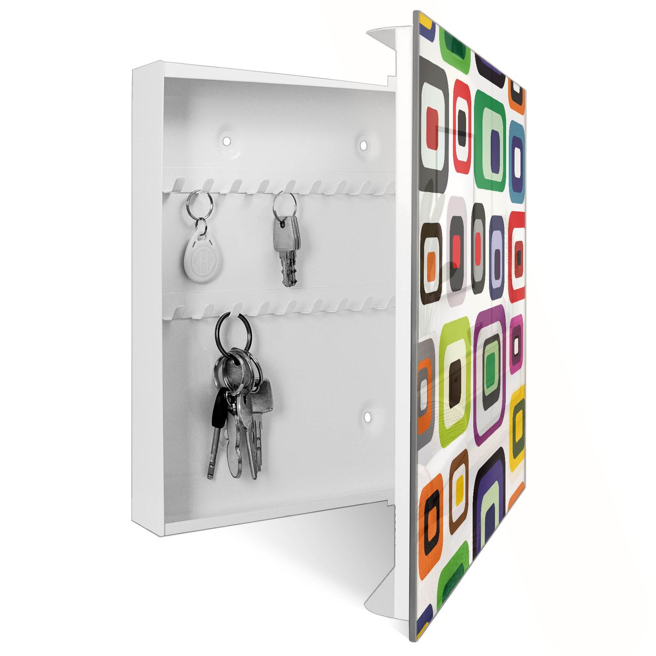 Bringe Ordnung und Eleganz in deinen Eingangsbereich mit dem banjado Schlüsselkasten Motiv Motiv Retro 2. Die moderne Schlüsselbox kombiniert funktionales Design mit hochwertiger Verarbeitung und wird so zu einem echten Hingucker in Flur, Büro oder Ferienwohnung. ✅ Stilvolle Schlüsselaufbewahrung mit Glasfront im Motiv Motiv Retro 2 Der Design-Schlüsselkasten Motiv Motiv Retro 2 bietet Platz für bis zu 50 Schlüssel, die auf 5 stabilen Reihen mit je 10 Haken übersichtlich verstaut werden. Mit seinen kompakten Maßen von 30 x 30 x 5 cm passt die Schlüsselbox perfekt auch in kleinere Räume. Der weiß lackierte Stahlkorpus mit rechts angeschlagenem Türscharnier harmoniert mit der Glasfront und fügt sich nahtlos in jedes Wohnambiente ein. Ob als Schlüsselorganizer für Zuhause oder als praktische Lösung für Büros, Praxen und Gewerbe, der banjado Schlüsselkasten sorgt für Ordnung und Übersicht. Dank der magnetischen, mit Kreidestiften beschreibbaren Glasfront kannst du Notizen anheften oder Termine direkt auf der Oberfläche festhalten. Die Schlüsselbox Motiv Motiv Retro 2 zur Wandmontage wird inklusive Befestigungsmaterial geliefert und ist schnell angebracht. So hast du deine Schlüssel jederzeit griffbereit und zugleich stilvoll verstaut. Mit diesem banjado Schlüsselkasten Motiv Motiv Retro 2 kombinierst du praktische Aufbewahrung mit stilvollem Wohndesign. Ob privat oder geschäftlich, die Schlüsselbox sorgt für mehr Ordnung, Übersicht und ein wohnliches Ambiente.Vorteile im Überblick