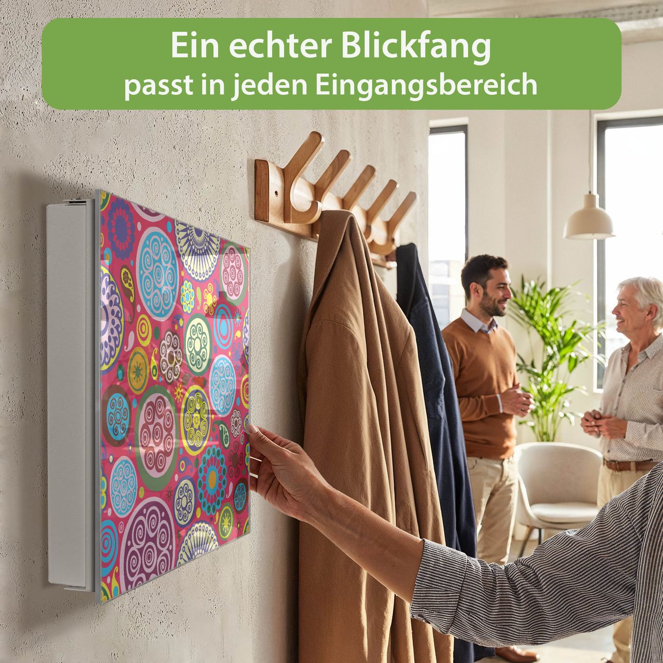 Bringe Ordnung und Eleganz in deinen Eingangsbereich mit dem banjado Schlüsselkasten Motiv Motiv Retro Kreise. Die moderne Schlüsselbox kombiniert funktionales Design mit hochwertiger Verarbeitung und wird so zu einem echten Hingucker in Flur, Büro oder Ferienwohnung. ✅ Stilvolle Schlüsselaufbewahrung mit Glasfront im Motiv Motiv Retro Kreise Der Design-Schlüsselkasten Motiv Motiv Retro Kreise bietet Platz für bis zu 50 Schlüssel, die auf 5 stabilen Reihen mit je 10 Haken übersichtlich verstaut werden. Mit seinen kompakten Maßen von 30 x 30 x 5 cm passt die Schlüsselbox perfekt auch in kleinere Räume. Der weiß lackierte Stahlkorpus mit rechts angeschlagenem Türscharnier harmoniert mit der Glasfront und fügt sich nahtlos in jedes Wohnambiente ein. Ob als Schlüsselorganizer für Zuhause oder als praktische Lösung für Büros, Praxen und Gewerbe, der banjado Schlüsselkasten sorgt für Ordnung und Übersicht. Dank der magnetischen, mit Kreidestiften beschreibbaren Glasfront kannst du Notizen anheften oder Termine direkt auf der Oberfläche festhalten. Die Schlüsselbox Motiv Motiv Retro Kreise zur Wandmontage wird inklusive Befestigungsmaterial geliefert und ist schnell angebracht. So hast du deine Schlüssel jederzeit griffbereit und zugleich stilvoll verstaut. Mit diesem banjado Schlüsselkasten Motiv Motiv Retro Kreise kombinierst du praktische Aufbewahrung mit stilvollem Wohndesign. Ob privat oder geschäftlich, die Schlüsselbox sorgt für mehr Ordnung, Übersicht und ein wohnliches Ambiente.Vorteile im Überblick