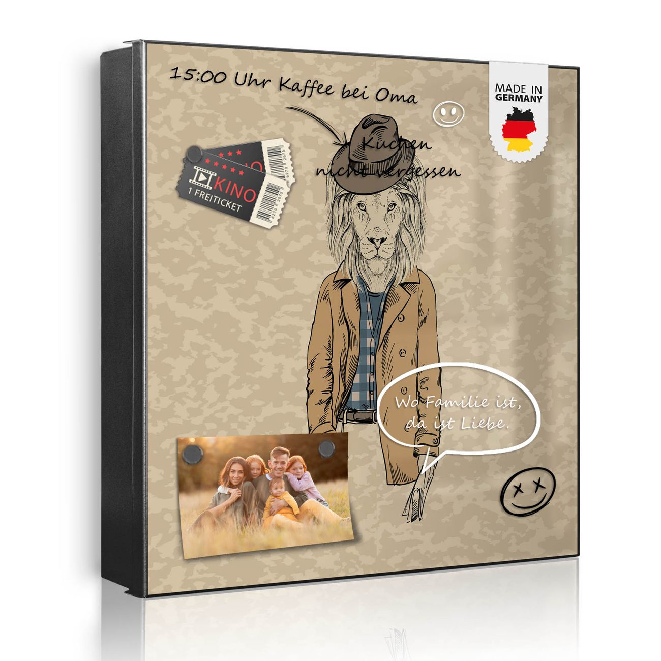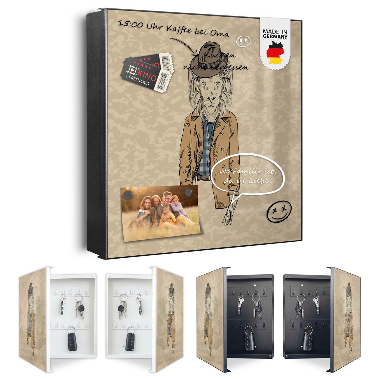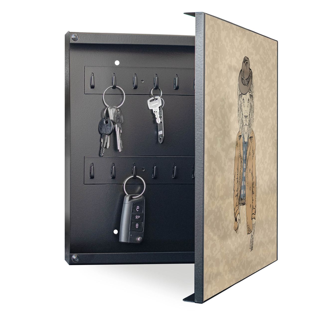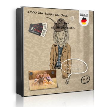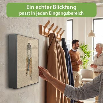 Bringe Ordnung und Eleganz in deinen Eingangsbereich mit dem banjado Schlüsselkasten Motiv Motiv Retro Style. Die moderne Schlüsselbox kombiniert funktionales Design mit hochwertiger Verarbeitung und wird so zu einem echten Hingucker in Flur, Büro oder Ferienwohnung. ✅ Stilvolle Schlüsselaufbewahrung mit Motiv Motiv Retro Style Der Design-Schlüsselkasten Motiv Motiv Retro Style bietet Platz für bis zu 32 Schlüssel, die auf 4 stabilen Reihen mit je 8 Haken übersichtlich verstaut werden. Mit seinen kompakten Maßen von 30 x 30 x 5 cm passt die Schlüsselbox perfekt auch in kleinere Räume. Der schwarz lackierte Stahlkorpus mit rechts angeschlagenem Türscharnier harmoniert mit gedruckten Folie auf der Front und fügt sich nahtlos in jedes Wohnambiente ein. Ob als Schlüsselorganizer für Zuhause oder als praktische Lösung für Büros, Praxen und Gewerbe, der banjado Schlüsselkasten sorgt für Ordnung und Übersicht. Dank der magnetischen, mit Kreidestiften beschreibbaren Folie auf der Front kannst du Notizen anheften oder Termine direkt auf der Oberfläche festhalten. Die Schlüsselbox Motiv Motiv Retro Style zur Wandmontage wird inklusive Befestigungsmaterial geliefert und ist schnell angebracht. So hast du deine Schlüssel jederzeit griffbereit und zugleich stilvoll verstaut. Mit diesem banjado Schlüsselkasten Motiv Motiv Retro Style kombinierst du praktische Aufbewahrung mit stilvollem Wohndesign. Ob privat oder geschäftlich, die Schlüsselbox sorgt für mehr Ordnung, Übersicht und ein wohnliches Ambiente.Vorteile im Überblick