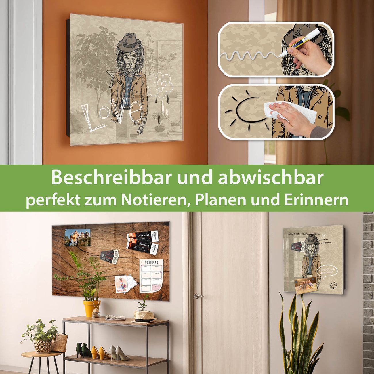 ✅ Magnetisch und mit Kreidestift beschreibbar, gehärtetes Glas, links angeschlagene TürOrdnung und Design in einem