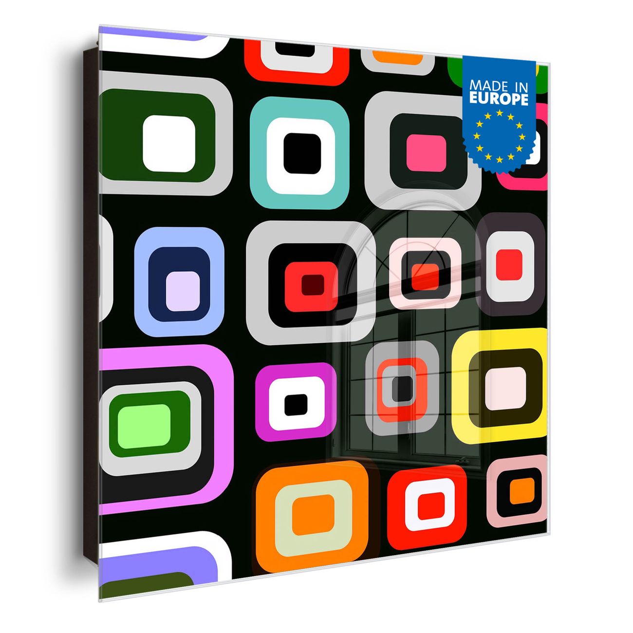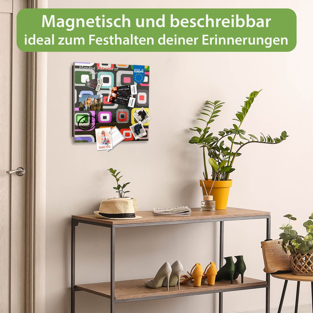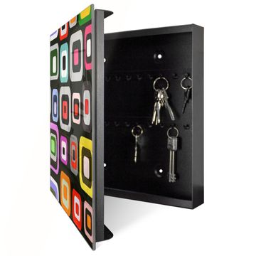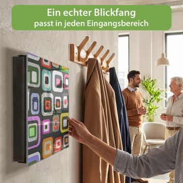 Bringe Ordnung und Eleganz in deinen Eingangsbereich mit dem banjado Schlüsselkasten Motiv Motiv Retro. Die moderne Schlüsselbox kombiniert funktionales Design mit hochwertiger Verarbeitung und wird so zu einem echten Hingucker in Flur, Büro oder Ferienwohnung. ✅ Stilvolle Schlüsselaufbewahrung mit Glasfront im Motiv Motiv Retro Der Design-Schlüsselkasten Motiv Motiv Retro bietet Platz für bis zu 50 Schlüssel, die auf 5 stabilen Reihen mit je 10 Haken übersichtlich verstaut werden. Mit seinen kompakten Maßen von 30 x 30 x 5 cm passt die Schlüsselbox perfekt auch in kleinere Räume. Der schwarz lackierte Stahlkorpus mit rechts angeschlagenem Türscharnier harmoniert mit der Glasfront und fügt sich nahtlos in jedes Wohnambiente ein. Ob als Schlüsselorganizer für Zuhause oder als praktische Lösung für Büros, Praxen und Gewerbe, der banjado Schlüsselkasten sorgt für Ordnung und Übersicht. Dank der magnetischen, mit Kreidestiften beschreibbaren Glasfront kannst du Notizen anheften oder Termine direkt auf der Oberfläche festhalten. Die Schlüsselbox Motiv Motiv Retro zur Wandmontage wird inklusive Befestigungsmaterial geliefert und ist schnell angebracht. So hast du deine Schlüssel jederzeit griffbereit und zugleich stilvoll verstaut. Mit diesem banjado Schlüsselkasten Motiv Motiv Retro kombinierst du praktische Aufbewahrung mit stilvollem Wohndesign. Ob privat oder geschäftlich, die Schlüsselbox sorgt für mehr Ordnung, Übersicht und ein wohnliches Ambiente.Vorteile im Überblick
