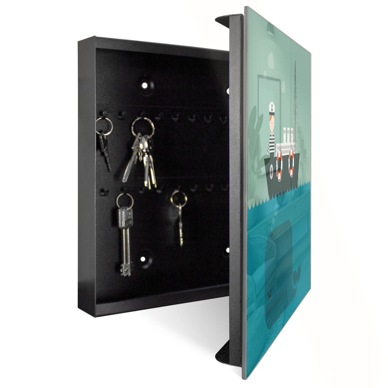 Bringe Ordnung und Eleganz in deinen Eingangsbereich mit dem banjado Schlüsselkasten Motiv Motiv Rettet die Wale. Die moderne Schlüsselbox kombiniert funktionales Design mit hochwertiger Verarbeitung und wird so zu einem echten Hingucker in Flur, Büro oder Ferienwohnung. ✅ Stilvolle Schlüsselaufbewahrung mit Glasfront im Motiv Motiv Rettet die Wale Der Design-Schlüsselkasten Motiv Motiv Rettet die Wale bietet Platz für bis zu 50 Schlüssel, die auf 5 stabilen Reihen mit je 10 Haken übersichtlich verstaut werden. Mit seinen kompakten Maßen von 30 x 30 x 5 cm passt die Schlüsselbox perfekt auch in kleinere Räume. Der schwarz lackierte Stahlkorpus mit rechts angeschlagenem Türscharnier harmoniert mit der Glasfront und fügt sich nahtlos in jedes Wohnambiente ein. Ob als Schlüsselorganizer für Zuhause oder als praktische Lösung für Büros, Praxen und Gewerbe, der banjado Schlüsselkasten sorgt für Ordnung und Übersicht. Dank der magnetischen, mit Kreidestiften beschreibbaren Glasfront kannst du Notizen anheften oder Termine direkt auf der Oberfläche festhalten. Die Schlüsselbox Motiv Motiv Rettet die Wale zur Wandmontage wird inklusive Befestigungsmaterial geliefert und ist schnell angebracht. So hast du deine Schlüssel jederzeit griffbereit und zugleich stilvoll verstaut. Mit diesem banjado Schlüsselkasten Motiv Motiv Rettet die Wale kombinierst du praktische Aufbewahrung mit stilvollem Wohndesign. Ob privat oder geschäftlich, die Schlüsselbox sorgt für mehr Ordnung, Übersicht und ein wohnliches Ambiente.Vorteile im Überblick