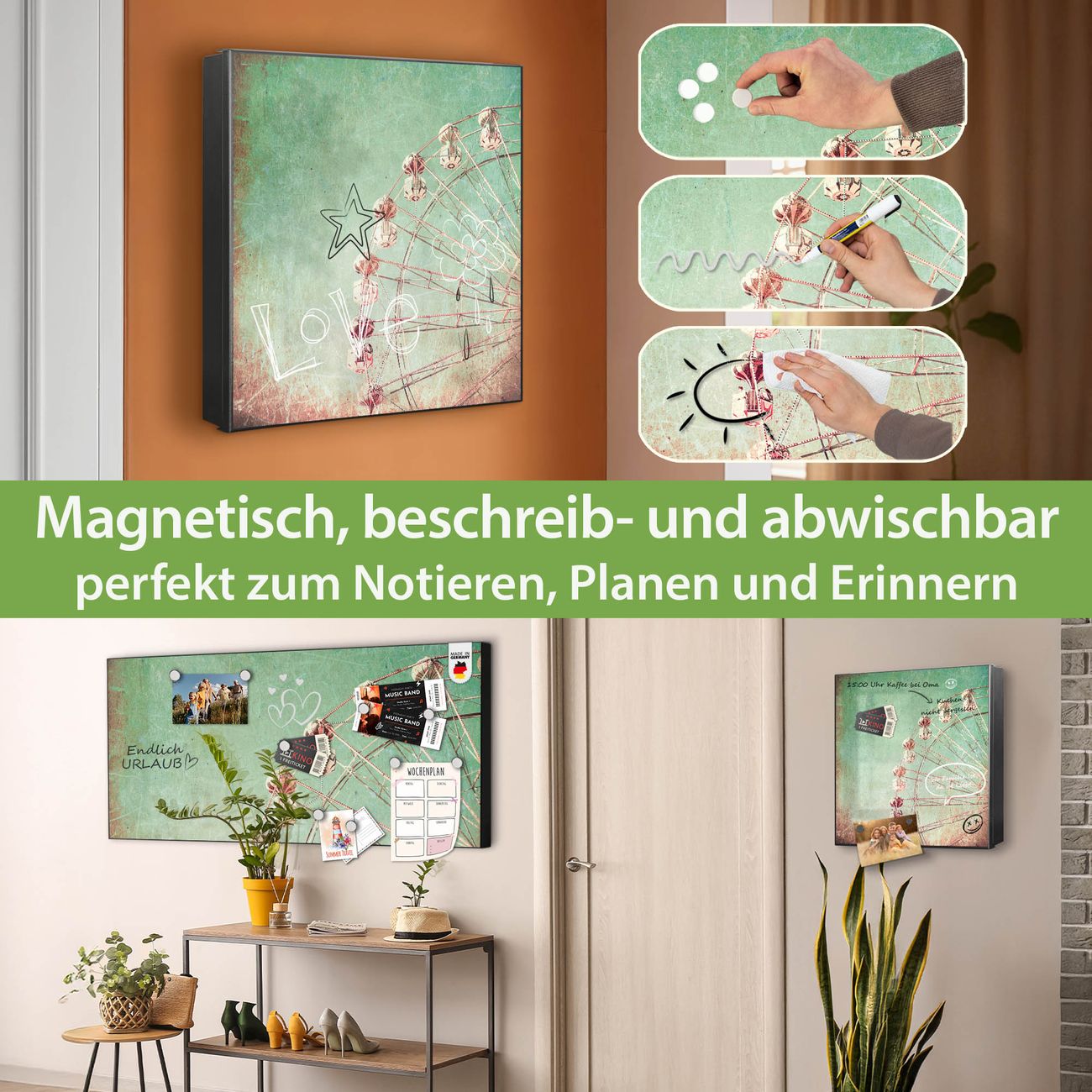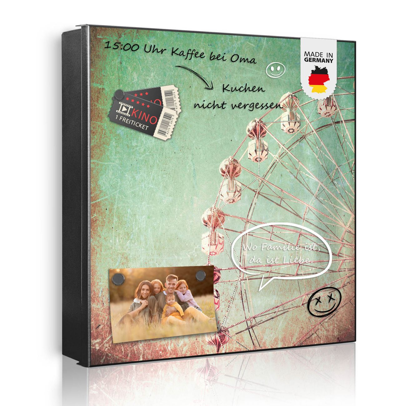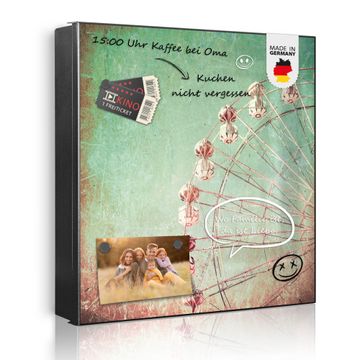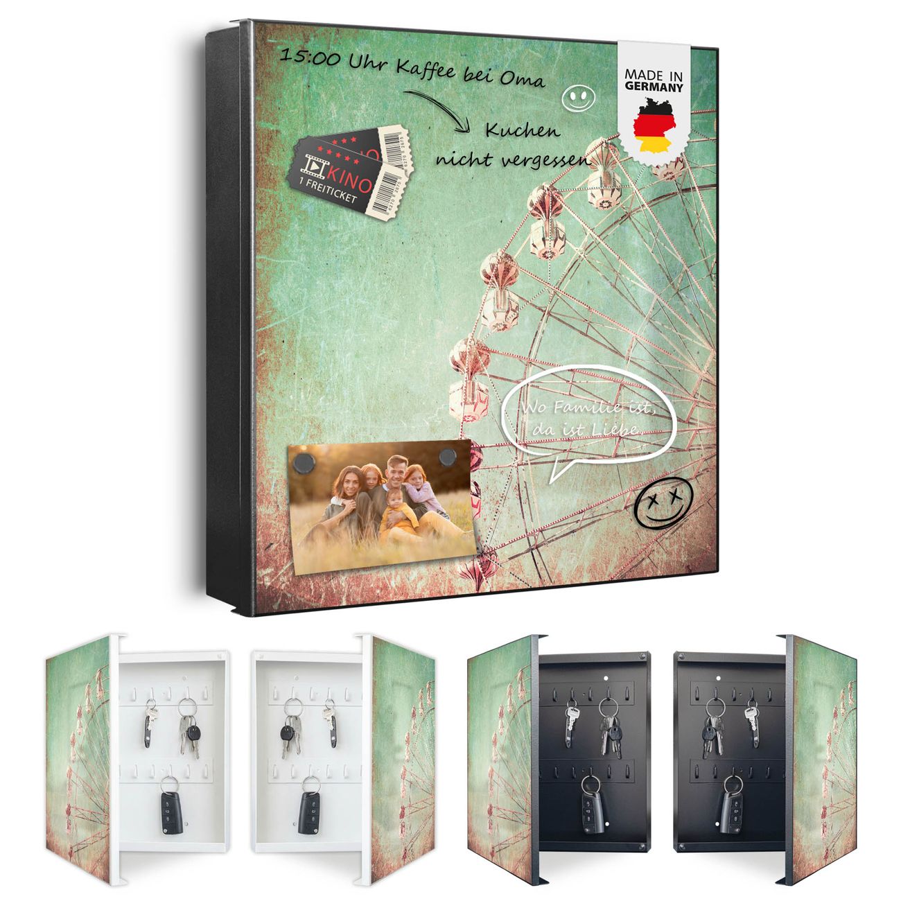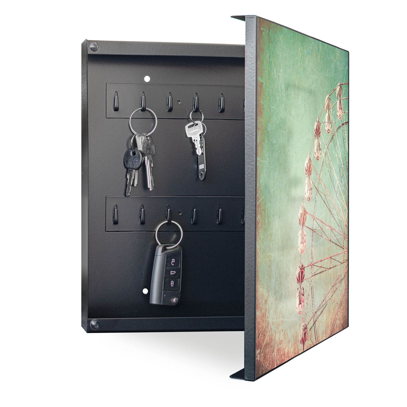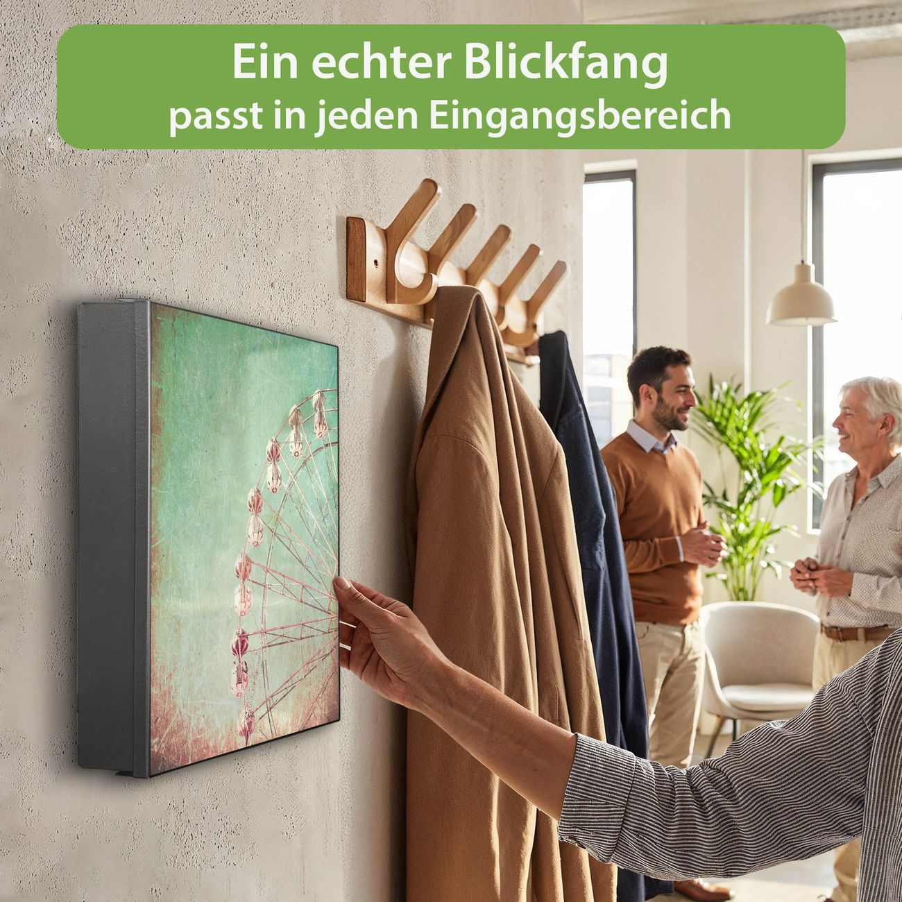 Bringe Ordnung und Eleganz in deinen Eingangsbereich mit dem banjado Schlüsselkasten Motiv Motiv Riesenrad 1. Die moderne Schlüsselbox kombiniert funktionales Design mit hochwertiger Verarbeitung und wird so zu einem echten Hingucker in Flur, Büro oder Ferienwohnung. ✅ Stilvolle Schlüsselaufbewahrung mit Motiv Motiv Riesenrad 1 Der Design-Schlüsselkasten Motiv Motiv Riesenrad 1 bietet Platz für bis zu 32 Schlüssel, die auf 4 stabilen Reihen mit je 8 Haken übersichtlich verstaut werden. Mit seinen kompakten Maßen von 30 x 30 x 5 cm passt die Schlüsselbox perfekt auch in kleinere Räume. Der schwarz lackierte Stahlkorpus mit rechts angeschlagenem Türscharnier harmoniert mit gedruckten Folie auf der Front und fügt sich nahtlos in jedes Wohnambiente ein. Ob als Schlüsselorganizer für Zuhause oder als praktische Lösung für Büros, Praxen und Gewerbe, der banjado Schlüsselkasten sorgt für Ordnung und Übersicht. Dank der magnetischen, mit Kreidestiften beschreibbaren Folie auf der Front kannst du Notizen anheften oder Termine direkt auf der Oberfläche festhalten. Die Schlüsselbox Motiv Motiv Riesenrad 1 zur Wandmontage wird inklusive Befestigungsmaterial geliefert und ist schnell angebracht. So hast du deine Schlüssel jederzeit griffbereit und zugleich stilvoll verstaut. Mit diesem banjado Schlüsselkasten Motiv Motiv Riesenrad 1 kombinierst du praktische Aufbewahrung mit stilvollem Wohndesign. Ob privat oder geschäftlich, die Schlüsselbox sorgt für mehr Ordnung, Übersicht und ein wohnliches Ambiente.Vorteile im Überblick