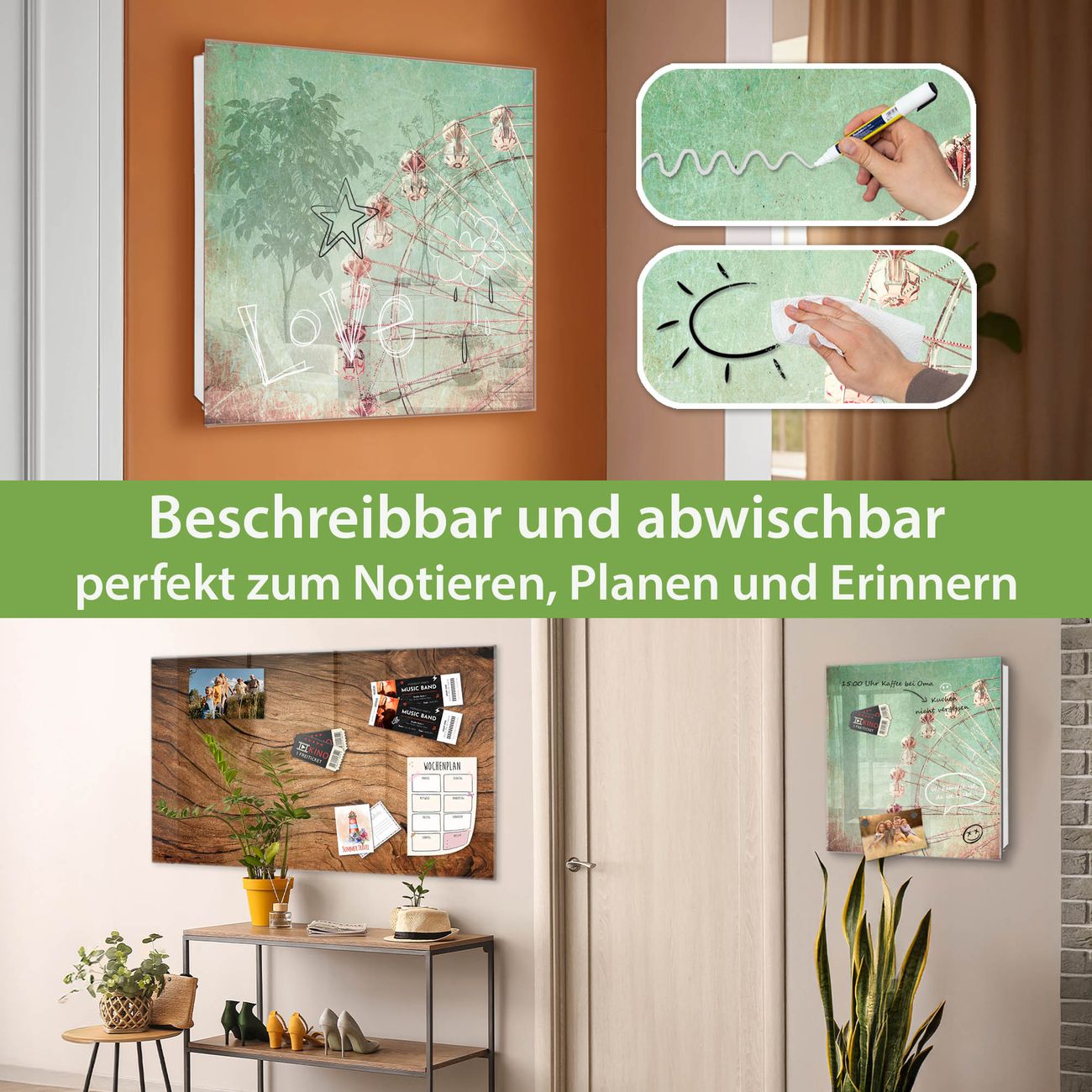 Bringe Ordnung und Eleganz in deinen Eingangsbereich mit dem banjado Schlüsselkasten Motiv Motiv Riesenrad 1. Die moderne Schlüsselbox kombiniert funktionales Design mit hochwertiger Verarbeitung und wird so zu einem echten Hingucker in Flur, Büro oder Ferienwohnung. ✅ Stilvolle Schlüsselaufbewahrung mit Glasfront im Motiv Motiv Riesenrad 1 Der Design-Schlüsselkasten Motiv Motiv Riesenrad 1 bietet Platz für bis zu 50 Schlüssel, die auf 5 stabilen Reihen mit je 10 Haken übersichtlich verstaut werden. Mit seinen kompakten Maßen von 30 x 30 x 5 cm passt die Schlüsselbox perfekt auch in kleinere Räume. Der weiß lackierte Stahlkorpus mit rechts angeschlagenem Türscharnier harmoniert mit der Glasfront und fügt sich nahtlos in jedes Wohnambiente ein. Ob als Schlüsselorganizer für Zuhause oder als praktische Lösung für Büros, Praxen und Gewerbe, der banjado Schlüsselkasten sorgt für Ordnung und Übersicht. Dank der magnetischen, mit Kreidestiften beschreibbaren Glasfront kannst du Notizen anheften oder Termine direkt auf der Oberfläche festhalten. Die Schlüsselbox Motiv Motiv Riesenrad 1 zur Wandmontage wird inklusive Befestigungsmaterial geliefert und ist schnell angebracht. So hast du deine Schlüssel jederzeit griffbereit und zugleich stilvoll verstaut. Mit diesem banjado Schlüsselkasten Motiv Motiv Riesenrad 1 kombinierst du praktische Aufbewahrung mit stilvollem Wohndesign. Ob privat oder geschäftlich, die Schlüsselbox sorgt für mehr Ordnung, Übersicht und ein wohnliches Ambiente.Vorteile im Überblick
