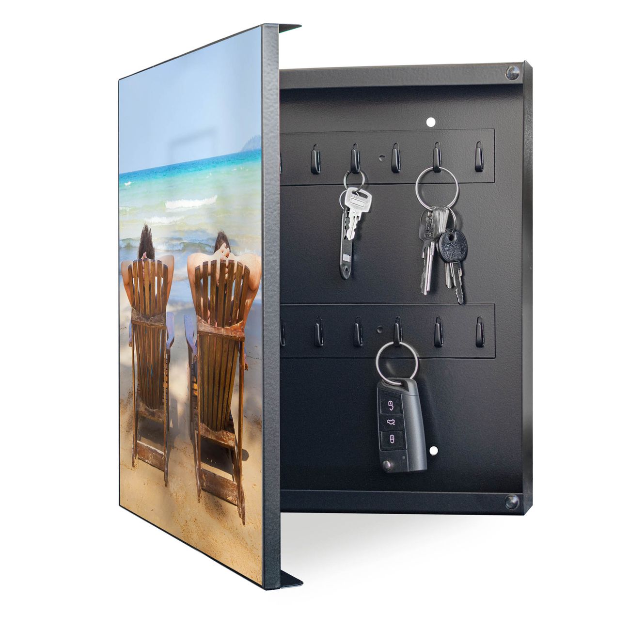 Bringe Ordnung und Eleganz in deinen Eingangsbereich mit dem banjado Schlüsselkasten Motiv Motiv Robinson Und Freitag. Die moderne Schlüsselbox kombiniert funktionales Design mit hochwertiger Verarbeitung und wird so zu einem echten Hingucker in Flur, Büro oder Ferienwohnung. ✅ Stilvolle Schlüsselaufbewahrung mit Motiv Motiv Robinson Und Freitag Der Design-Schlüsselkasten Motiv Motiv Robinson Und Freitag bietet Platz für bis zu 32 Schlüssel, die auf 4 stabilen Reihen mit je 8 Haken übersichtlich verstaut werden. Mit seinen kompakten Maßen von 30 x 30 x 5 cm passt die Schlüsselbox perfekt auch in kleinere Räume. Der schwarz lackierte Stahlkorpus mit links angeschlagenem Türscharnier harmoniert mit gedruckten Folie auf der Front und fügt sich nahtlos in jedes Wohnambiente ein. Ob als Schlüsselorganizer für Zuhause oder als praktische Lösung für Büros, Praxen und Gewerbe, der banjado Schlüsselkasten sorgt für Ordnung und Übersicht. Dank der magnetischen, mit Kreidestiften beschreibbaren Folie auf der Front kannst du Notizen anheften oder Termine direkt auf der Oberfläche festhalten. Die Schlüsselbox Motiv Motiv Robinson Und Freitag zur Wandmontage wird inklusive Befestigungsmaterial geliefert und ist schnell angebracht. So hast du deine Schlüssel jederzeit griffbereit und zugleich stilvoll verstaut. Mit diesem banjado Schlüsselkasten Motiv Motiv Robinson Und Freitag kombinierst du praktische Aufbewahrung mit stilvollem Wohndesign. Ob privat oder geschäftlich, die Schlüsselbox sorgt für mehr Ordnung, Übersicht und ein wohnliches Ambiente.Vorteile im Überblick