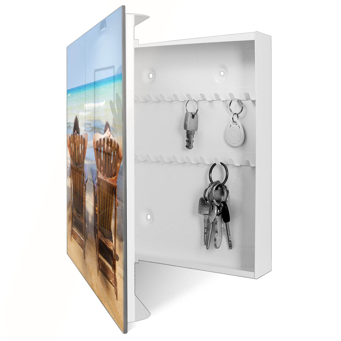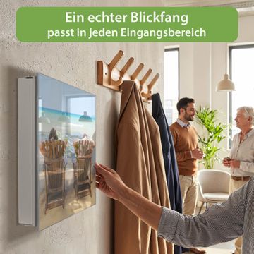 Bringe Ordnung und Eleganz in deinen Eingangsbereich mit dem banjado Schlüsselkasten Motiv Motiv Robinson Und Freitag. Die moderne Schlüsselbox kombiniert funktionales Design mit hochwertiger Verarbeitung und wird so zu einem echten Hingucker in Flur, Büro oder Ferienwohnung. ✅ Stilvolle Schlüsselaufbewahrung mit Glasfront im Motiv Motiv Robinson Und Freitag Der Design-Schlüsselkasten Motiv Motiv Robinson Und Freitag bietet Platz für bis zu 50 Schlüssel, die auf 5 stabilen Reihen mit je 10 Haken übersichtlich verstaut werden. Mit seinen kompakten Maßen von 30 x 30 x 5 cm passt die Schlüsselbox perfekt auch in kleinere Räume. Der weiß lackierte Stahlkorpus mit rechts angeschlagenem Türscharnier harmoniert mit der Glasfront und fügt sich nahtlos in jedes Wohnambiente ein. Ob als Schlüsselorganizer für Zuhause oder als praktische Lösung für Büros, Praxen und Gewerbe, der banjado Schlüsselkasten sorgt für Ordnung und Übersicht. Dank der magnetischen, mit Kreidestiften beschreibbaren Glasfront kannst du Notizen anheften oder Termine direkt auf der Oberfläche festhalten. Die Schlüsselbox Motiv Motiv Robinson Und Freitag zur Wandmontage wird inklusive Befestigungsmaterial geliefert und ist schnell angebracht. So hast du deine Schlüssel jederzeit griffbereit und zugleich stilvoll verstaut. Mit diesem banjado Schlüsselkasten Motiv Motiv Robinson Und Freitag kombinierst du praktische Aufbewahrung mit stilvollem Wohndesign. Ob privat oder geschäftlich, die Schlüsselbox sorgt für mehr Ordnung, Übersicht und ein wohnliches Ambiente.Vorteile im Überblick