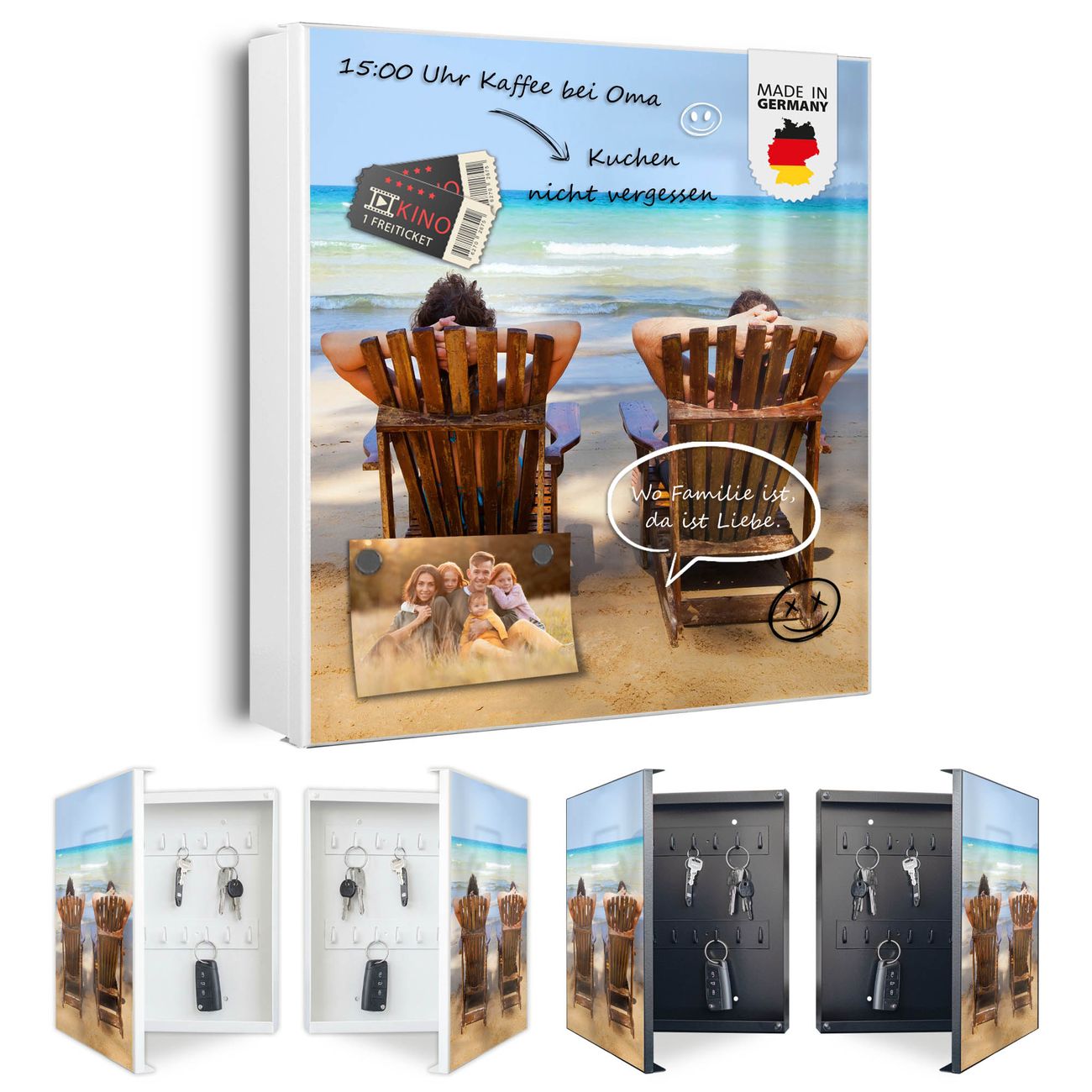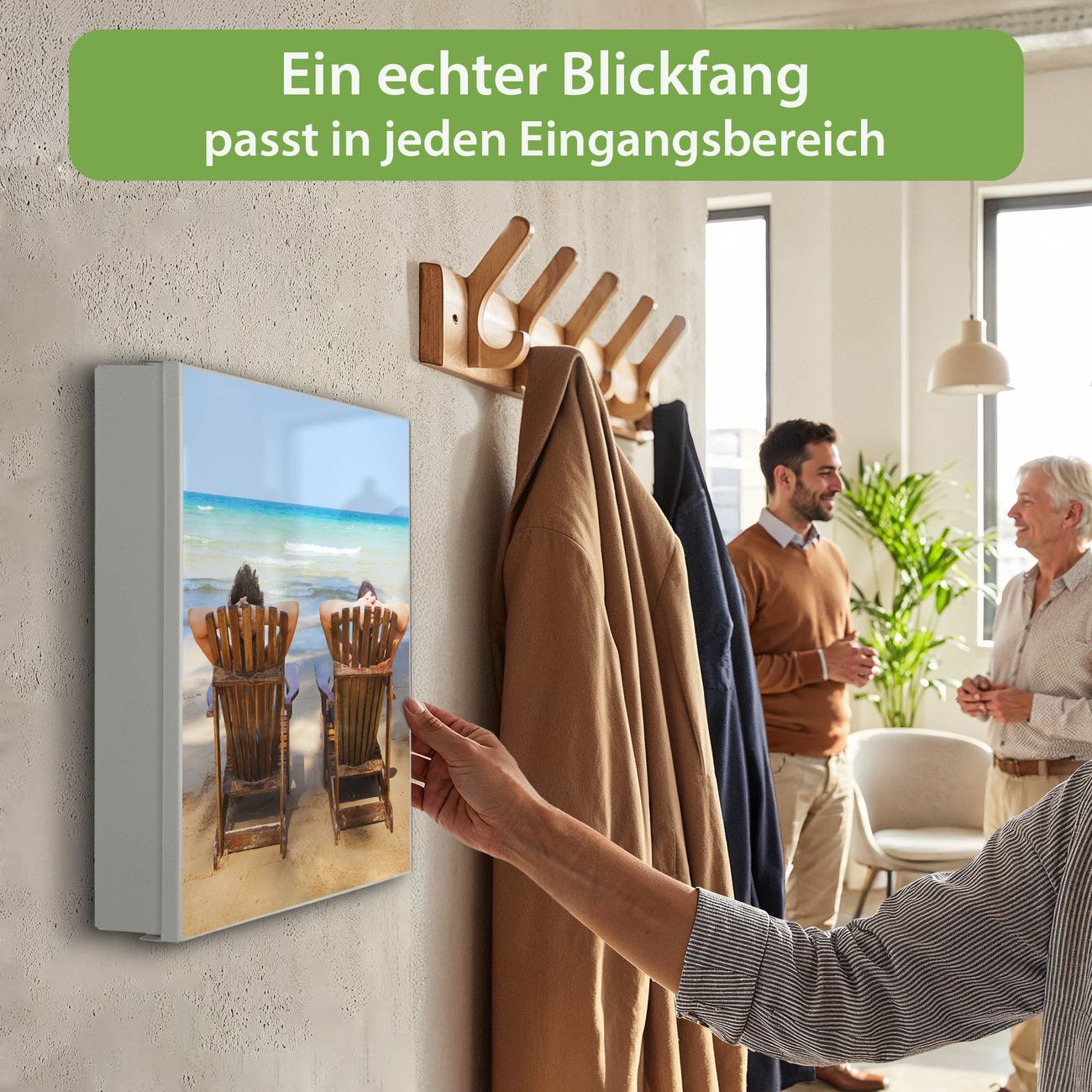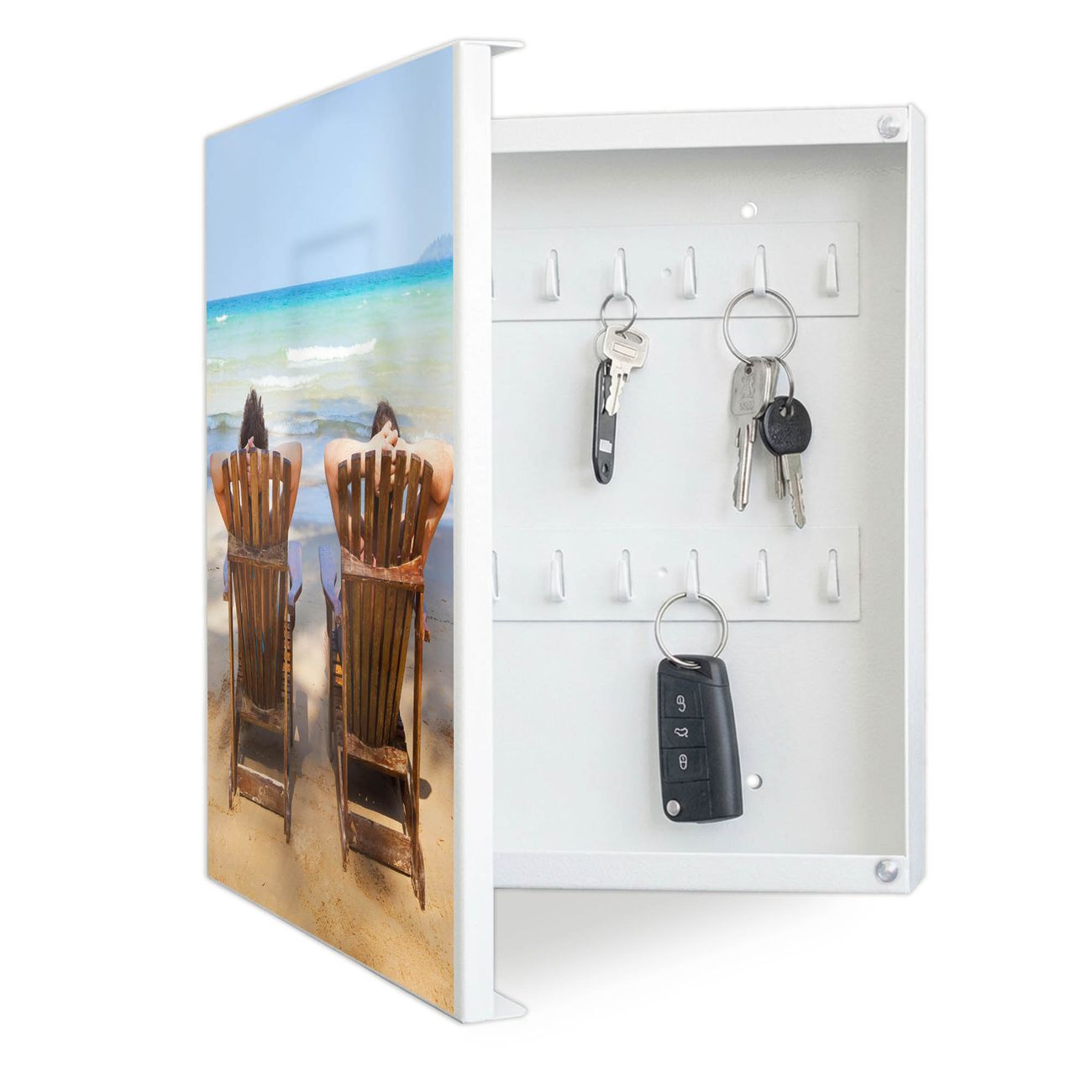 Bringe Ordnung und Eleganz in deinen Eingangsbereich mit dem banjado Schlüsselkasten Motiv Motiv Robinson Und Freitag. Die moderne Schlüsselbox kombiniert funktionales Design mit hochwertiger Verarbeitung und wird so zu einem echten Hingucker in Flur, Büro oder Ferienwohnung. ✅ Stilvolle Schlüsselaufbewahrung mit Motiv Motiv Robinson Und Freitag Der Design-Schlüsselkasten Motiv Motiv Robinson Und Freitag bietet Platz für bis zu 32 Schlüssel, die auf 4 stabilen Reihen mit je 8 Haken übersichtlich verstaut werden. Mit seinen kompakten Maßen von 30 x 30 x 5 cm passt die Schlüsselbox perfekt auch in kleinere Räume. Der weiß lackierte Stahlkorpus mit links angeschlagenem Türscharnier harmoniert mit gedruckten Folie auf der Front und fügt sich nahtlos in jedes Wohnambiente ein. Ob als Schlüsselorganizer für Zuhause oder als praktische Lösung für Büros, Praxen und Gewerbe, der banjado Schlüsselkasten sorgt für Ordnung und Übersicht. Dank der magnetischen, mit Kreidestiften beschreibbaren Folie auf der Front kannst du Notizen anheften oder Termine direkt auf der Oberfläche festhalten. Die Schlüsselbox Motiv Motiv Robinson Und Freitag zur Wandmontage wird inklusive Befestigungsmaterial geliefert und ist schnell angebracht. So hast du deine Schlüssel jederzeit griffbereit und zugleich stilvoll verstaut. Mit diesem banjado Schlüsselkasten Motiv Motiv Robinson Und Freitag kombinierst du praktische Aufbewahrung mit stilvollem Wohndesign. Ob privat oder geschäftlich, die Schlüsselbox sorgt für mehr Ordnung, Übersicht und ein wohnliches Ambiente.Vorteile im Überblick