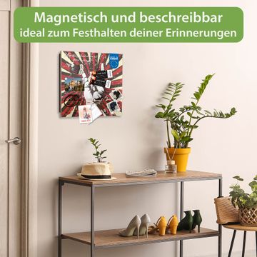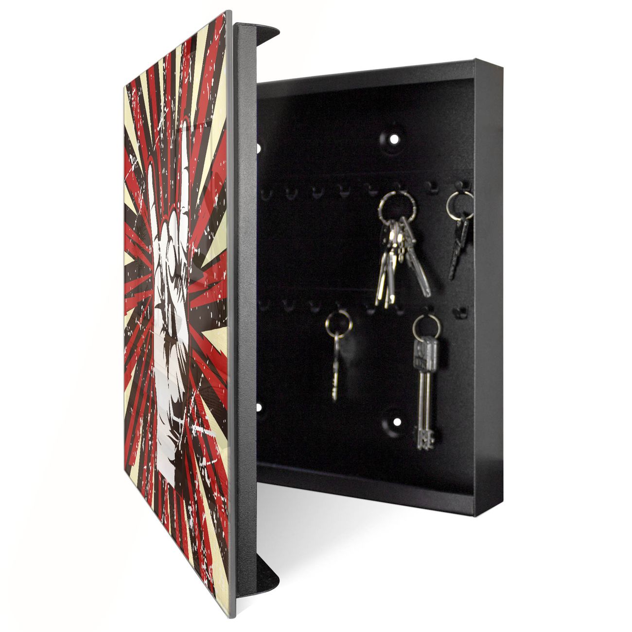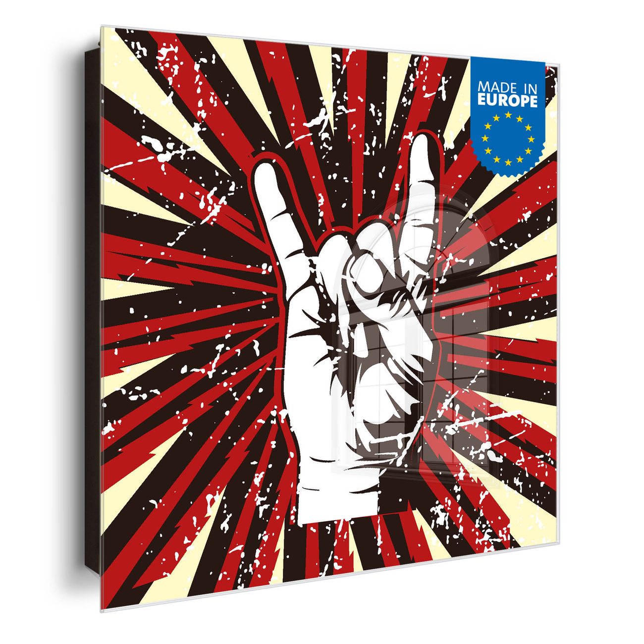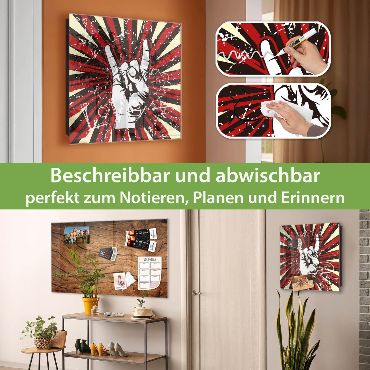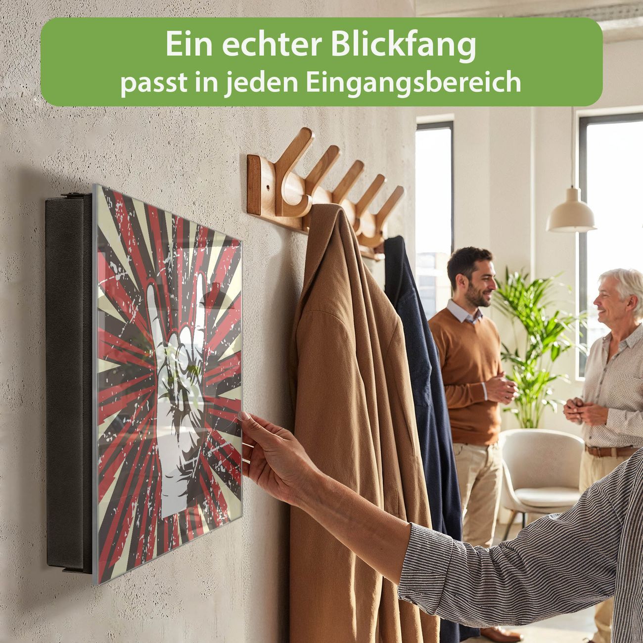 Bringe Ordnung und Eleganz in deinen Eingangsbereich mit dem banjado Schlüsselkasten Motiv Motiv Rock On. Die moderne Schlüsselbox kombiniert funktionales Design mit hochwertiger Verarbeitung und wird so zu einem echten Hingucker in Flur, Büro oder Ferienwohnung. ✅ Stilvolle Schlüsselaufbewahrung mit Glasfront im Motiv Motiv Rock On Der Design-Schlüsselkasten Motiv Motiv Rock On bietet Platz für bis zu 50 Schlüssel, die auf 5 stabilen Reihen mit je 10 Haken übersichtlich verstaut werden. Mit seinen kompakten Maßen von 30 x 30 x 5 cm passt die Schlüsselbox perfekt auch in kleinere Räume. Der schwarz lackierte Stahlkorpus mit rechts angeschlagenem Türscharnier harmoniert mit der Glasfront und fügt sich nahtlos in jedes Wohnambiente ein. Ob als Schlüsselorganizer für Zuhause oder als praktische Lösung für Büros, Praxen und Gewerbe, der banjado Schlüsselkasten sorgt für Ordnung und Übersicht. Dank der magnetischen, mit Kreidestiften beschreibbaren Glasfront kannst du Notizen anheften oder Termine direkt auf der Oberfläche festhalten. Die Schlüsselbox Motiv Motiv Rock On zur Wandmontage wird inklusive Befestigungsmaterial geliefert und ist schnell angebracht. So hast du deine Schlüssel jederzeit griffbereit und zugleich stilvoll verstaut. Mit diesem banjado Schlüsselkasten Motiv Motiv Rock On kombinierst du praktische Aufbewahrung mit stilvollem Wohndesign. Ob privat oder geschäftlich, die Schlüsselbox sorgt für mehr Ordnung, Übersicht und ein wohnliches Ambiente.Vorteile im Überblick