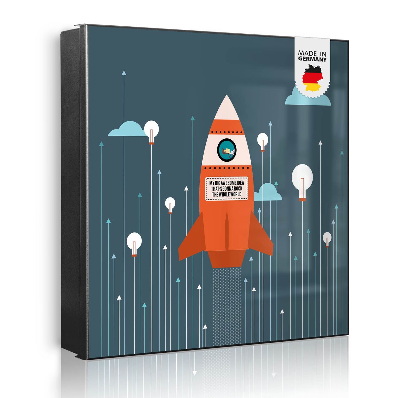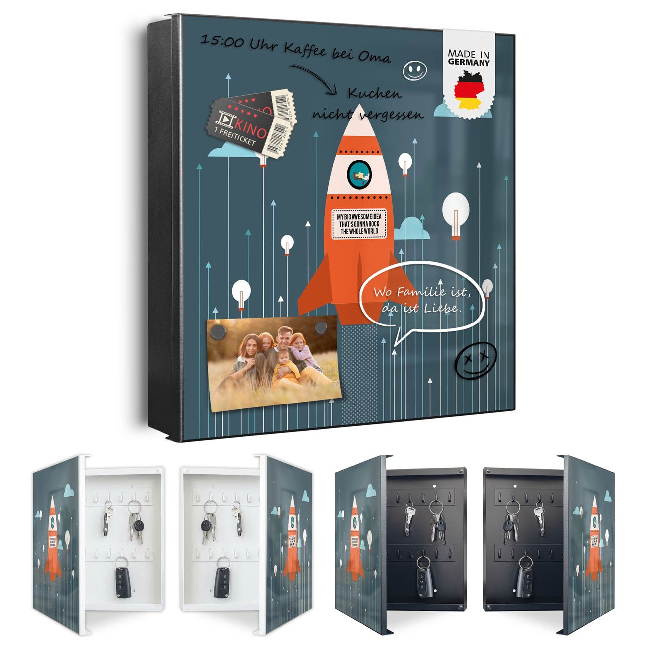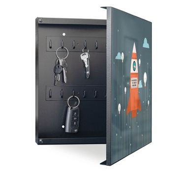 Bringe Ordnung und Eleganz in deinen Eingangsbereich mit dem banjado Schlüsselkasten Motiv Motiv Rock the World. Die moderne Schlüsselbox kombiniert funktionales Design mit hochwertiger Verarbeitung und wird so zu einem echten Hingucker in Flur, Büro oder Ferienwohnung. ✅ Stilvolle Schlüsselaufbewahrung mit Motiv Motiv Rock the World Der Design-Schlüsselkasten Motiv Motiv Rock the World bietet Platz für bis zu 32 Schlüssel, die auf 4 stabilen Reihen mit je 8 Haken übersichtlich verstaut werden. Mit seinen kompakten Maßen von 30 x 30 x 5 cm passt die Schlüsselbox perfekt auch in kleinere Räume. Der schwarz lackierte Stahlkorpus mit rechts angeschlagenem Türscharnier harmoniert mit gedruckten Folie auf der Front und fügt sich nahtlos in jedes Wohnambiente ein. Ob als Schlüsselorganizer für Zuhause oder als praktische Lösung für Büros, Praxen und Gewerbe, der banjado Schlüsselkasten sorgt für Ordnung und Übersicht. Dank der magnetischen, mit Kreidestiften beschreibbaren Folie auf der Front kannst du Notizen anheften oder Termine direkt auf der Oberfläche festhalten. Die Schlüsselbox Motiv Motiv Rock the World zur Wandmontage wird inklusive Befestigungsmaterial geliefert und ist schnell angebracht. So hast du deine Schlüssel jederzeit griffbereit und zugleich stilvoll verstaut. Mit diesem banjado Schlüsselkasten Motiv Motiv Rock the World kombinierst du praktische Aufbewahrung mit stilvollem Wohndesign. Ob privat oder geschäftlich, die Schlüsselbox sorgt für mehr Ordnung, Übersicht und ein wohnliches Ambiente.Vorteile im Überblick