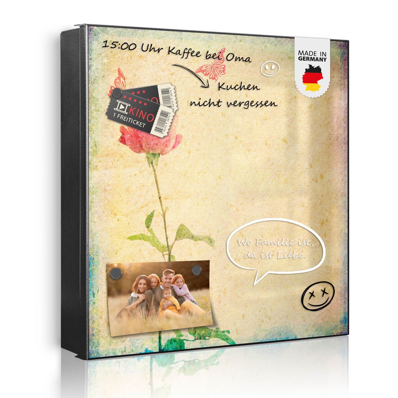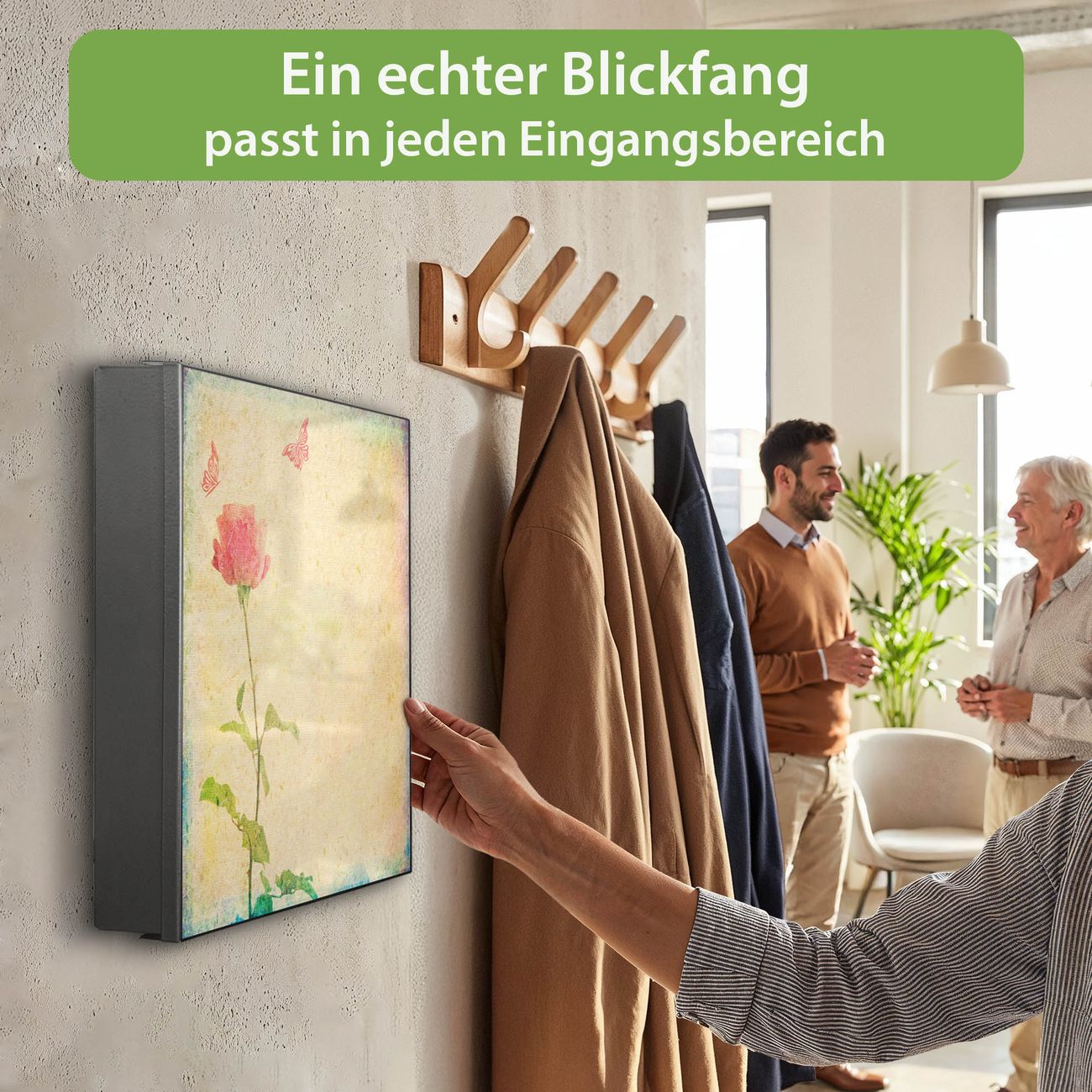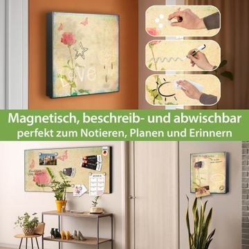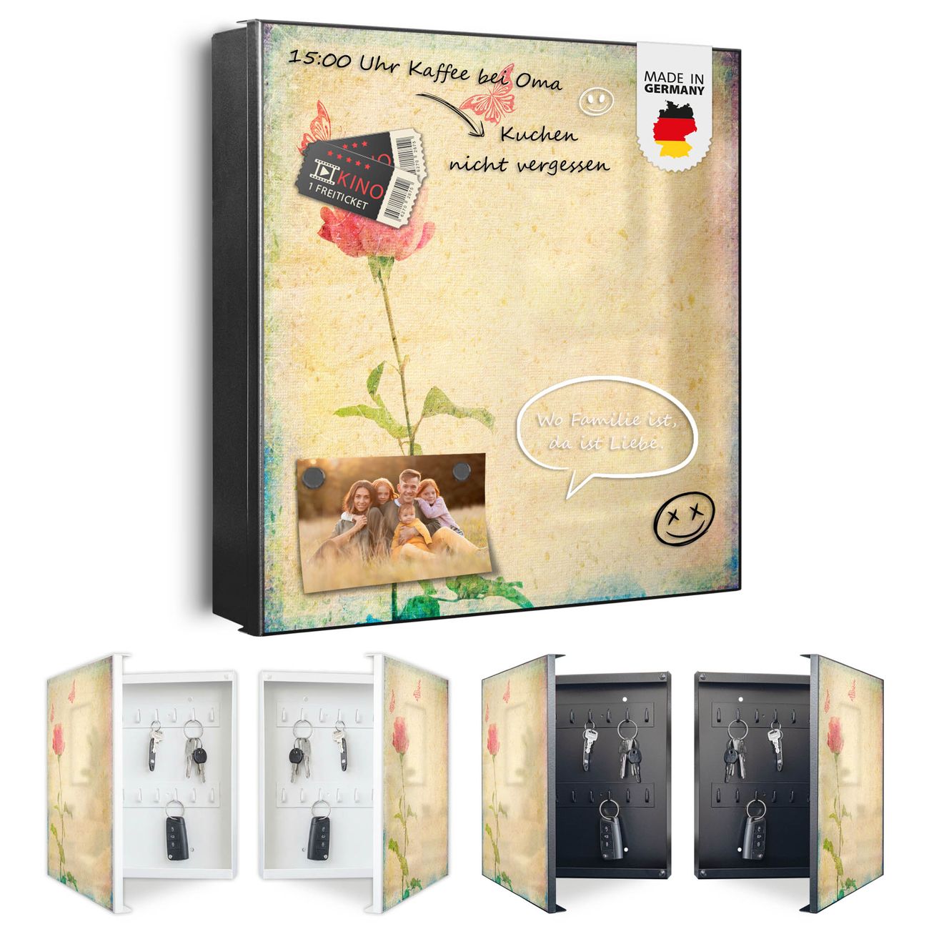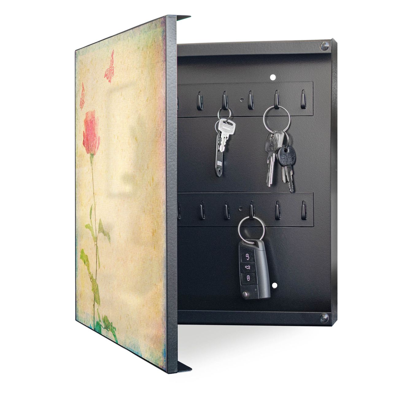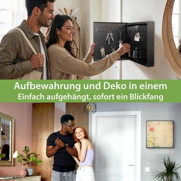 Bringe Ordnung und Eleganz in deinen Eingangsbereich mit dem banjado Schlüsselkasten Motiv Motiv Romantik. Die moderne Schlüsselbox kombiniert funktionales Design mit hochwertiger Verarbeitung und wird so zu einem echten Hingucker in Flur, Büro oder Ferienwohnung. ✅ Stilvolle Schlüsselaufbewahrung mit Motiv Motiv Romantik Der Design-Schlüsselkasten Motiv Motiv Romantik bietet Platz für bis zu 32 Schlüssel, die auf 4 stabilen Reihen mit je 8 Haken übersichtlich verstaut werden. Mit seinen kompakten Maßen von 30 x 30 x 5 cm passt die Schlüsselbox perfekt auch in kleinere Räume. Der schwarz lackierte Stahlkorpus mit links angeschlagenem Türscharnier harmoniert mit gedruckten Folie auf der Front und fügt sich nahtlos in jedes Wohnambiente ein. Ob als Schlüsselorganizer für Zuhause oder als praktische Lösung für Büros, Praxen und Gewerbe, der banjado Schlüsselkasten sorgt für Ordnung und Übersicht. Dank der magnetischen, mit Kreidestiften beschreibbaren Folie auf der Front kannst du Notizen anheften oder Termine direkt auf der Oberfläche festhalten. Die Schlüsselbox Motiv Motiv Romantik zur Wandmontage wird inklusive Befestigungsmaterial geliefert und ist schnell angebracht. So hast du deine Schlüssel jederzeit griffbereit und zugleich stilvoll verstaut. Mit diesem banjado Schlüsselkasten Motiv Motiv Romantik kombinierst du praktische Aufbewahrung mit stilvollem Wohndesign. Ob privat oder geschäftlich, die Schlüsselbox sorgt für mehr Ordnung, Übersicht und ein wohnliches Ambiente.Vorteile im Überblick