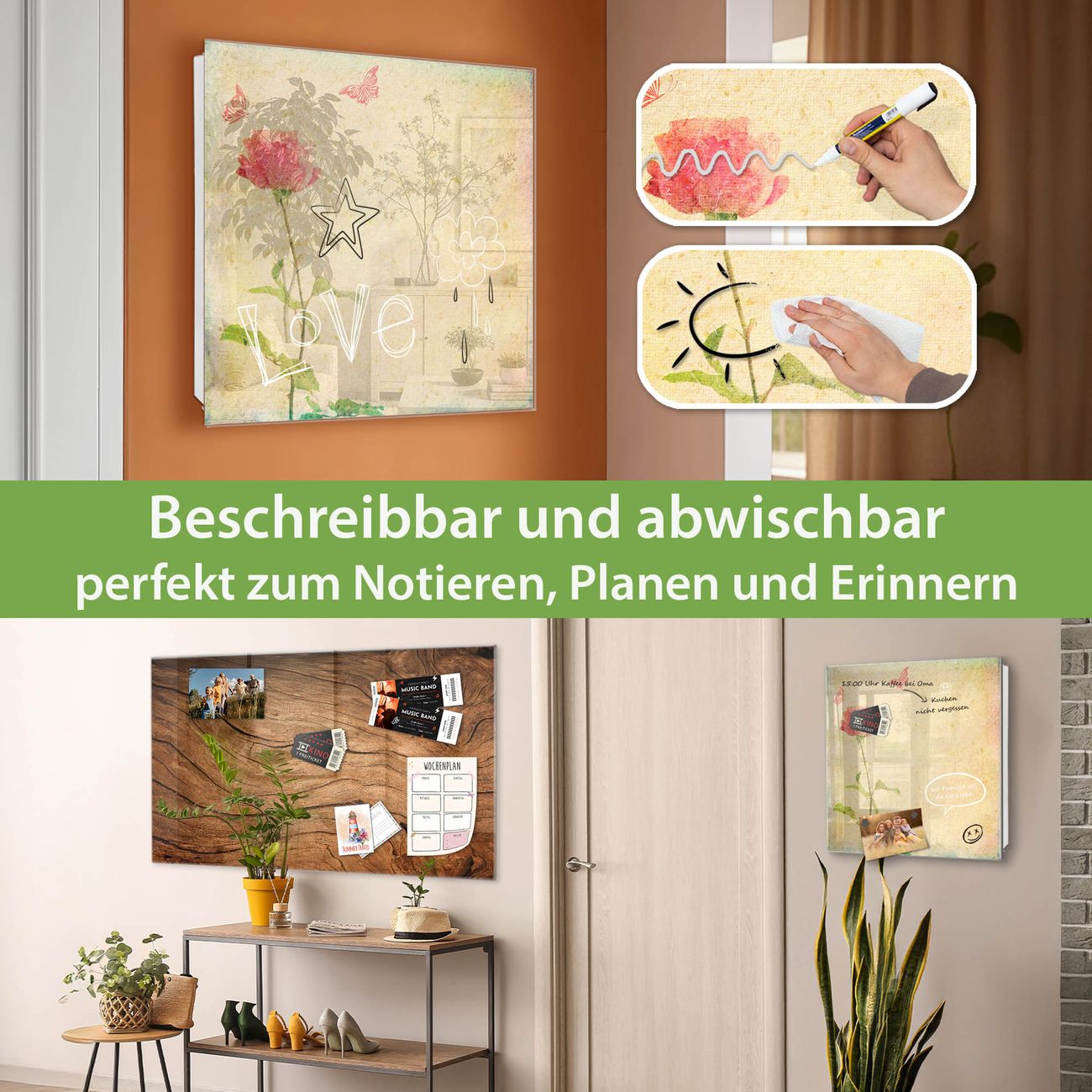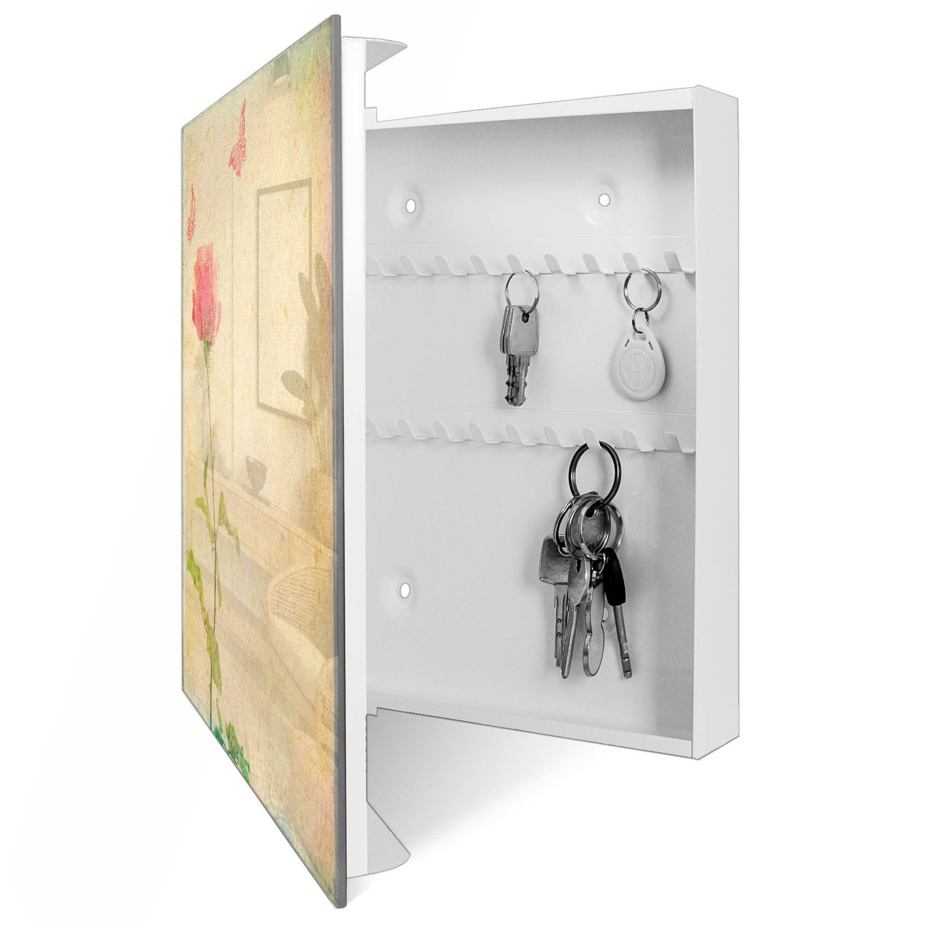 Bringe Ordnung und Eleganz in deinen Eingangsbereich mit dem banjado Schlüsselkasten Motiv Motiv Romantik. Die moderne Schlüsselbox kombiniert funktionales Design mit hochwertiger Verarbeitung und wird so zu einem echten Hingucker in Flur, Büro oder Ferienwohnung. ✅ Stilvolle Schlüsselaufbewahrung mit Glasfront im Motiv Motiv Romantik Der Design-Schlüsselkasten Motiv Motiv Romantik bietet Platz für bis zu 50 Schlüssel, die auf 5 stabilen Reihen mit je 10 Haken übersichtlich verstaut werden. Mit seinen kompakten Maßen von 30 x 30 x 5 cm passt die Schlüsselbox perfekt auch in kleinere Räume. Der weiß lackierte Stahlkorpus mit rechts angeschlagenem Türscharnier harmoniert mit der Glasfront und fügt sich nahtlos in jedes Wohnambiente ein. Ob als Schlüsselorganizer für Zuhause oder als praktische Lösung für Büros, Praxen und Gewerbe, der banjado Schlüsselkasten sorgt für Ordnung und Übersicht. Dank der magnetischen, mit Kreidestiften beschreibbaren Glasfront kannst du Notizen anheften oder Termine direkt auf der Oberfläche festhalten. Die Schlüsselbox Motiv Motiv Romantik zur Wandmontage wird inklusive Befestigungsmaterial geliefert und ist schnell angebracht. So hast du deine Schlüssel jederzeit griffbereit und zugleich stilvoll verstaut. Mit diesem banjado Schlüsselkasten Motiv Motiv Romantik kombinierst du praktische Aufbewahrung mit stilvollem Wohndesign. Ob privat oder geschäftlich, die Schlüsselbox sorgt für mehr Ordnung, Übersicht und ein wohnliches Ambiente.Vorteile im Überblick