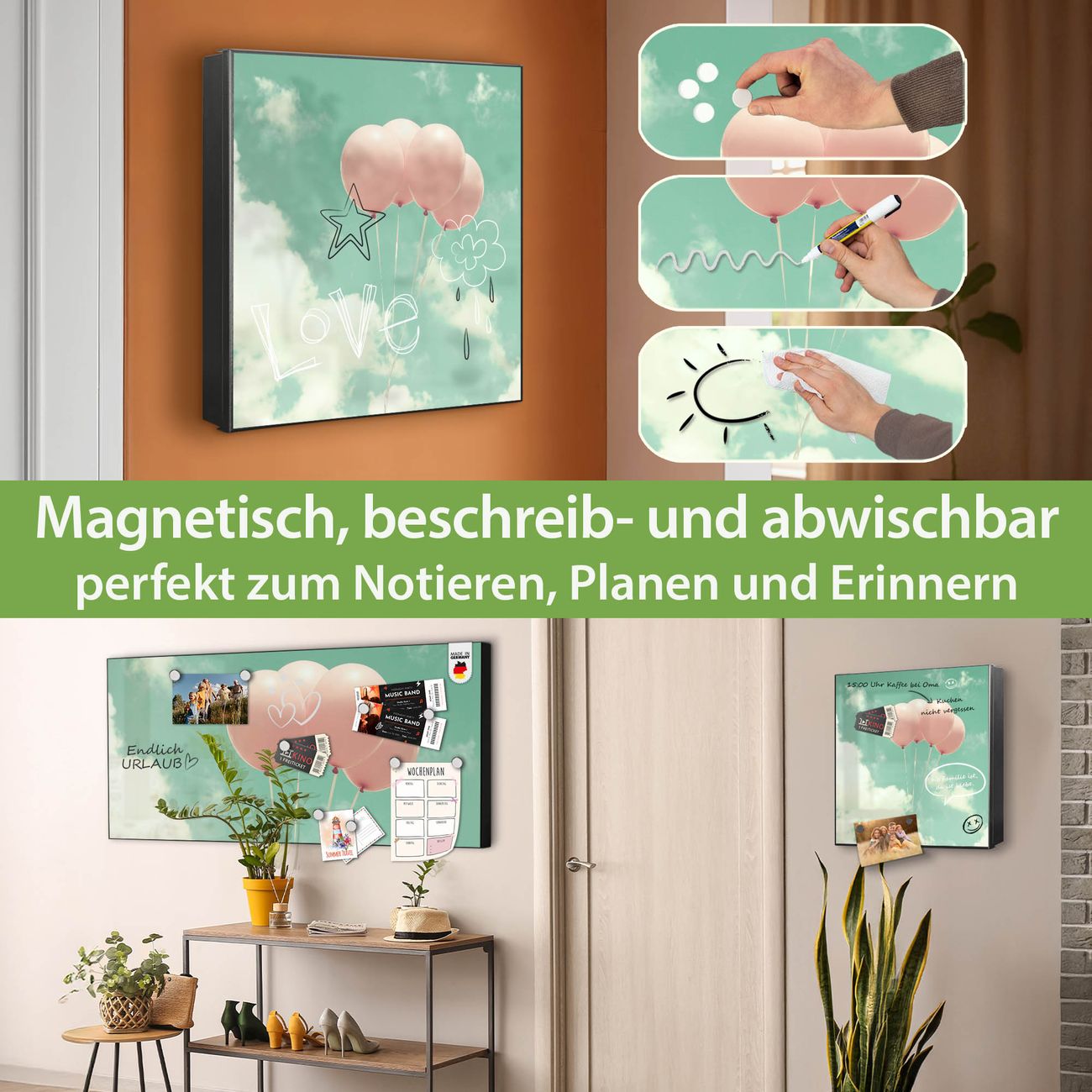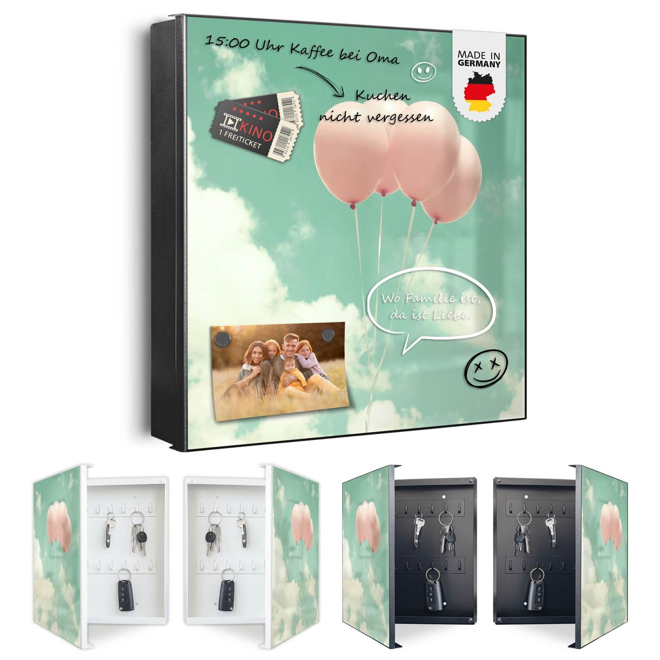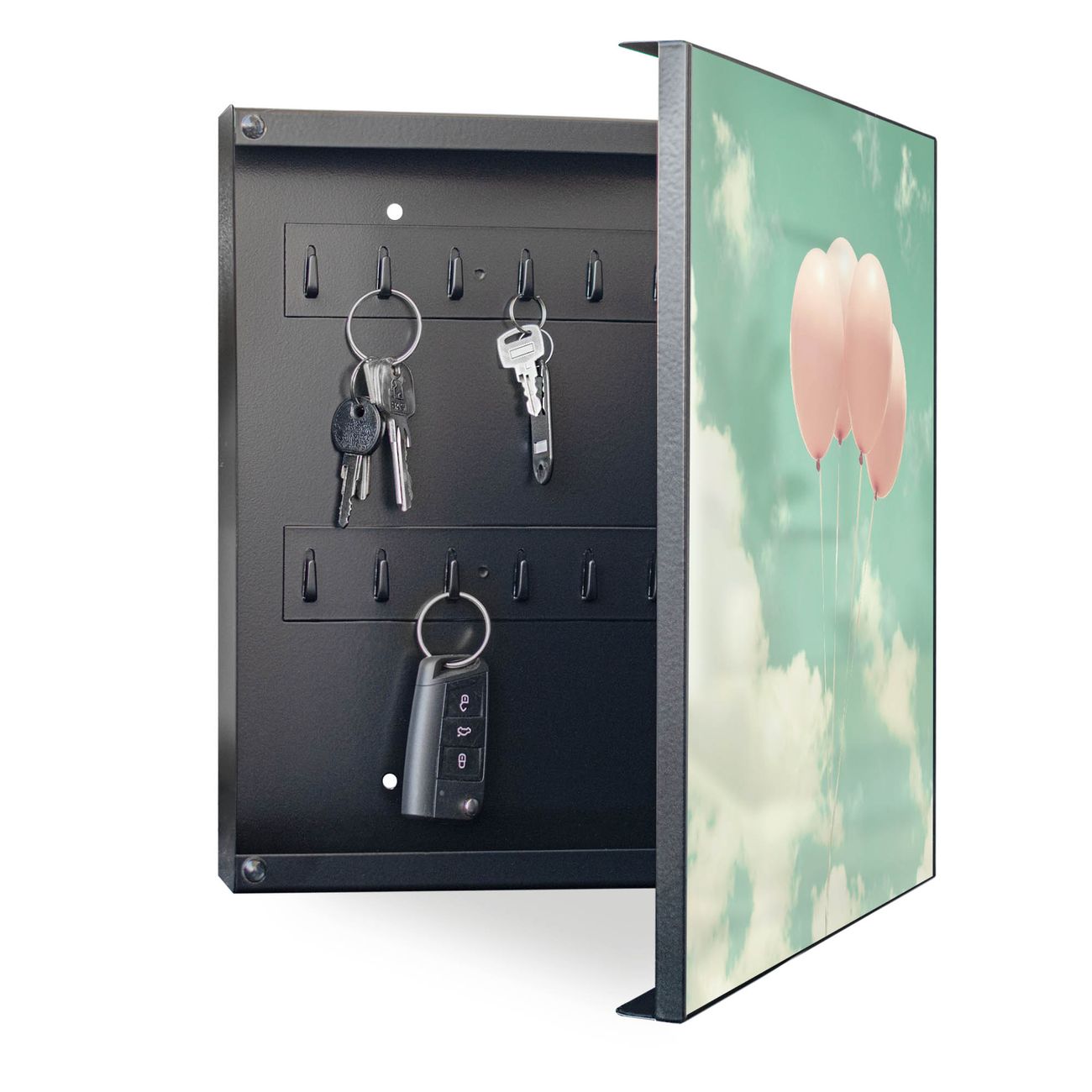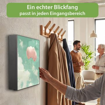 Bringe Ordnung und Eleganz in deinen Eingangsbereich mit dem banjado Schlüsselkasten Motiv Motiv Rosa Ballons. Die moderne Schlüsselbox kombiniert funktionales Design mit hochwertiger Verarbeitung und wird so zu einem echten Hingucker in Flur, Büro oder Ferienwohnung. ✅ Stilvolle Schlüsselaufbewahrung mit Motiv Motiv Rosa Ballons Der Design-Schlüsselkasten Motiv Motiv Rosa Ballons bietet Platz für bis zu 32 Schlüssel, die auf 4 stabilen Reihen mit je 8 Haken übersichtlich verstaut werden. Mit seinen kompakten Maßen von 30 x 30 x 5 cm passt die Schlüsselbox perfekt auch in kleinere Räume. Der schwarz lackierte Stahlkorpus mit rechts angeschlagenem Türscharnier harmoniert mit gedruckten Folie auf der Front und fügt sich nahtlos in jedes Wohnambiente ein. Ob als Schlüsselorganizer für Zuhause oder als praktische Lösung für Büros, Praxen und Gewerbe, der banjado Schlüsselkasten sorgt für Ordnung und Übersicht. Dank der magnetischen, mit Kreidestiften beschreibbaren Folie auf der Front kannst du Notizen anheften oder Termine direkt auf der Oberfläche festhalten. Die Schlüsselbox Motiv Motiv Rosa Ballons zur Wandmontage wird inklusive Befestigungsmaterial geliefert und ist schnell angebracht. So hast du deine Schlüssel jederzeit griffbereit und zugleich stilvoll verstaut. Mit diesem banjado Schlüsselkasten Motiv Motiv Rosa Ballons kombinierst du praktische Aufbewahrung mit stilvollem Wohndesign. Ob privat oder geschäftlich, die Schlüsselbox sorgt für mehr Ordnung, Übersicht und ein wohnliches Ambiente.Vorteile im Überblick