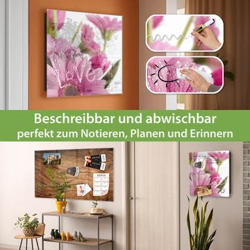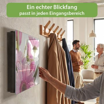 Bringe Ordnung und Eleganz in deinen Eingangsbereich mit dem banjado Schlüsselkasten Motiv Motiv Rosa Gerbera. Die moderne Schlüsselbox kombiniert funktionales Design mit hochwertiger Verarbeitung und wird so zu einem echten Hingucker in Flur, Büro oder Ferienwohnung. ✅ Stilvolle Schlüsselaufbewahrung mit Glasfront im Motiv Motiv Rosa Gerbera Der Design-Schlüsselkasten Motiv Motiv Rosa Gerbera bietet Platz für bis zu 50 Schlüssel, die auf 5 stabilen Reihen mit je 10 Haken übersichtlich verstaut werden. Mit seinen kompakten Maßen von 30 x 30 x 5 cm passt die Schlüsselbox perfekt auch in kleinere Räume. Der schwarz lackierte Stahlkorpus mit rechts angeschlagenem Türscharnier harmoniert mit der Glasfront und fügt sich nahtlos in jedes Wohnambiente ein. Ob als Schlüsselorganizer für Zuhause oder als praktische Lösung für Büros, Praxen und Gewerbe, der banjado Schlüsselkasten sorgt für Ordnung und Übersicht. Dank der magnetischen, mit Kreidestiften beschreibbaren Glasfront kannst du Notizen anheften oder Termine direkt auf der Oberfläche festhalten. Die Schlüsselbox Motiv Motiv Rosa Gerbera zur Wandmontage wird inklusive Befestigungsmaterial geliefert und ist schnell angebracht. So hast du deine Schlüssel jederzeit griffbereit und zugleich stilvoll verstaut. Mit diesem banjado Schlüsselkasten Motiv Motiv Rosa Gerbera kombinierst du praktische Aufbewahrung mit stilvollem Wohndesign. Ob privat oder geschäftlich, die Schlüsselbox sorgt für mehr Ordnung, Übersicht und ein wohnliches Ambiente.Vorteile im Überblick